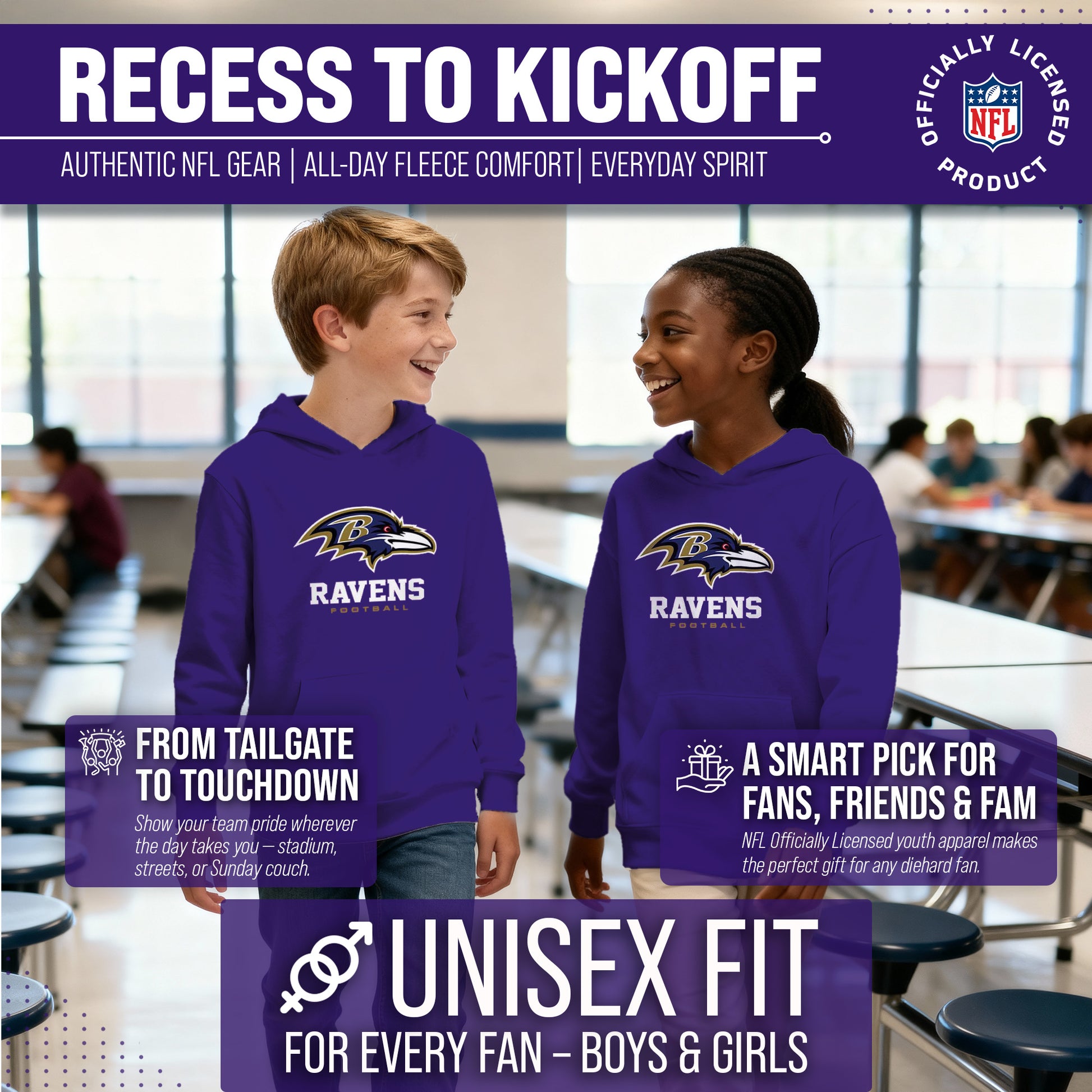 Baltimore Ravens Youth NFL Ultimate Fan Logo Fleece Hooded Sweatshirt -Tagless Football Pullover For Kids - Purple