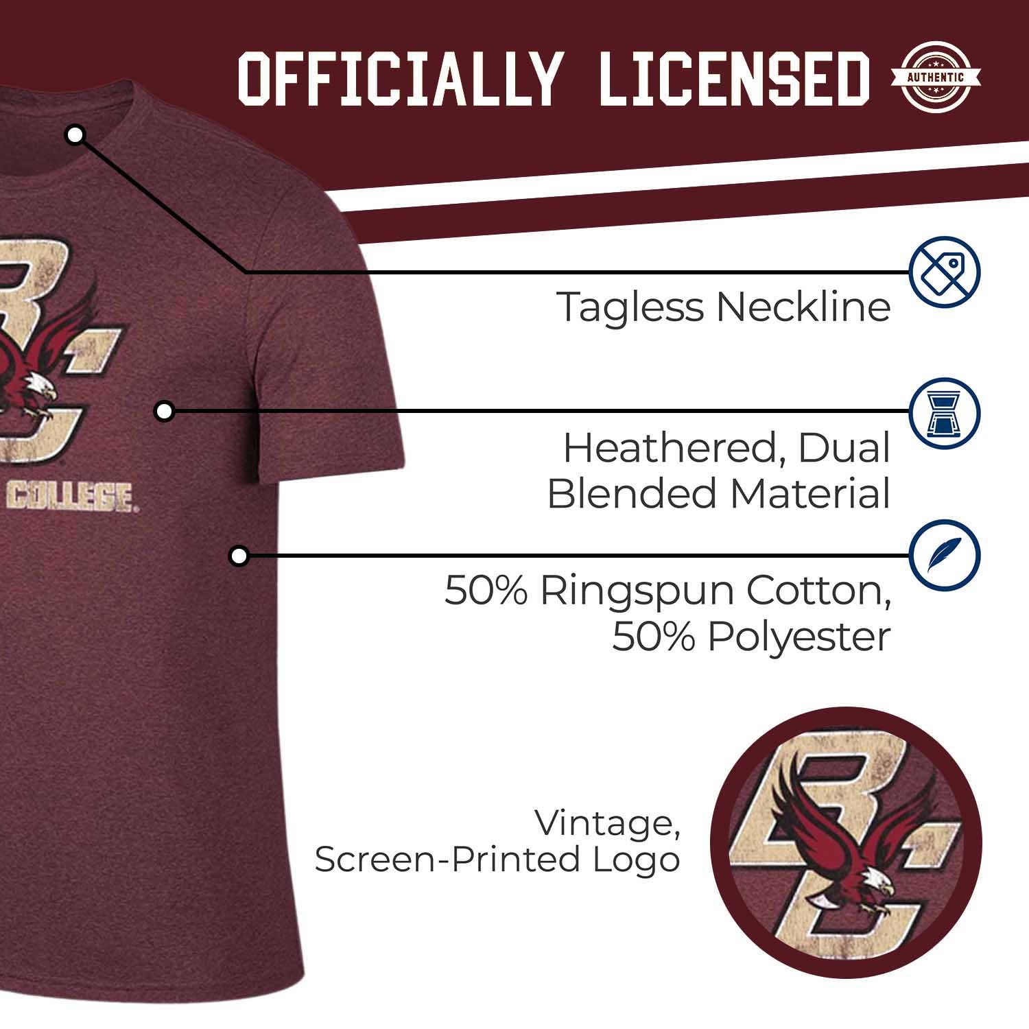 Support your Eagles through another successful season while sporting this must-have shirt! Your dedication will be on full display when you wear the Boston College Eagles NCAA Adult MVP Heathered Logo T-Shirt! This heathered t-shirt features official team colors as well as your favorite team name and logo! The screen printed graphics are displayed in a vintage style that gives you the look of a loyal and seasoned fan. Made from a dual blend of ringspun cotton and polyester, this super soft shirt will have you staying comfortable all day long! Wear it at the next tailgate or big game, or even while you watch your team win from home! Perfect for yourself or that next birthday, Christmas, or graduation gift you need to find! Never let your Eagles fandom be questioned again, get this shirt today!