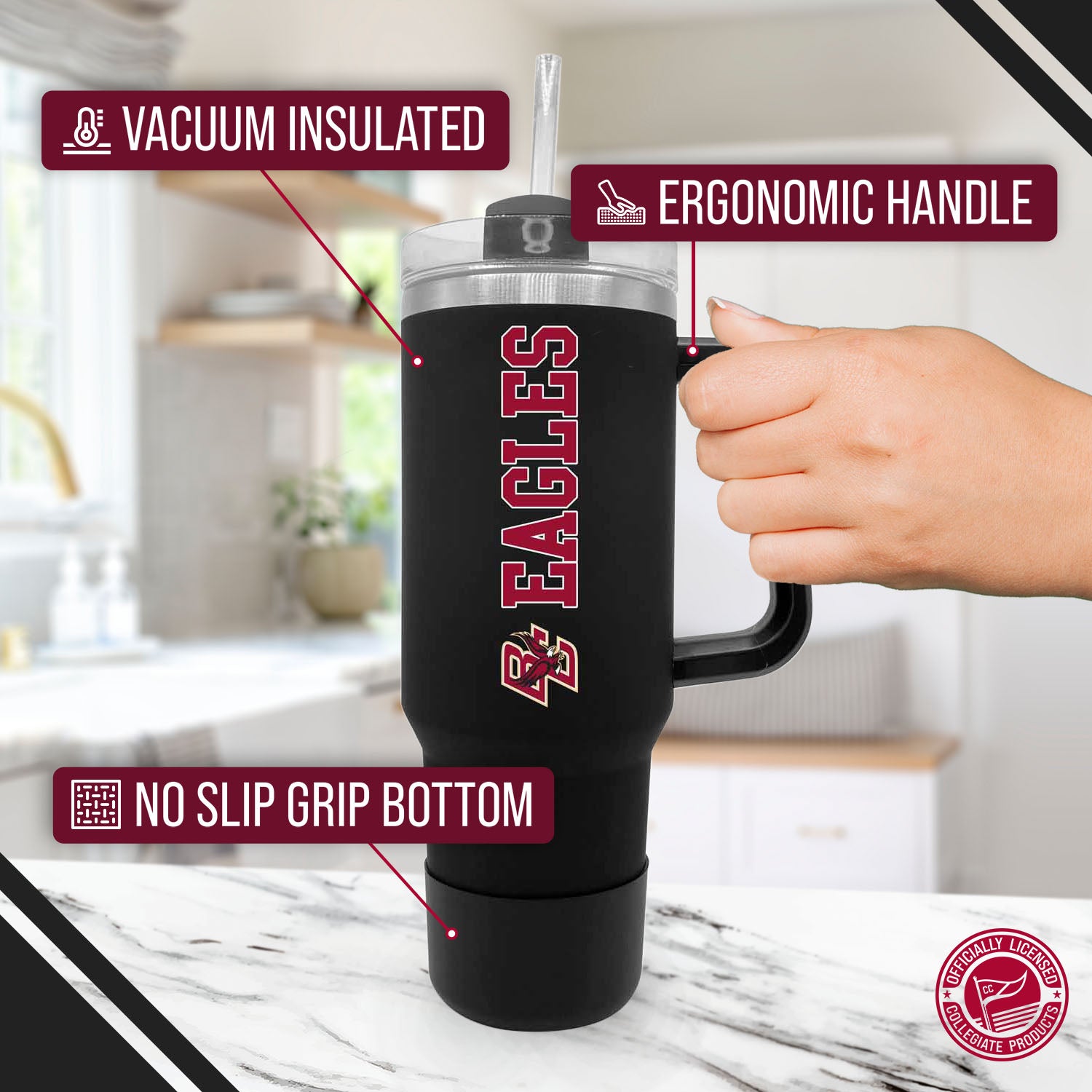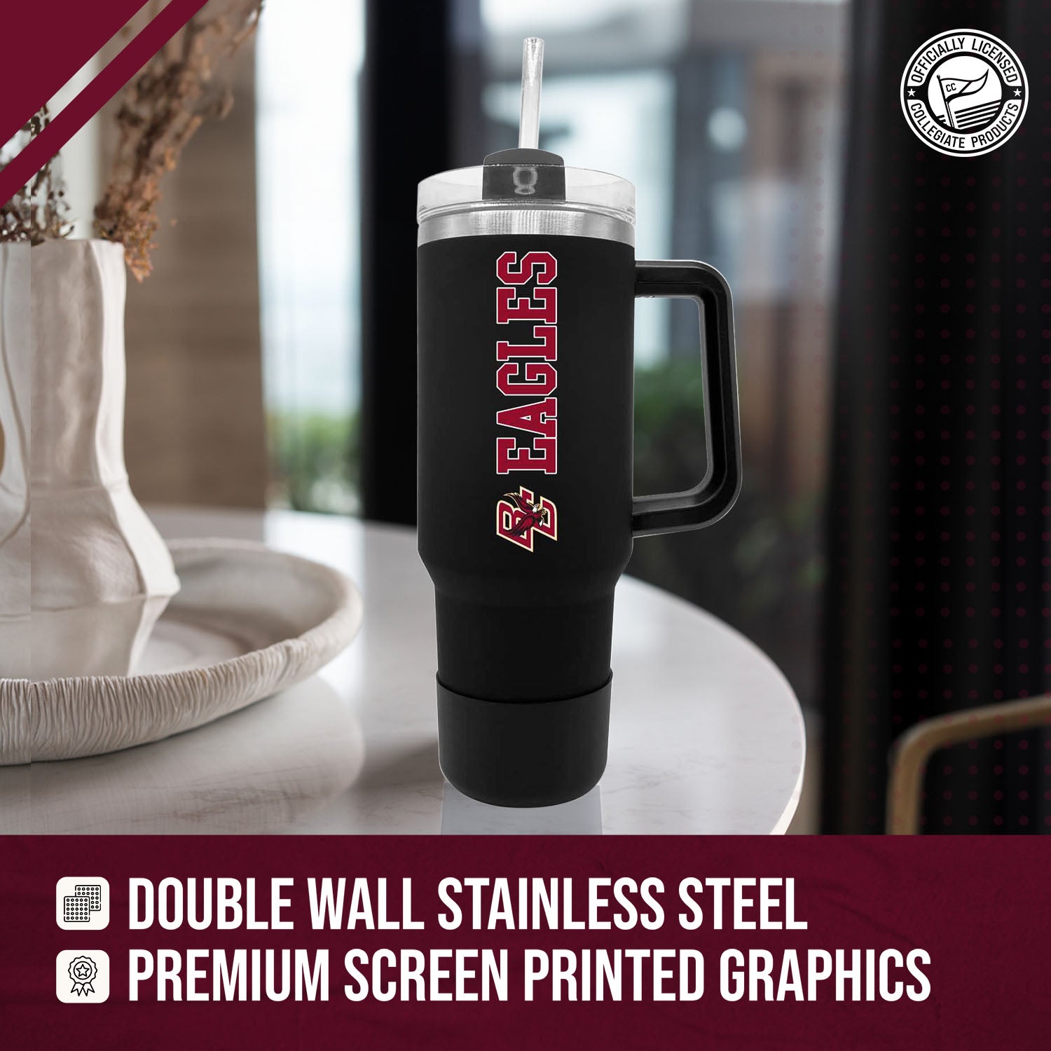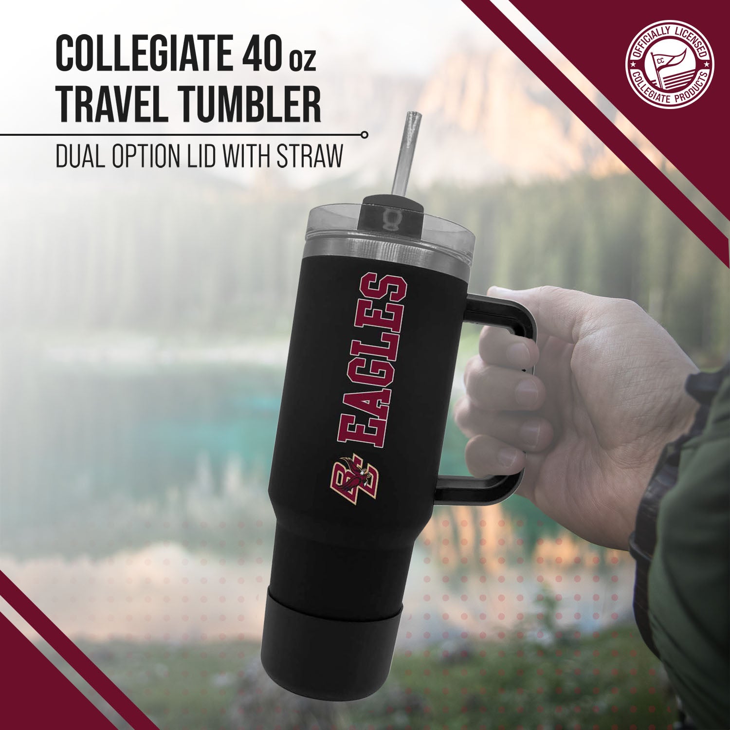 Our stainless steel 40 oz tumblers with handle and straw are designed for constant use in any type of setting! At a sports game? These insulated tumblers are compact and can fit in most cup holders and even feature a no slip grip on the bottom to keep condensation away! On the move? Our contoured spout or straw options makes it easy to sip on the go! No matter the setting, show your school pride while properly and efficiently preserving the desired temperature of your beverage! This Boston College Eagles travel tumbler also makes a great gift! Combine the 40 oz Boston College tumbler with a Boston College pillow or a Boston College blanket and give a whole haul of Eagles gear to your favorite alumni! All of our products feature the officially licensed team colors, logos and lettering. We don't skimp on quality in any way. The colors are always vibrant and the graphics are always accurate and brimming with team spirit.