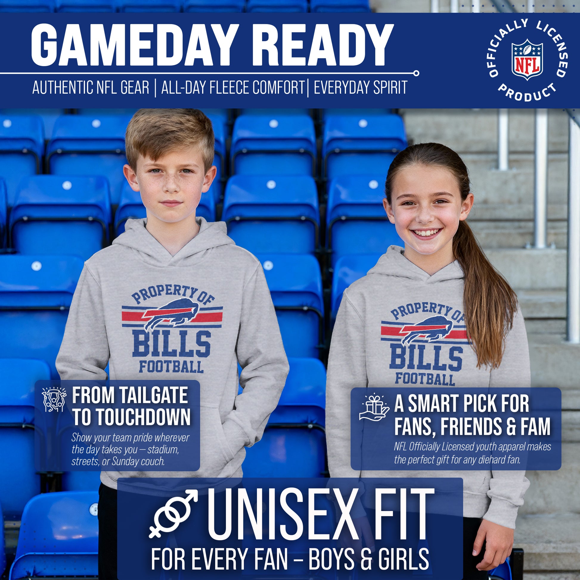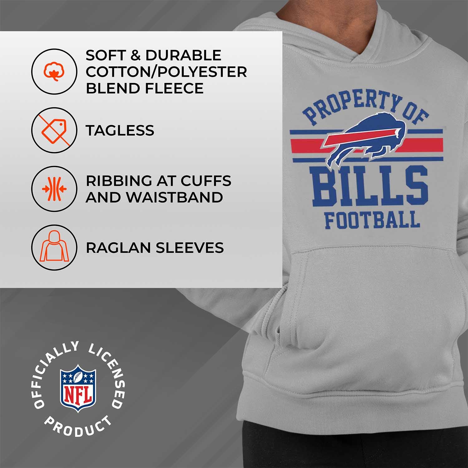 Our Property of Buffalo Bills youth hooded sweatshirt is a pro football hoodie with 52% cotton and 48% polyester blended lining that features official Property of graphics. Our hoodies for boys and girls are super comfortable, run true to size, and are great for showing your Buffalo pride all year long. The tagless Bills hooded sweatshirt is perfect for school, gamedays, and showing off your team spirit. Our pullover hoodies are ideal Buffalo gifts for boys and girls football fans and the unisex fit makes them ideal for both boys and girls. The Buffalo hoodie is essential kids apparel for protecting yourself from the elements. The blended material, ribbed cuffs, and waistband keep all the warmth in, so there's no need for a jacket in the fall months, our hoodie sweatshirts have you covered. These comfortable hoodies feature the official Buffalo Bills colors and graphics. The graphics will stay crisp and wear after wear and year after year. This youth pro football sweatshirt is designed for comfort and features ribbed cuffs and waistband, and a spacious front pouch pocket. Show your team pride with this Property of Bills youth sweatshirt! This hoodie is made from a dual blend of cotton poly blend that is ideal for that tailgate or gameday when the temperature drops. The football sweatshirts for girls and boys help you gear up and get ready to cheer the Buffalo Bills to victory.