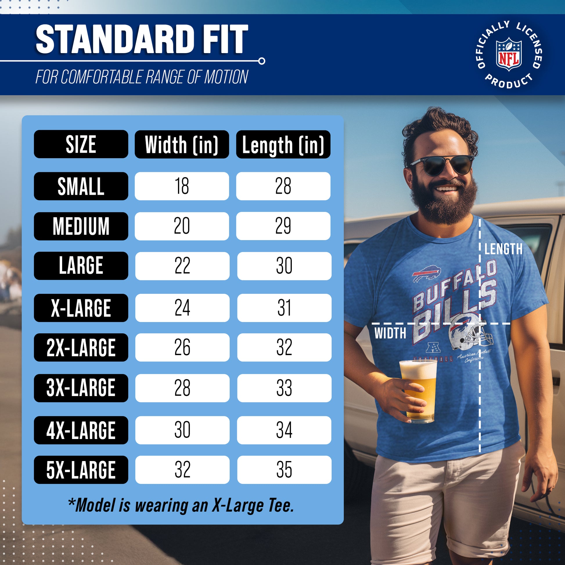 Show off your team spirit in style with our Team Fan Apparel Buffalo Bills NFL Distressed Helmet Tag-Less T-Shirt! Made for both men and women, this unisex t-shirt is the perfect addition to any football fan's wardrobe. With its soft and comfortable cotton blend fabric, you'll love wearing it to games or just lounging at home. The tag-less design ensures maximum comfort without any annoying tags scratching at your neck. Featuring a large vibrant helmet design with the team name printed largely, along with the official team logo, this shirt will make you stand out from the crowd and show off your die-hard fandom. It comes in multiple sizes, so you can choose the one that fits best & represents your team spirit. Whether you're cheering on your Bills at the stadium or watching from home, our NFL Distressed Helmet Tag-Less T-Shirt is a must-have for all fans! So grab yours today and support your team in comfort and style. Go team!