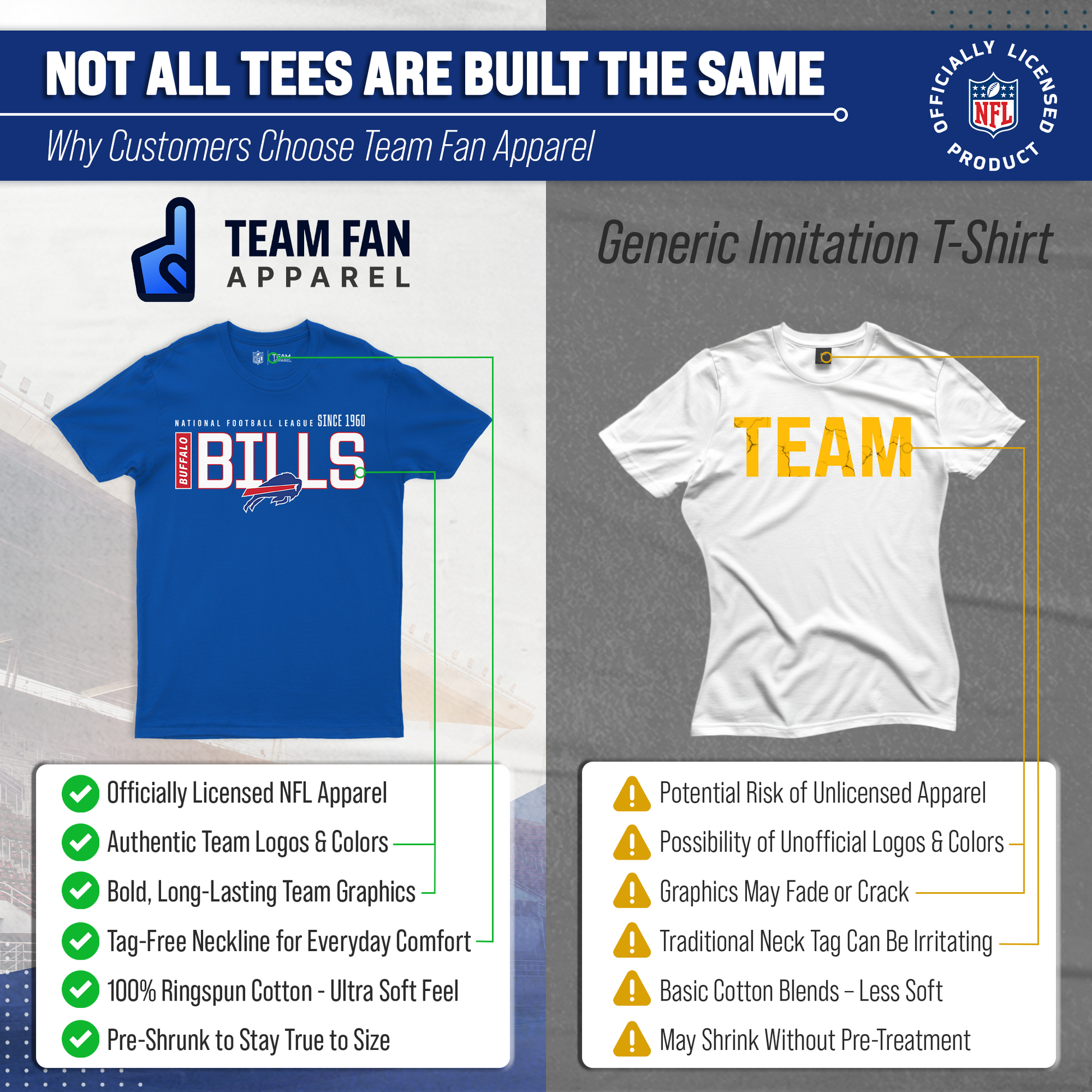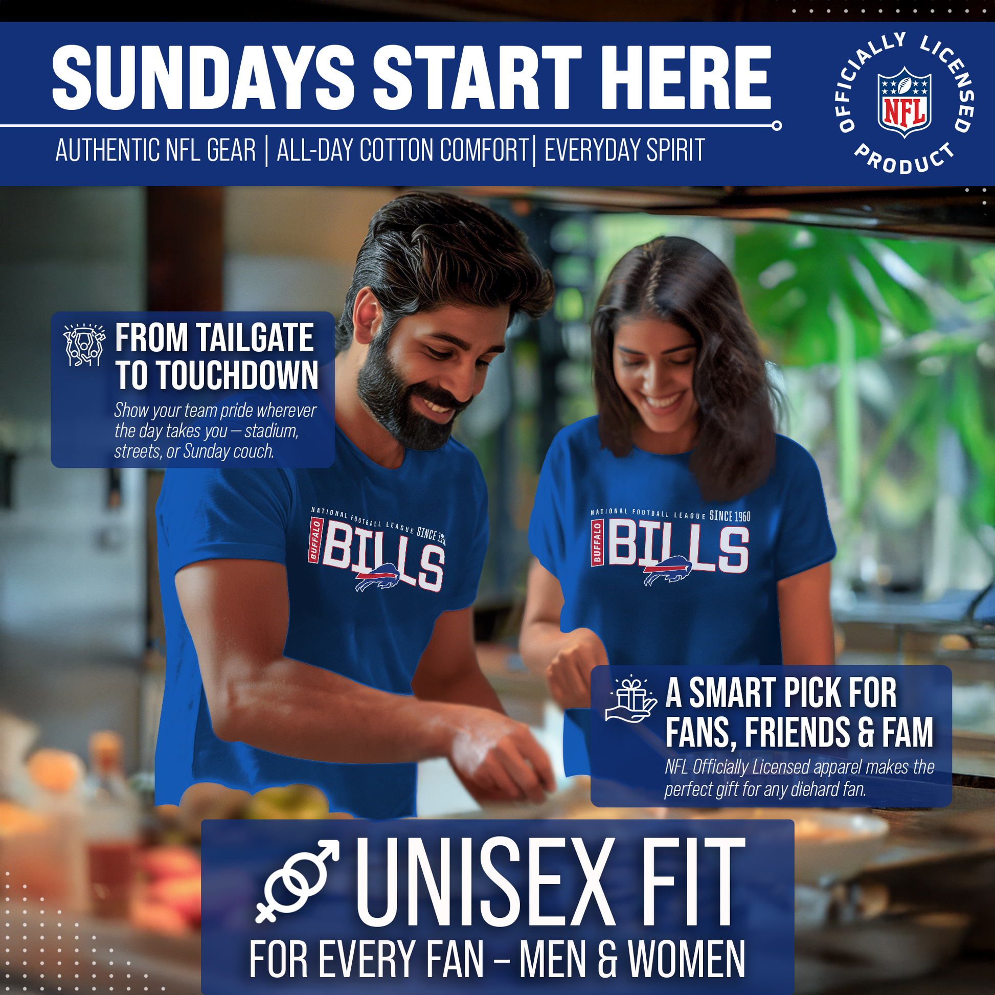 Show off your team pride in style with the officially licensed Team Fan Apparel Buffalo Bills NFL Modern Endzone Tag-Less T-Shirt! Designed for both men and women, this versatile unisex tee is the ultimate staple for every football fan’s wardrobe. Whether you’re heading to the stadium, joining friends at a tailgate, or relaxing at home on game day, this Bills shirt is built for all-day comfort and effortless style. Crafted from soft, breathable cotton, this shirt ensures a lightweight and comfortable fit that you’ll want to wear again and again. The tag-less neckline eliminates irritation, so you can cheer on the Buffalo Bills distraction-free. With its modern endzone graphic design, bold team logo, and the year the Bills were founded, this shirt highlights your loyalty and sets you apart as a true die-hard fan. Available in a wide range of sizes, this Buffalo Bills NFL T-shirt is designed to deliver a flattering and comfortable fit for every fan. Pair it with jeans for a casual everyday look, or layer it with your favorite hoodie or jacket when temperatures drop. It’s the perfect way to represent the Bills season after season, no matter where you’re watching the action unfold. Looking for the ultimate gift for a fellow football fan? This Modern Endzone T-shirt is a must-have piece of officially licensed Buffalo Bills apparel. From birthdays to holidays—or just because—it’s an easy win for any Bills supporter who wants to show their pride in comfort and style. Celebrate your passion for the game and your team history with the Buffalo Bills NFL Modern Endzone Tag-Less T-Shirt. Comfortable, stylish, and packed with team spirit, this tee makes it clear who you’re cheering for every time you wear it. Don’t miss out—grab yours today and rep the Bills with pride all season long!
