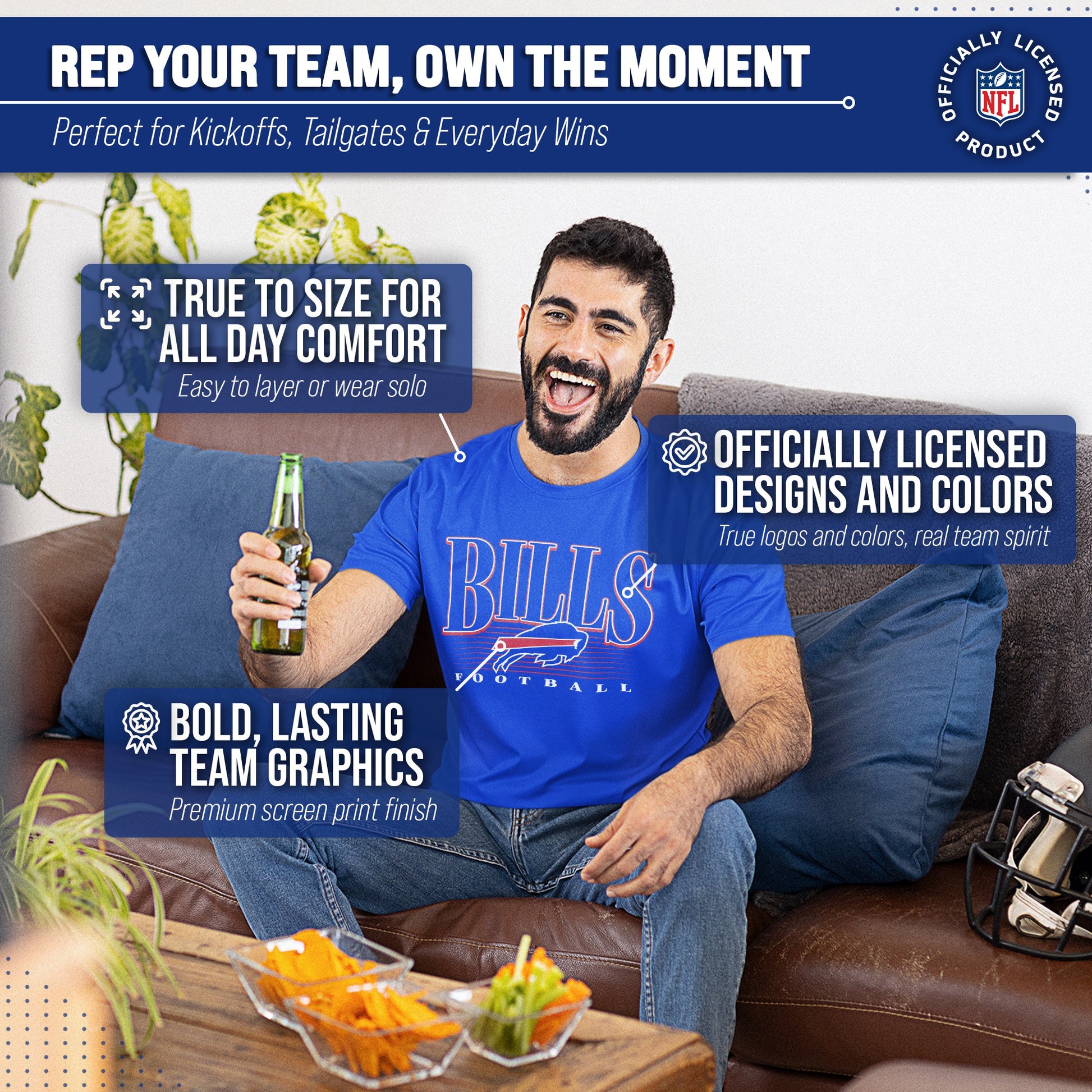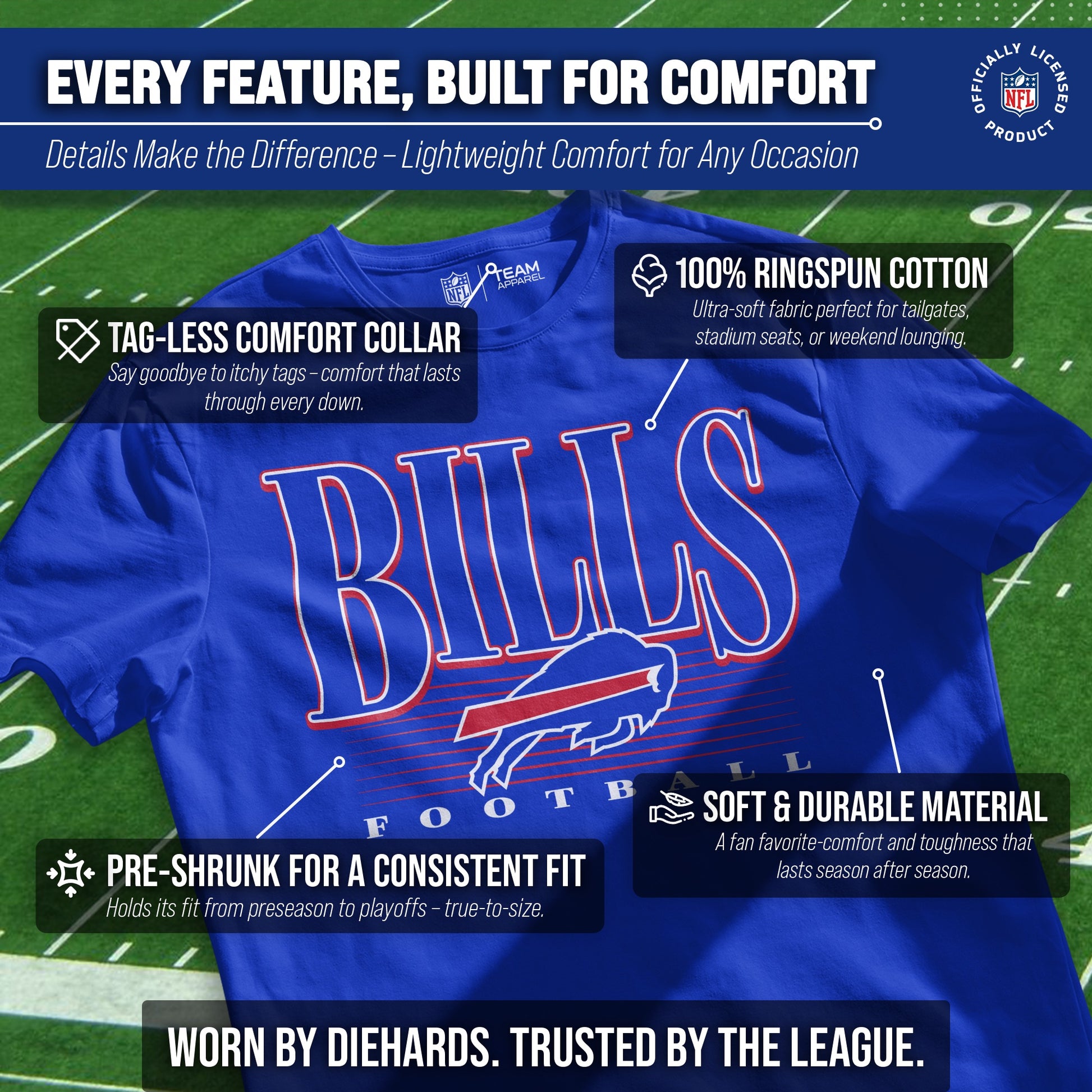 Show off your team spirit in style with our Team Fan Apparel Buffalo Bills NFL Overtime Blueprint Tag-Less T-Shirt! Made for both men and women, this unisex t-shirt is the perfect addition to any football fan's wardrobe. With its soft and comfortable cotton blend fabric, you'll love wearing it to games or just lounging at home. The tag-less design ensures maximum comfort without any annoying tags scratching at your neck. Featuring a colorful logo with outlined text of your favorite team, this shirt will make you stand out from the crowd and show off your die-hard fandom. It comes in multiple sizes, so you can choose the one that fits best & represents your team spirit. Whether you're cheering on your Bills at the stadium or watching from home, our NFL Overtime Blueprint Tag-Less T-Shirt is a must-have for all fans! So grab yours today and support your team in comfort and style. Go team!