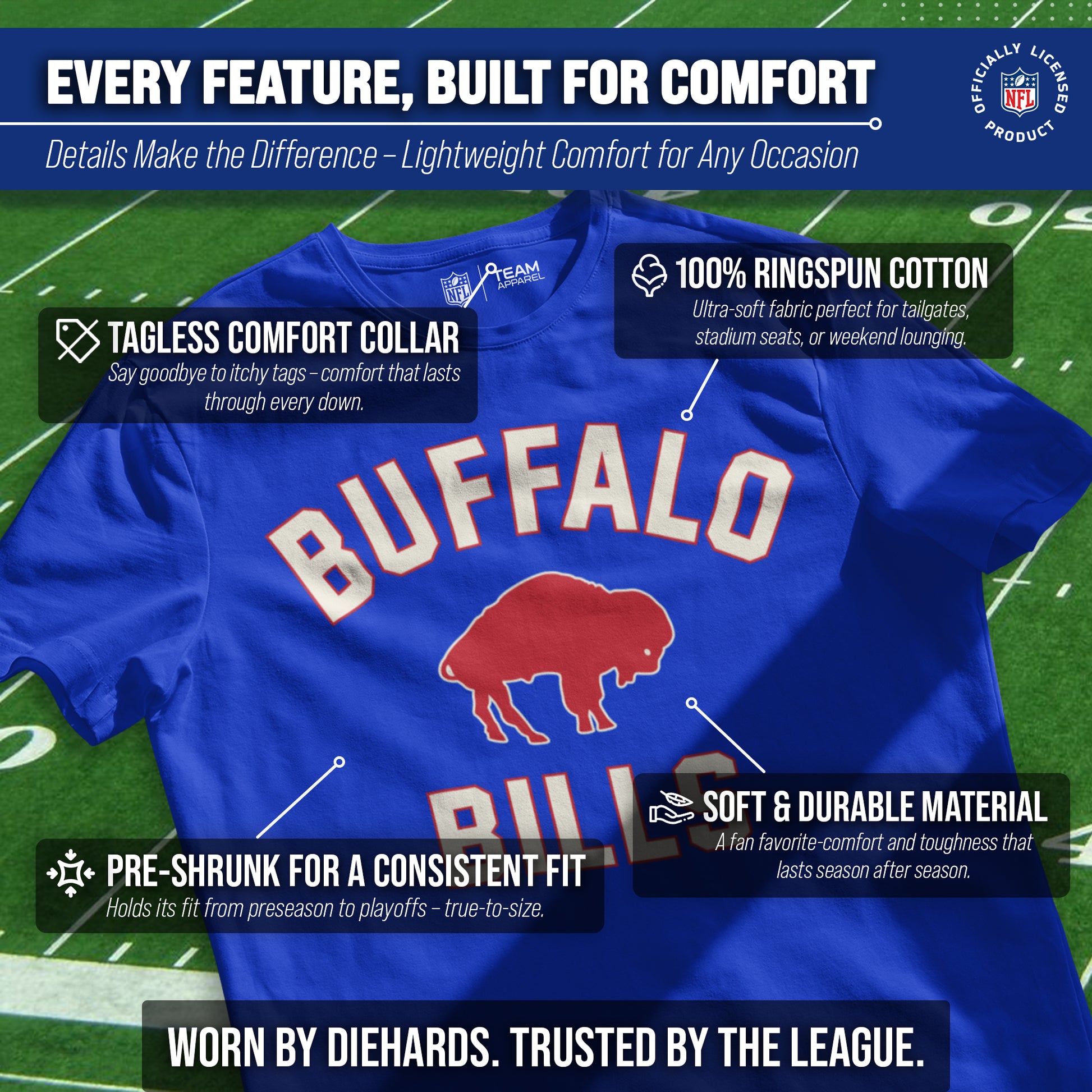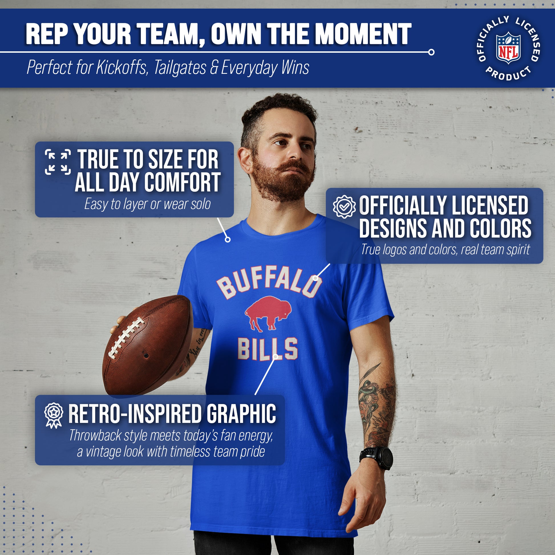 Show off Your Team Spirit with the Comfortable and Stylish Buffalo Bills NFL Adult Retro Gameday T-Shirt! Support your favorite football team in style and comfort with this officially licensed Bills t-shirt. Made from a soft and breathable ring-spun cotton, this shirt is perfect for game day or everyday wear. The tag-less design eliminates any annoying tags that can cause discomfort, making it even more comfortable to wear. Featuring a retro gameday design, this unisex t-shirt is suitable for both men and women. The short sleeve style is perfect for warmer weather or layering under a jacket during colder months. Whether you're cheering on your team at the stadium or watching the game from home, this t-shirt is the ultimate fan apparel. So go ahead and show off your Bills team pride with the NFL Adult Retro Gameday T-Shirt - because nothing beats comfortable, stylish, and officially licensed fan gear!