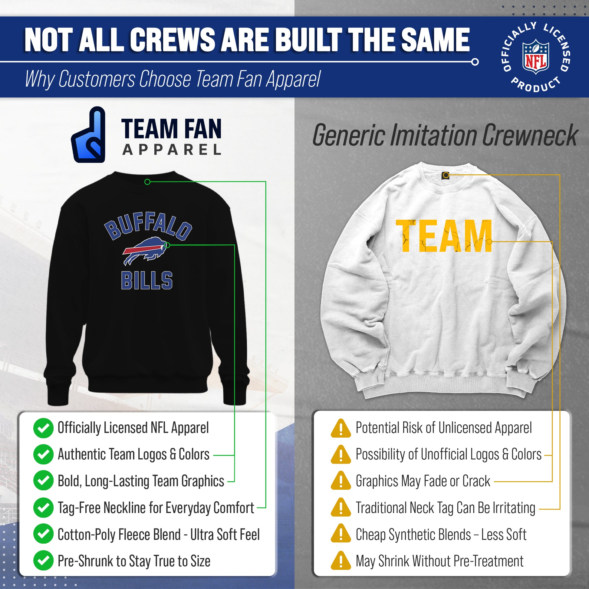 This adult Gameday Buffalo Bills football crewneck is the ideal sweatshirt to wear on gameday. Our crewneck sweatshirt is comfortable, runs true to size, and is great for showing team pride all year long! This is the perfect Buffalo sweatshirt for both men and women. Our Buffalo Bills team colored crewneck sweatshirts are the perfect fan apparel for tailgates and sports games. The lightweight crewneck pullover is made of air jet yarn for a softer feel and reduced pilling, which means your crewneck sweatshirt will look new for years to come. You don't have to worry about the Buffalo graphics fading on your crewneck, either. The pullovers are made with thermal printed graphics that are high definition, true team color, and resist fading! This Buffalo sweatshirt is ideal for warm or cold weather, which means you can wear it not only all football season, but all year long! Our pro football crewneck sweatshirt features 1x1 rib with spandex for enhanced stretch and recovery. This Buffalo crewneck sweatshirt has double-needle stitching at shoulders, armholes, neck, waistband, and cuffs. Our comfortable crewneck pullover is made from a cotton poly fleece blend. This tagless sweatshirt ensures the most comfortable fit for men and women. The classic fit of this sweatshirt makes this Buffalo Bills crewneck that perfect pullover for Buffalo men and women fans. Our pro Buffalo Bills pullover sweatshirts for men and women make the best Buffalo gift. Buffalo Bills apparel is the perfect birthday gift for any football fan. This Buffalo Bills football crewneck sweatshirt is perfect for tailgating, stadium fun, or watching the game at home.