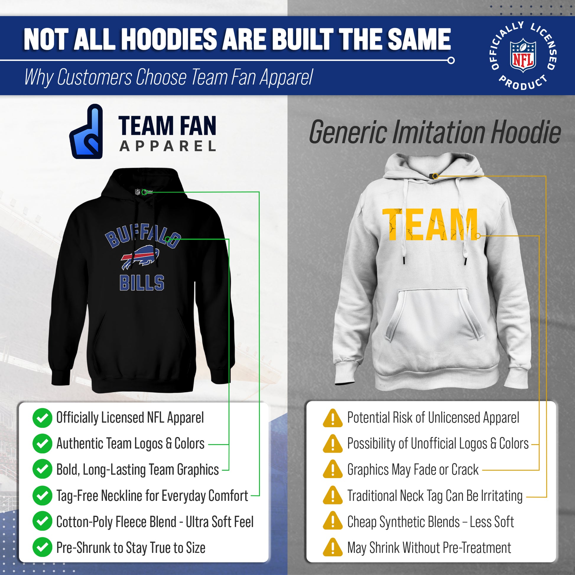 Our Adult Gameday Buffalo Bills football pullover hoodie with a front pouch pocket is the ideal sweatshirt to wear on gameday. This Buffalo hoodie is comfortable and great for showing team pride all year long. This is an essential piece of womens and mens football apparel for pro football fans. Our Buffalo Bills team colored hoodie sweatshirts are the perfect fan apparel for tailgates and sports games. This hooded sweatshirt pullover with a pocket and drawstrings is ideal for warm or cold weather games. The football pullover hoodie is made from a cotton poly blend fleece material with cotton face. These pro football sweatshirts have high quality features. Our football pullover hoodies feature 1x1 ribbing at cuffs and waistband. This Bills hoodie sweatshirt has a twill neck tape and jersey lined hood. The metal eyelets on the sweatshirt drawstrings add a sophisticated look to these pro football team hoodies for men and women. This tagless sweatshirt ensures the most comfortable fit for men and women. The standard fit makes our football team hoodies for men and women the perfect sweatshirt for Buffalo fans. The thermal printed graphics are high definition, true team color, and resist fading. Our hoodies also make the best Bills gifts for men and women. Buffalo Bills apparel is the perfect birthday gift for any professional sports fan. Our football team hoodies for men and women are great mens football apparel for tailgating, stadium fun, or watching the game at home.