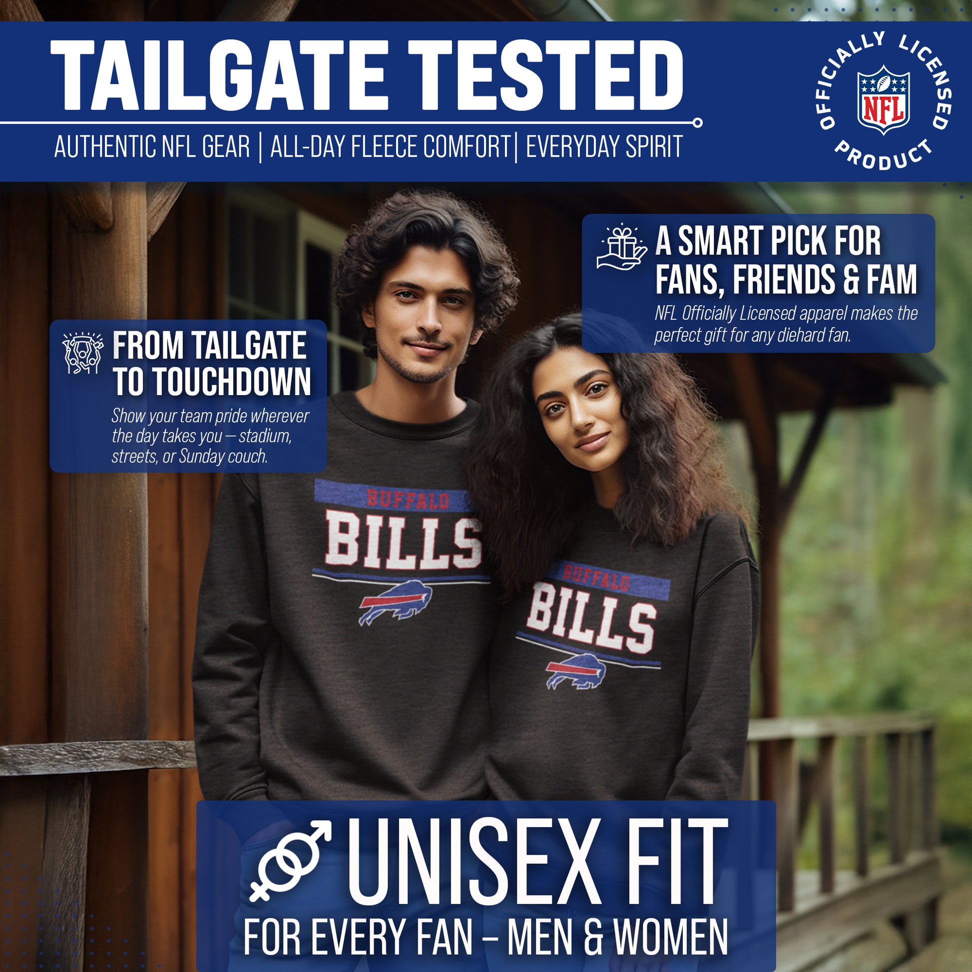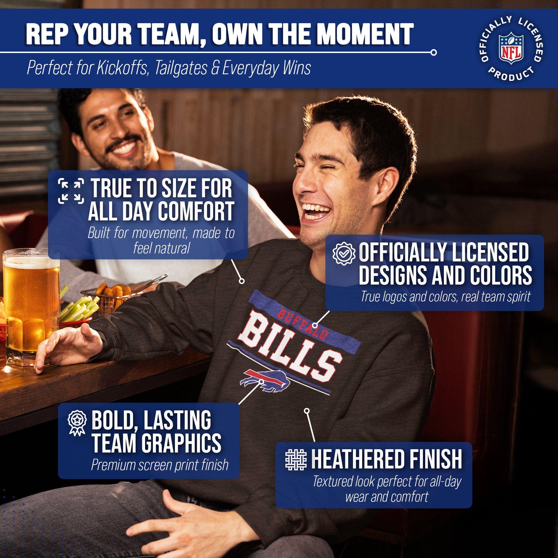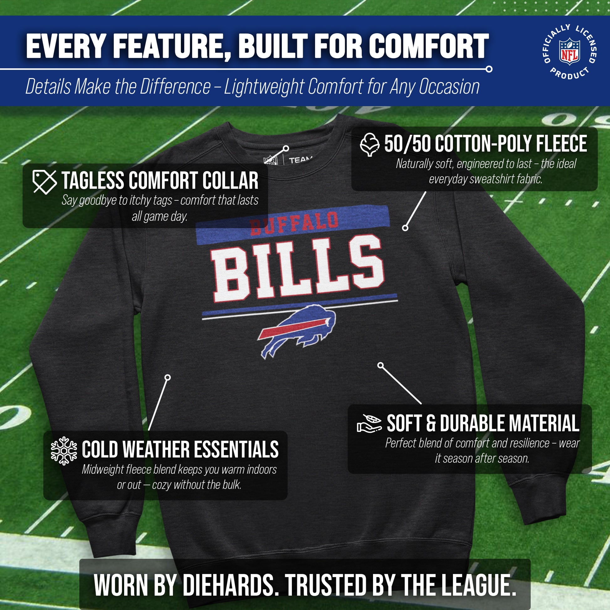Our charcoal crew neck is a Buffalo crewneck sweatshirt with a warm and toasty 9 oz fleece lining. It's the very best of Buffalo Bills apparel, plain and simple. Gear up for your cold weather football game with confidence. Or, for women, bring it with you to games and tie it around your leggings in case the arena is a little chilly. Our football crew neck sweatshirts for men and women are super comfortable, run true to size, and are great for showing your team pride all year long. Plus, the unisex fit is ideal for both men and women and works as an oversized sweatshirt for kids. [Team_long] sweater for men and women features your teems thermal-printed emblem wordmark will stay crisp and clear, wear after wear. All colors and fonts are officially licensed and are of the highest of quality, it even comes with an officially licensed tag. Features: ribbed cuffs and waistband. This football sweatshirts crew in particular is perfect for tailgates, games, and showing off your team spirit. Gameday crewneck [team_ long] sweatshirts make a great birthday, Christmas (or any other holiday), or graduation gift for a sports fan. Gameday charcoal crewneck is essential apparel for protecting yourself and your loved ones from the elements. The fleece material will keep you warm through the colder months, and the pullover design allows you to feel embraced like a big oversized blanket. The Buffalo Bills charcoal crew necks are pre-shrunk and are made from a dual blend of 50% cotton and 50% polyester that is ideal for that tailgate or game day when the temperature drops. Pair with your other favorite Buffalo game day apparel! Say goodbye to cheap sweatshirts. Our charcoal sweatshirts for women and men help you gear up and get ready to cheer your team to victory.