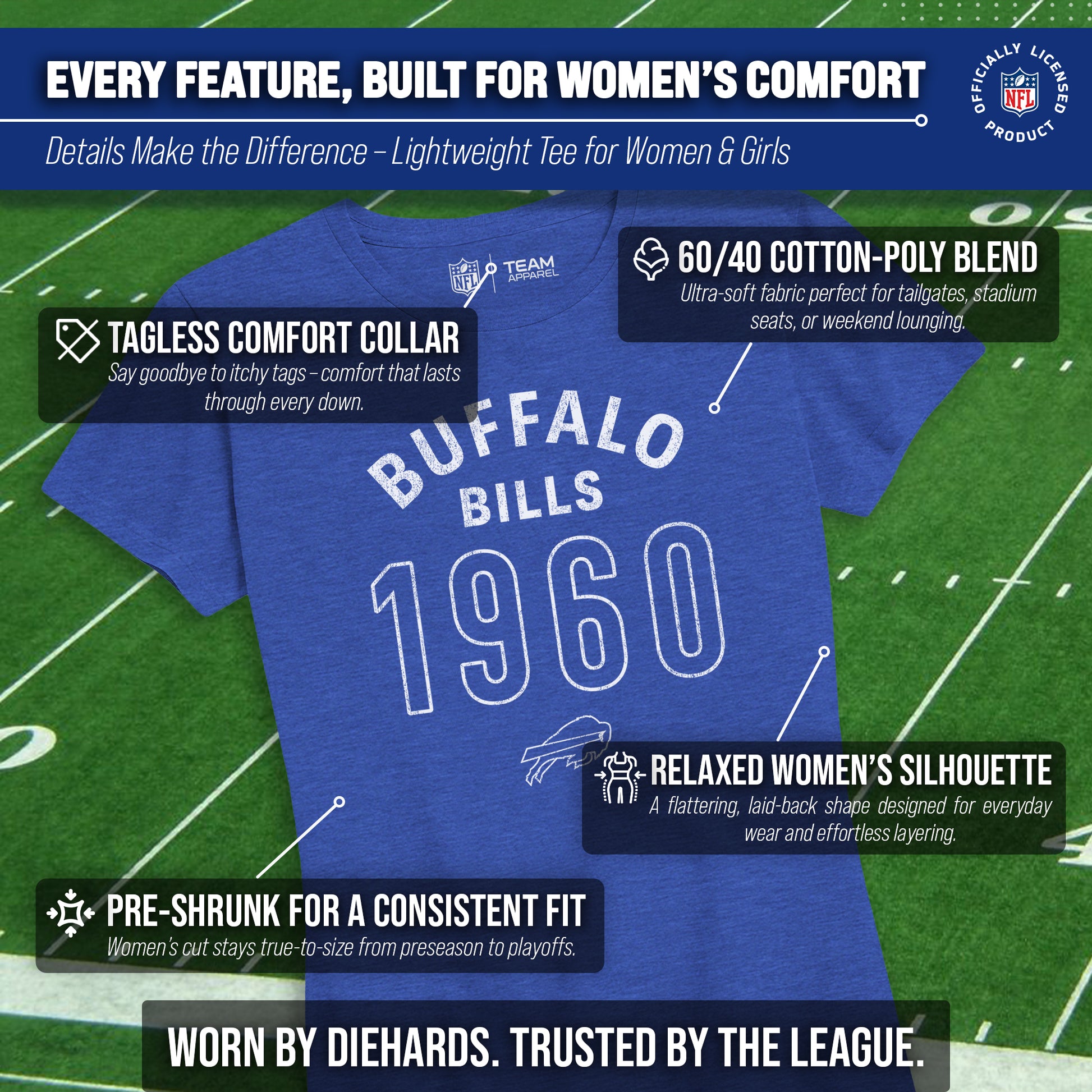 Buffalo Bills NFL Womens Big Date Tag-Less T-Shirt - Royal Heather