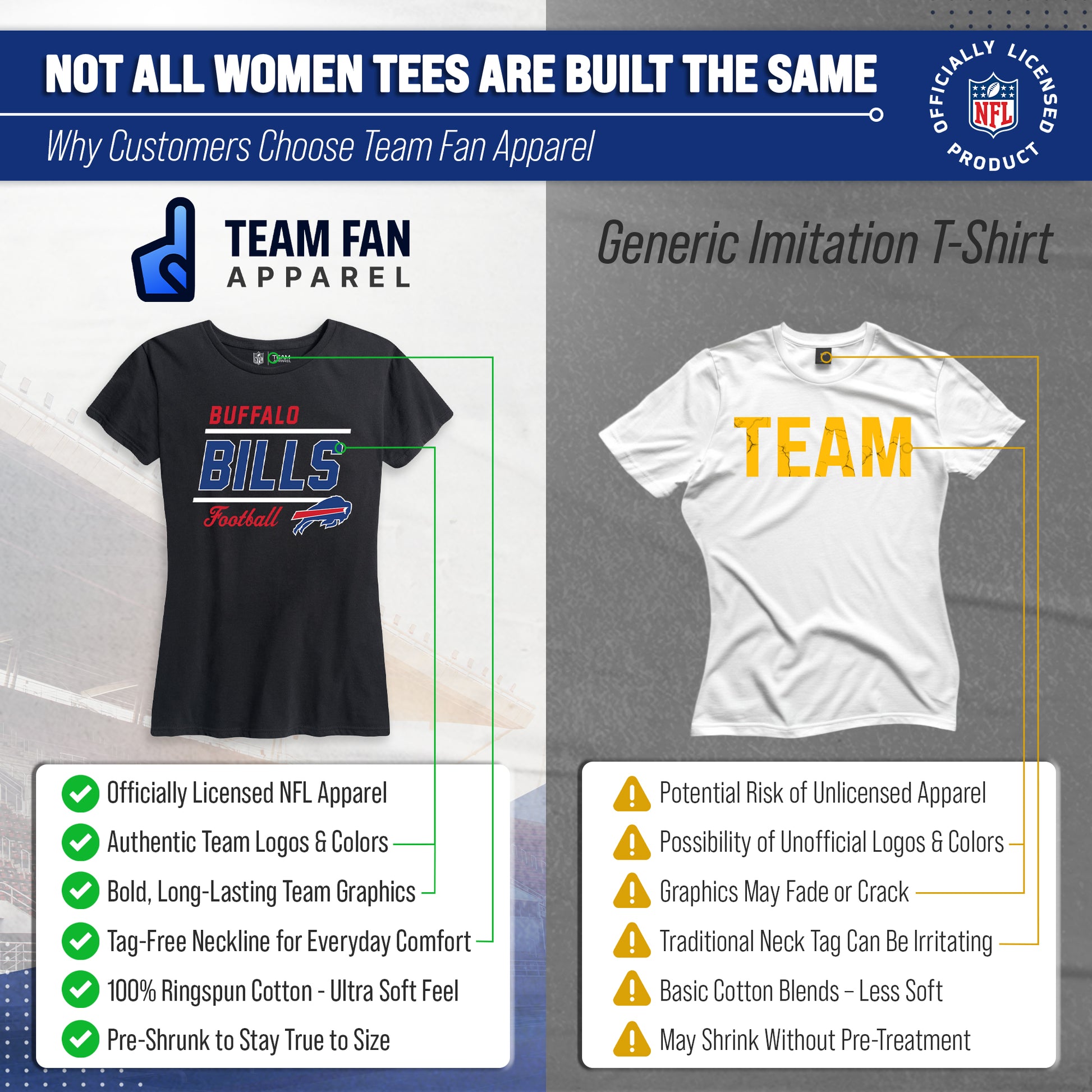 Our officially licensed Bills shirt is super comfortable, runs true to size, and is great for showing off your Buffalo Bills pride. The high-quality thermal printed logo will look fresh after years of wear, making it a great alternative to your womens Buffalo Bills jersey. Our Gameday t-shirt has a relaxed yet contoured fit for a casual yet feminine look. The short sleeve shirt is perfect with shorts for tailgates in warmer months, or with jeans or leggings and a sweater during colder months. Available in plus sizes, our Bills shirts for women plus size or straight size will make anyone feel comfortable enough to show off their love for the Buffalo Bills. If you're looking to give team t shirts for women as a gifts, our Gameday tshirt is the Buffalo shirt women will love. Officially licensed to ensure no counterfeit designs or colors, our Buffalo Bills womens shirts are great for superfans. 100% ringspun and made from a blend of cotton and polyester], designed to keep you cool and comfortable all year long. The womens gameday football t shirt will definitely become one of your favorite tops.