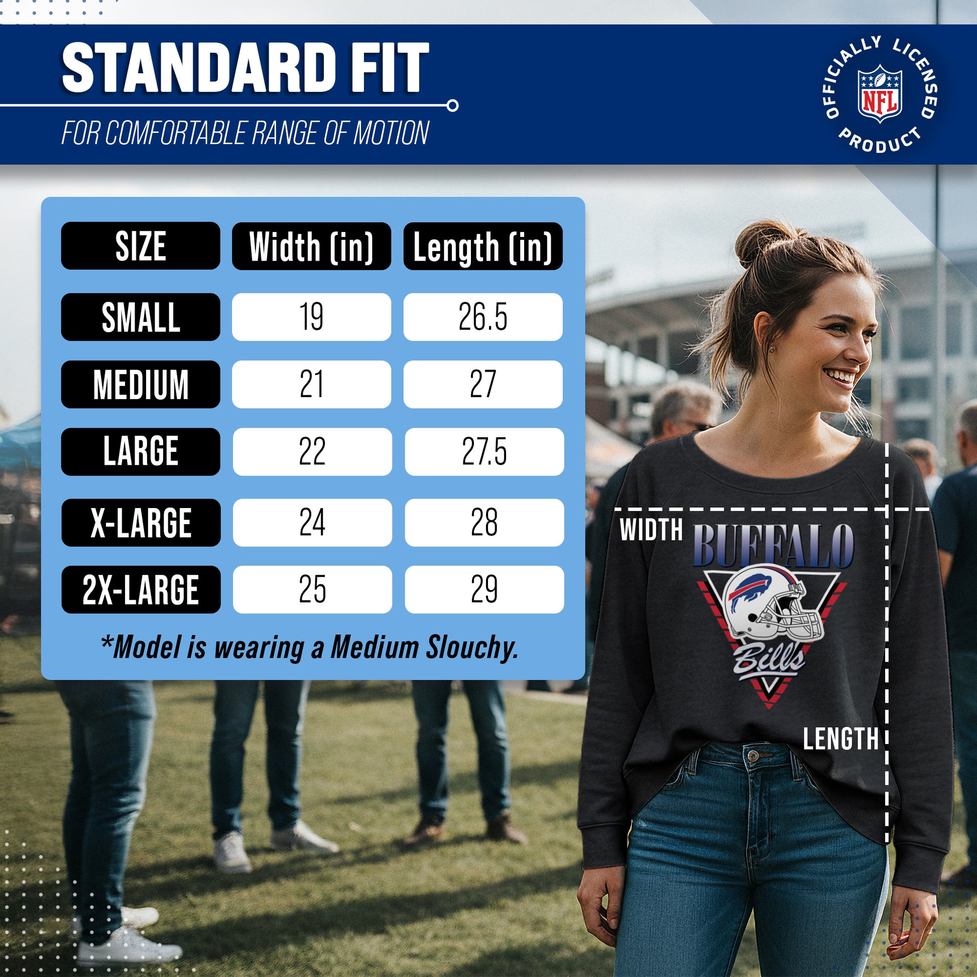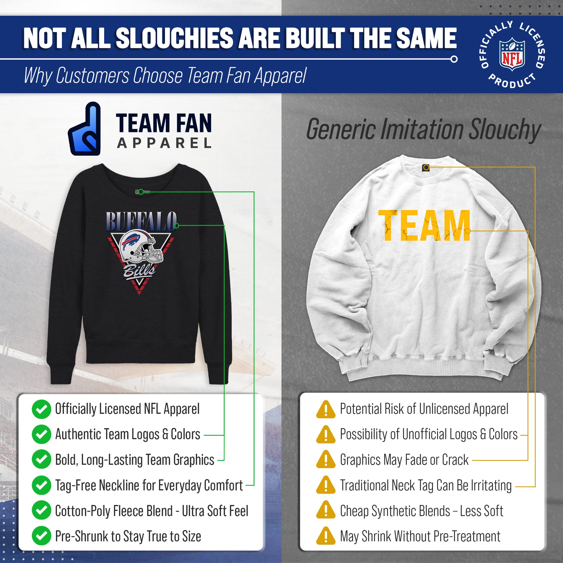 Hey there, fellow lady football fans! Show off your team pride in style with our Team Fan Apparel Buffalo Bills NFL Women's Retro Triangle Slouchy Crewneck Fleece Pullover. Made with extra soft cotton polyester fleece material, this long sleeve pullover sweatshirt will keep you warm and cozy on game day or any chilly day. With a tagless design, you won't have to worry about any annoying tags distracting you from cheering on your team. Featuring a retro triangle design and relaxed fit, this pullover adds a touch of fashion to your game day wardrobe. Available in a range of women's sizes, it's the perfect addition to any fan's closet. Whether you're headed to the stadium or watching from home, stay cool and stylish with this must-have piece of Bills apparel. Don't let snow or cold weather dampen your team spirit - grab one for yourself or as a gift for the ultimate football-loving lady in your life! Go Bills!