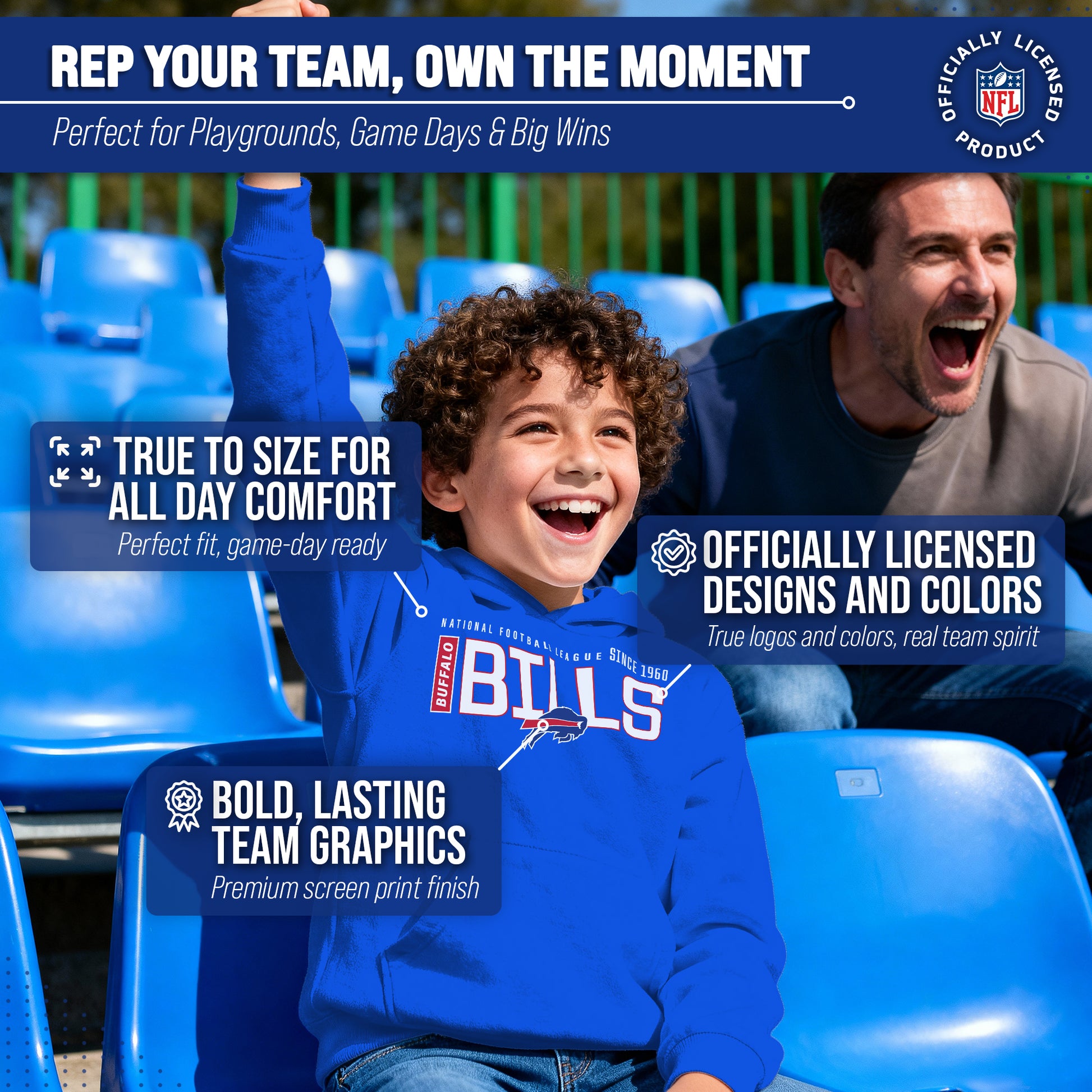 Hey there, young sports fans! Get ready to show off your team spirit with the Team Fan Apparel Buffalo Bills Youth Modern Endzone Football Fleece Hooded Sweatshirt! Made from a soft and cozy cotton polyester fleece, this sweatshirt is perfect for staying warm on game day or any day. The unisex design makes it suitable for both boys and girls, and its tag-less feature ensures ultimate comfort all day long. Featuring an original modern endzone design that proudly displays your team's colors and logos, this youth hoodie will be turning heads everywhere it's worn. The front pouch pocket and fleece hood will keep you warm on those cold game days as you cheer on your Bills! Just pull it on and go! So whether you're at the stadium or hanging out with friends, make sure you're representing your team in style with our NFL youth apparel. Printed and designed in the USA, have confidence your sweatshirt will last! Order now and get your future pro geared up to be the next super fan!