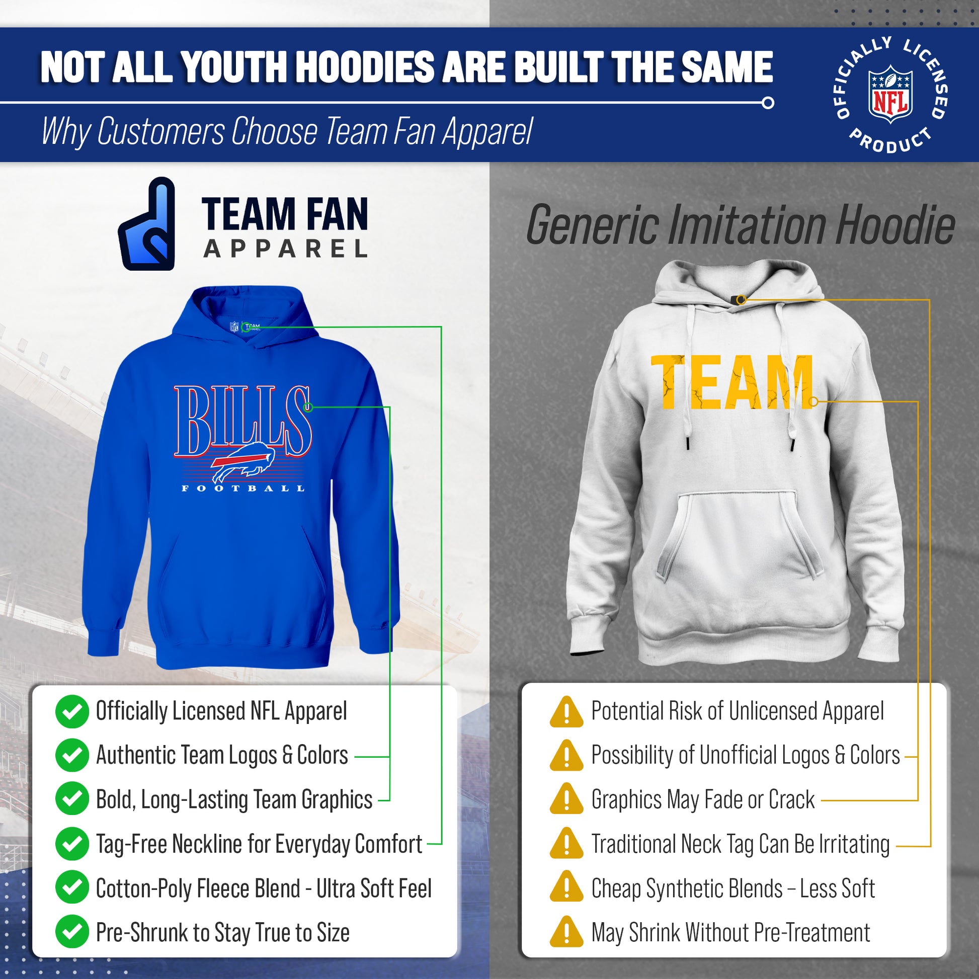 Hey there, young sports fans! Get ready to show off your team spirit with the Team Fan Apparel Buffalo Bills Youth Overtime Blueprint Football Fleece Hooded Sweatshirt! This sweatshirt is made from a soft and cozy cotton polyester fleece and is perfect for staying warm on game day or any day. The unisex design makes it suitable for both boys and girls, and its tag-less feature ensures ultimate comfort all day long. Featuring an original outlined design with their vintage logo that proudly displays the team's colors, this youth hoodie will be turning heads everywhere it's worn. The front pouch pocket will keep you warm on those cold game days as you cheer on your Bills! Just pull it on and go! So whether you're at the stadium or hanging out with friends, make sure you're representing your team in style with our NFL youth apparel. Printed and designed in the USA, have confidence your sweatshirt will last! Order now and get your future pro geared up to be the next super fan!