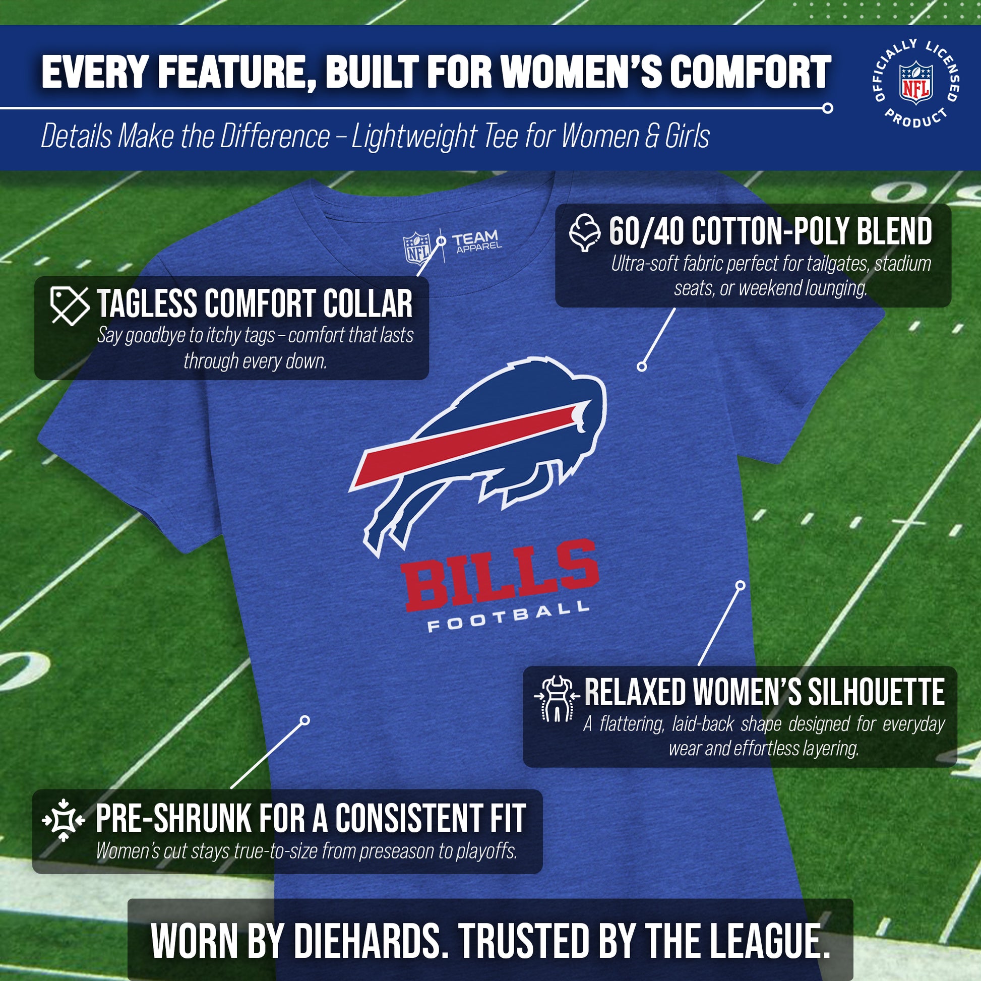 Score with Team Fan Apparel, the ultimate destination for officially licensed NFL apparel for men and women. We use only the highest-quality screen printing techniques to bring you the most comfortable, durable, and stylish clothing possible. Go ahead and show your team pride at the big game or any time! This premium womens t-shirt comes in small, medium, large, XL, and XXL. So needless to say, it fits Buffalo Bills fans of all types! Maybe you aren't a Bills fan but you know someone who is? Don't worry! This high-quality t-shirt is soft, lightweight, breathable, and a GREAT gift for any birthday, anniversary, Mother's day, Valentine's day, or Christmas gift! So, if you want to stand out as the #1 female fan at the next big game or watch party, you're going to want to be wearing one of these Buffalo Bills Women's Big Logo t-shirts.