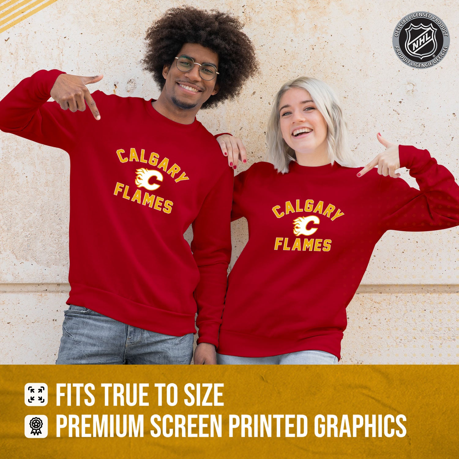 Score with Wright & Ditson, the ultimate destination for officially licensed NHL apparel for men and women. Design and printed in the USA, we use only the highest quality screen printing techniques to bring you the most comfortable, durable, and stylish clothing possible. Go ahead and show your team pride at the big game or any time! This premium hockey crewneck fits both male and female adults and comes in small, medium, large, XL, and XXL. So needless to say, it fits Calgary Flames fans of all types! Maybe you aren't a Flames fan but you know someone who is? Don't worry! This high-quality hockey Gameday Crew is soft, lightweight, breathable and a GREAT gift for any Christmas gift, birthday or anniversary gift, Father's Day gift, Mother's day gift , you name it! So, if you want to stand out as the #1 fan at the next big game, you're going to want to be wearing one of these hockey sweatshirts!