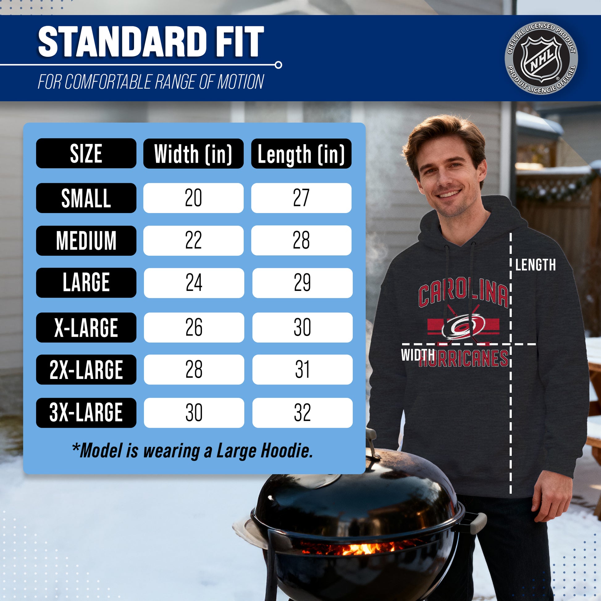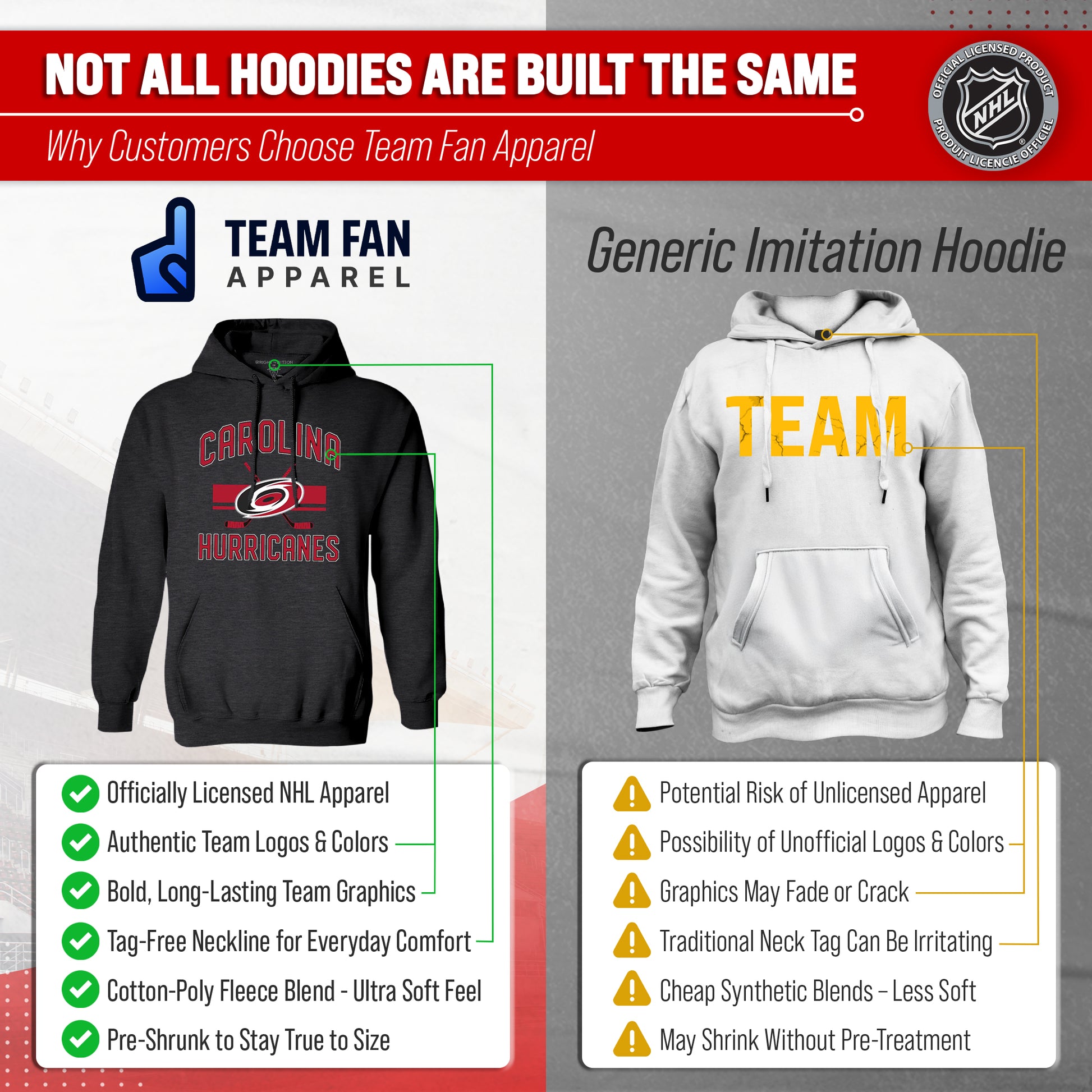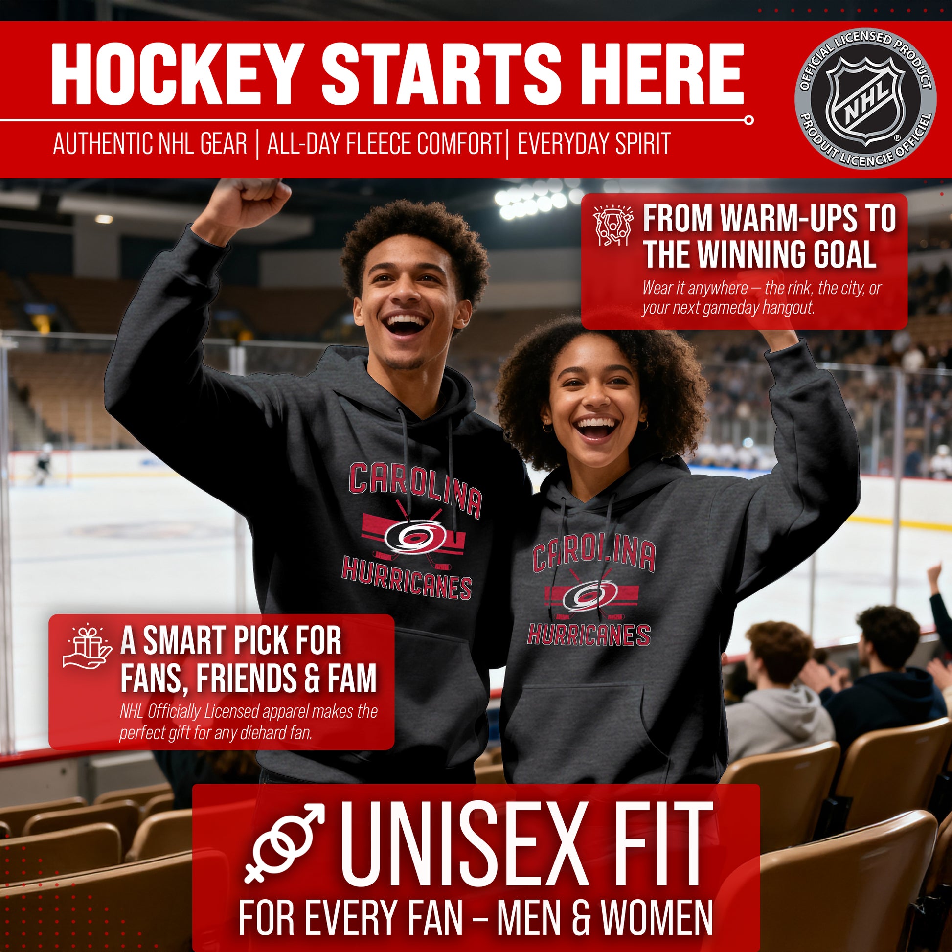 Hey there, fellow hockey fans! Show your team spirit in style with the Adult NHL Face Off Hooded Sweatshirt. Whether you're cheering on your Carolina Hurricanes at the arena or snuggled up on the couch for game day, this ultra-soft fleece hoodie has got you covered. Designed for both men and women, this sweatshirt has a true-to-size fit and is made from a comfortable poly-cotton fleece blend that will keep you cozy all season long. It features a Face Off design with hockey sticks and the official team stripe, making it the perfect addition to any fan's wardrobe. Officially licensed by the NHL, you can trust that you're getting a high-quality product that shows off your team pride. Available in a range of adult sizes, there's an option for every Hurricanes fan out there. The hood and front pouch pocket will keep you warm on cold winter days. So don't wait any longer - grab your NHL Face Off Hooded Sweatshirt and get ready to root for your team in ultimate comfort and style!