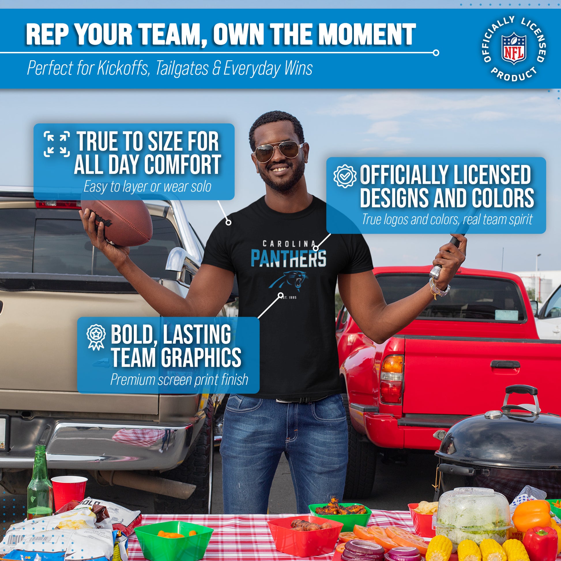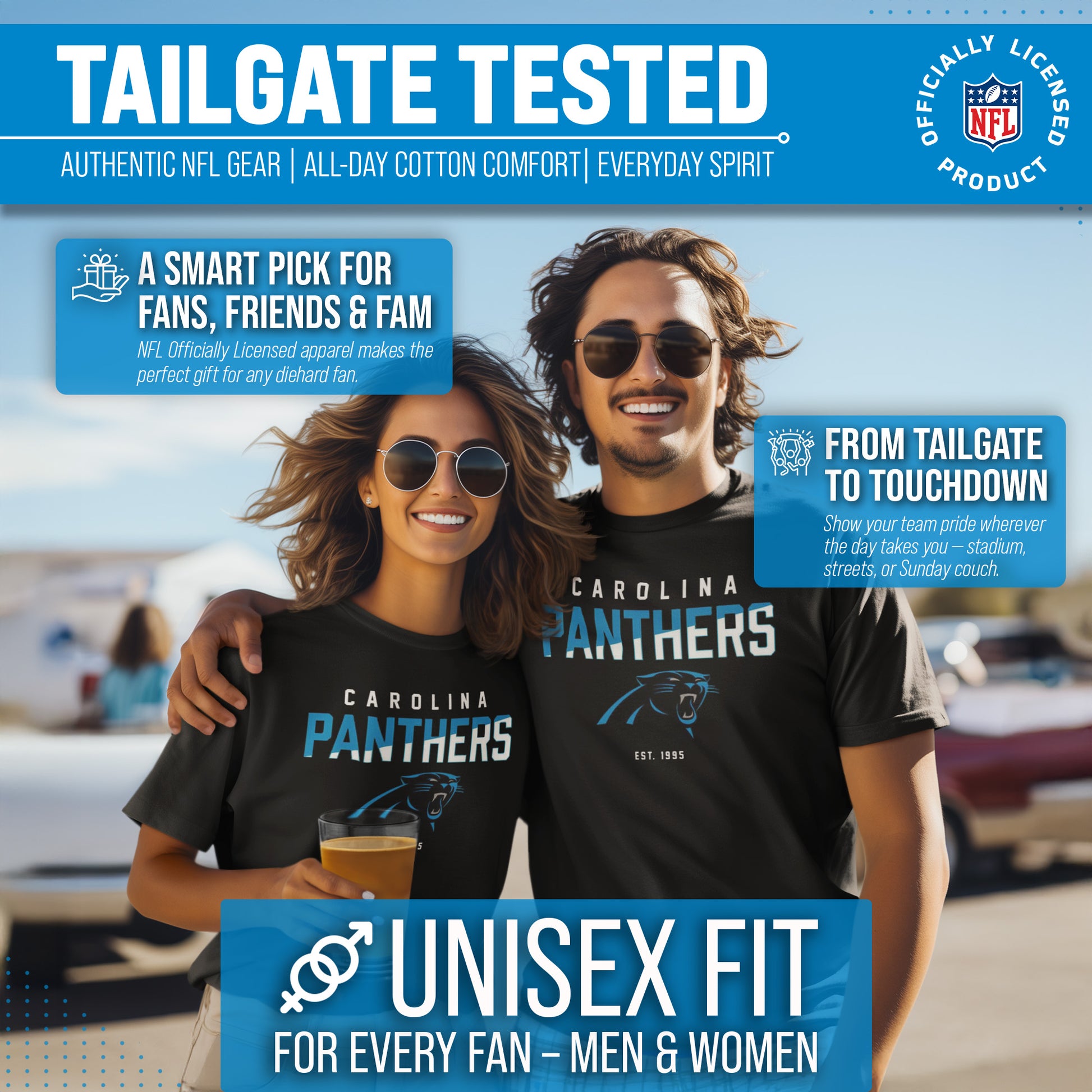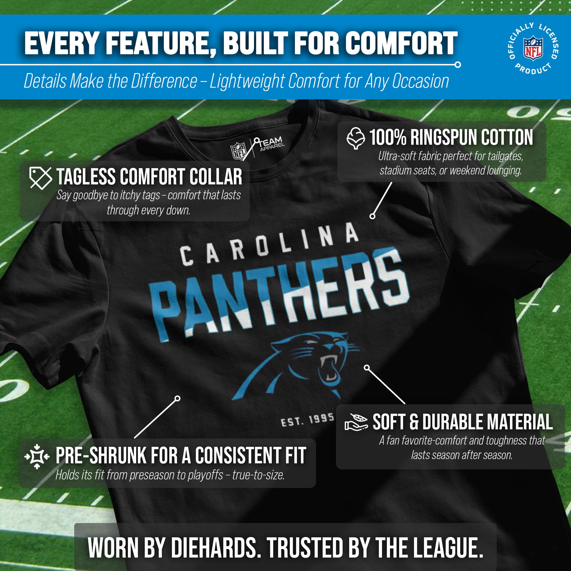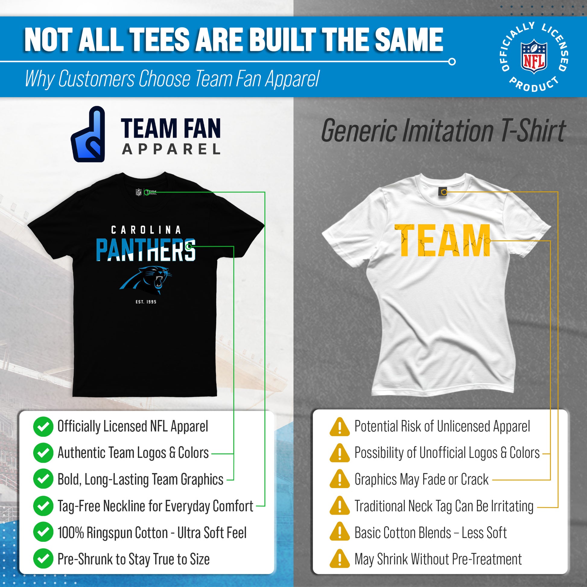 Score with Team Fan Apparel, the ultimate destination for officially licensed NFL apparel for men and women. We use only the highest quality screen printing techniques to bring you the most comfortable, durable, and stylish clothing possible. Go ahead and show your team pride at the big game or any time! This premium t-shirt fits both male and female adults and comes in small, medium, large, XL, and XXL. So needless to say, it fits Carolina Panthers fans of all types! Maybe you aren't a Panthers fan but you know someone who is? Don't worry! This high-quality t-shirt is soft, lightweight, breathable and a GREAT gift for any birthday, anniversary, Father's Day, Mother's day, you name it! So, if you want to stand out as the #1 fan at the next big game or watch party, you're going to want to be wearing one of these hockey t-shirts.