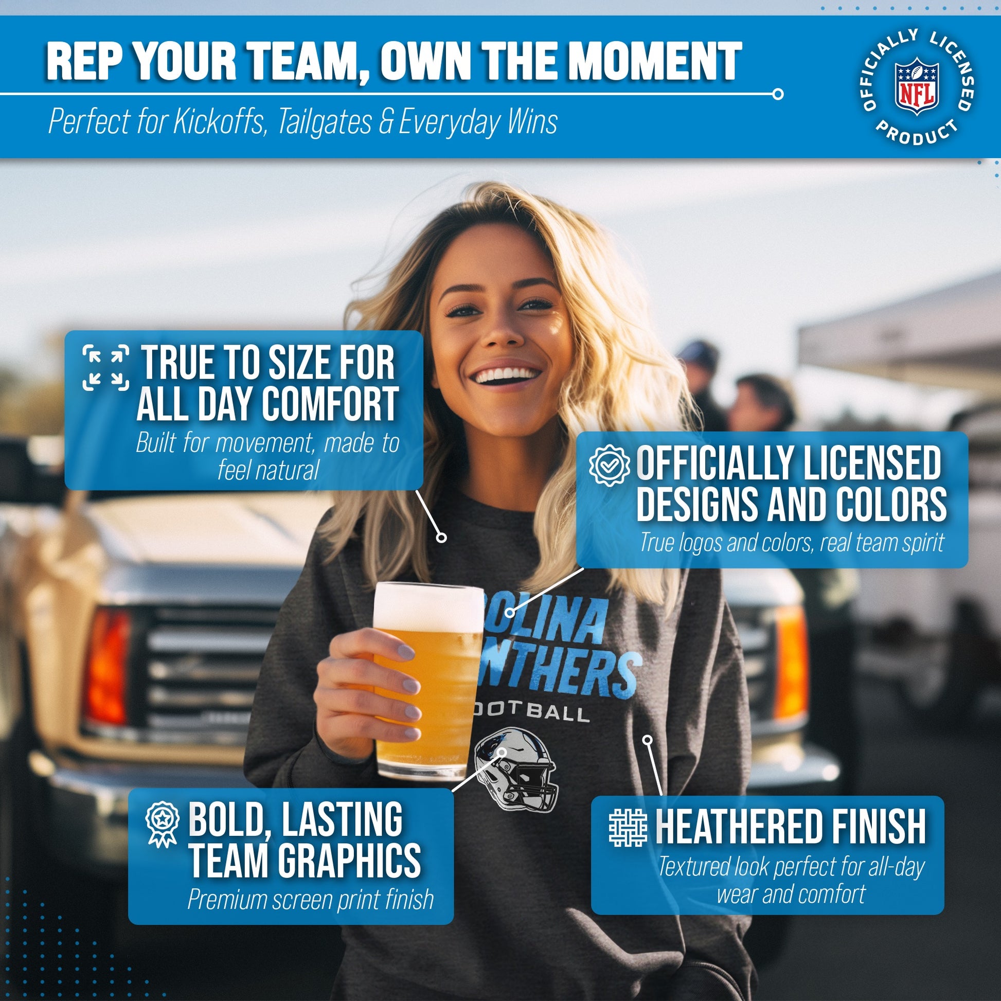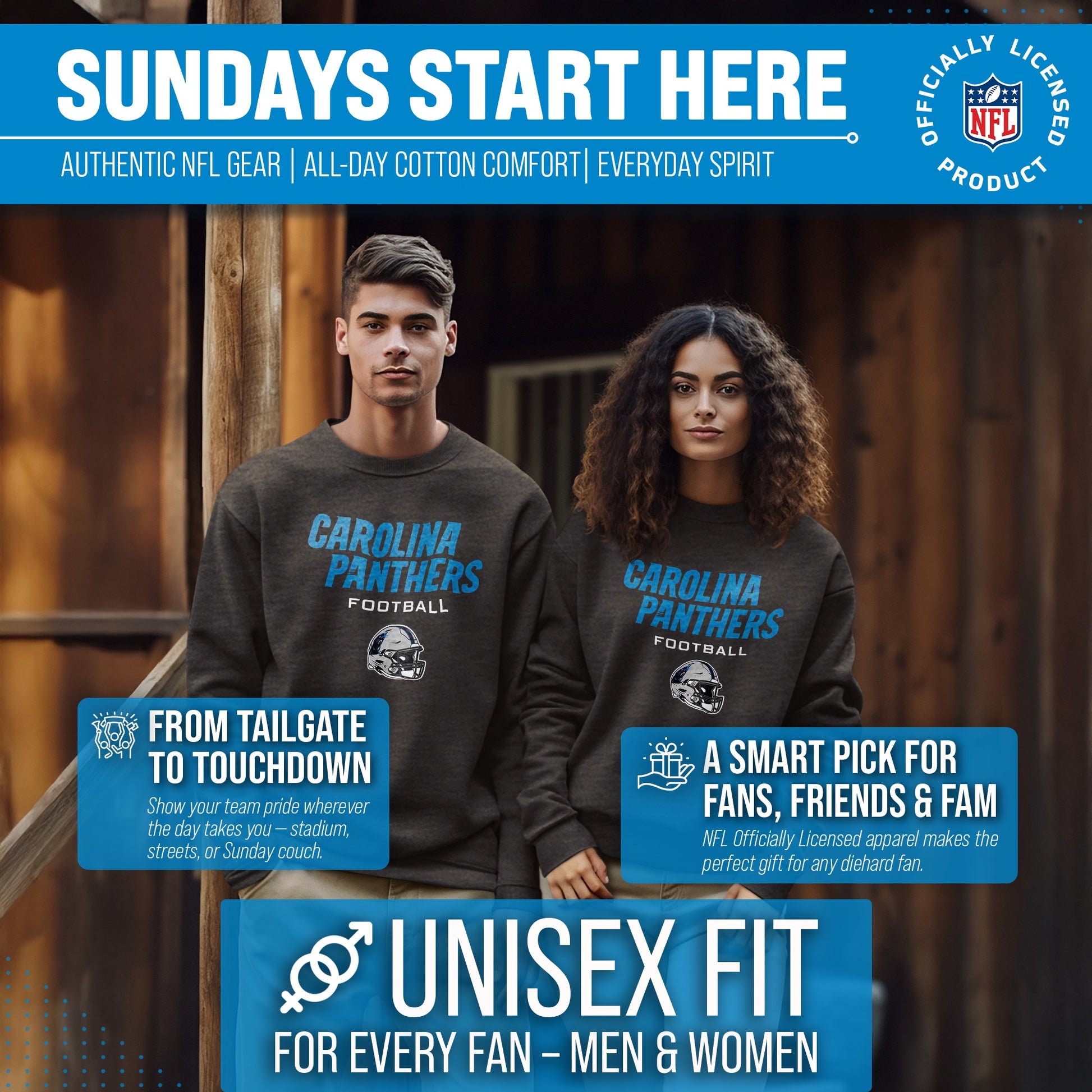 Score with Team Fan Apparel, the ultimate destination for officially licensed NFL apparel for men and women. Design and printed in the USA, we use only the highest quality screen printing techniques to bring you the most comfortable, durable, and stylish clothing possible. Go ahead and show your Panthers pride at the big game or any time! This premium heather charcoal crewneck fits both male and female adults and comes in small, medium, large, XL, and XXL. Maybe you aren't a Panthers fan but you know someone who is? Don't worry! This high-quality crewneck is soft, cozy, breathable and a GREAT gift for any birthday, anniversary, Father's Day, Mother's day, Christmas, you name it! So, if you want to stand out as the #1 football fan at the next big game or watch party, you're going to want to be wearing one of these football helmet crewnecks.