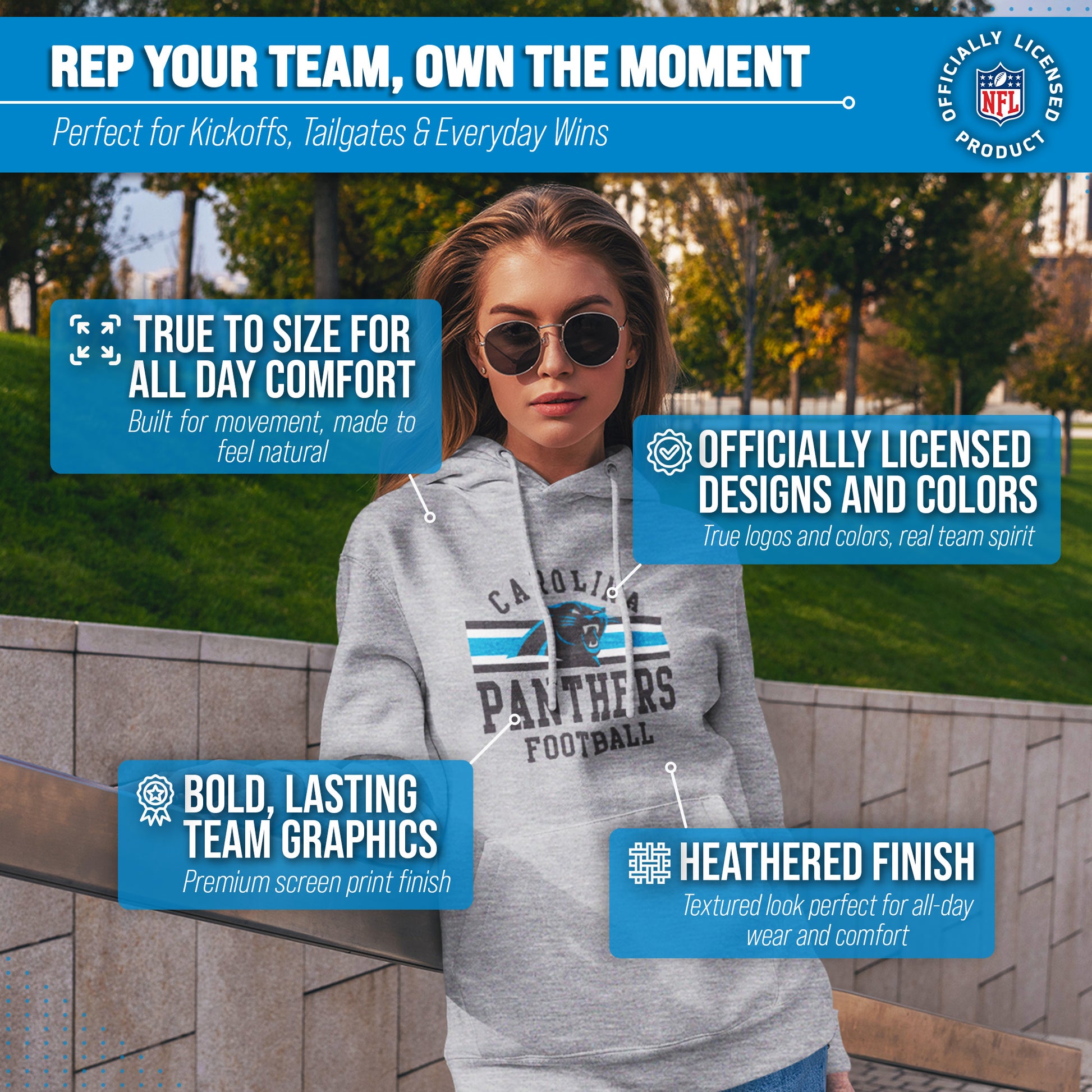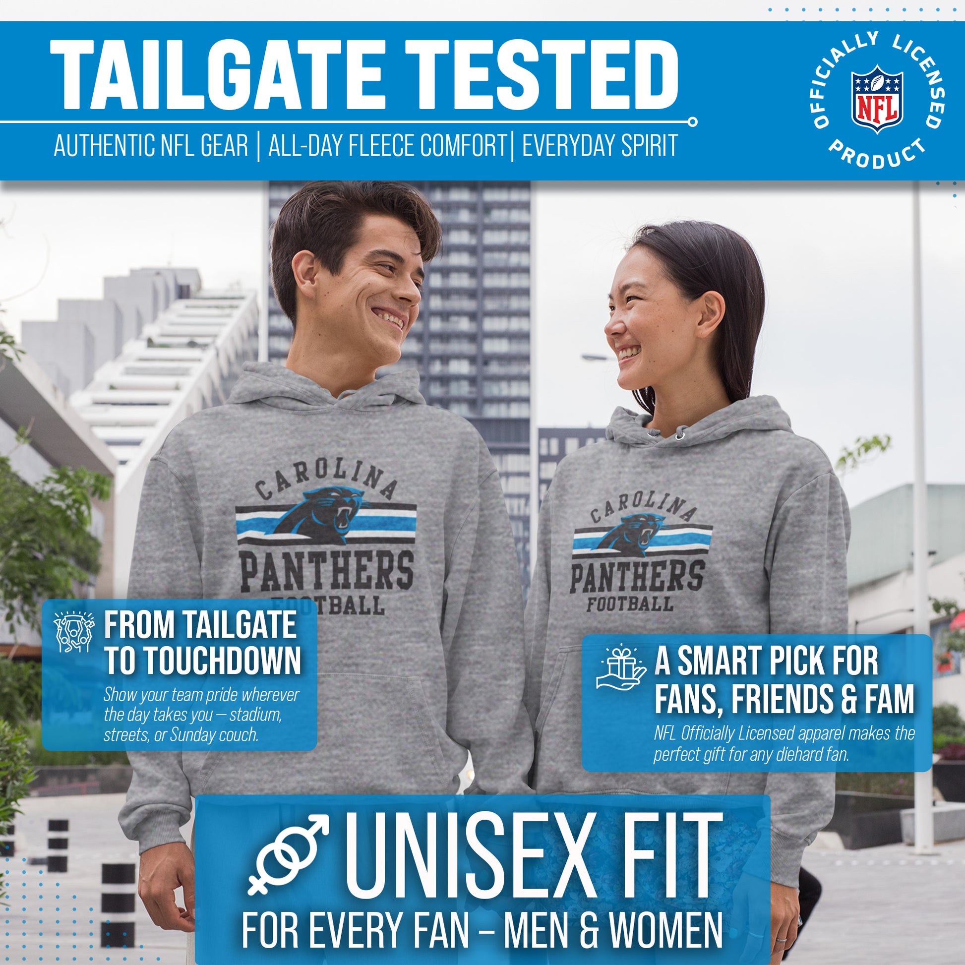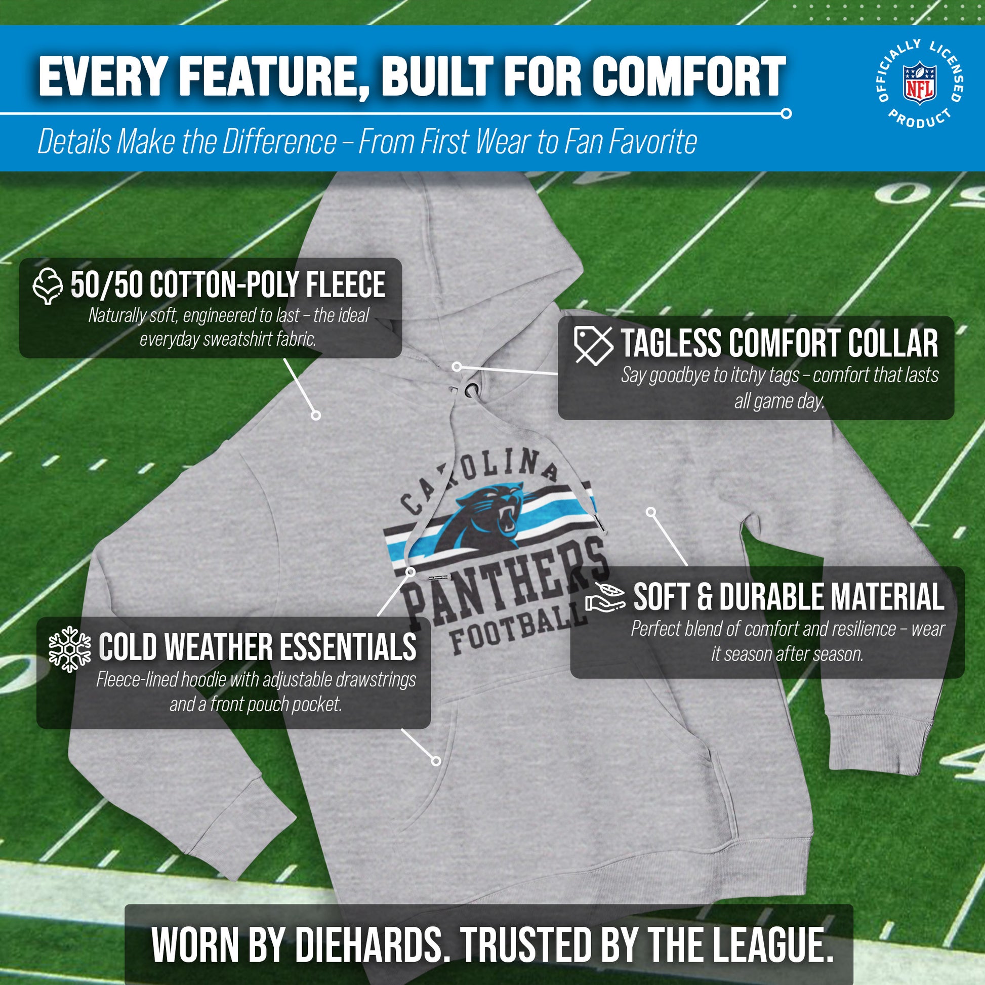 This Carolina Panthers hoodie is made from cotton-poly fleece. Our soft Panthers pullover hoodie is beyond comfortable and thick enough to keep you warm on game day. This hoodie is soft enough that you'll want to wear it every day. The tagless pro football sweatshirt hoodie ensures comfortability and avoids neck irritation. The pro football hoodie features official graphics. Our Panthers sweatshirts are designed and printed in the USA. These high-quality Panthers hoodies are made with stitch density for a smoother printing surface. This Carolina hoodie gives the sports look only a true fan can accomplish. This is essential apparel for any football or sports fan. This soft hoodie is perfect for watching the game, working out, or for a fathers day gift. It's perfect for Carolina football games.