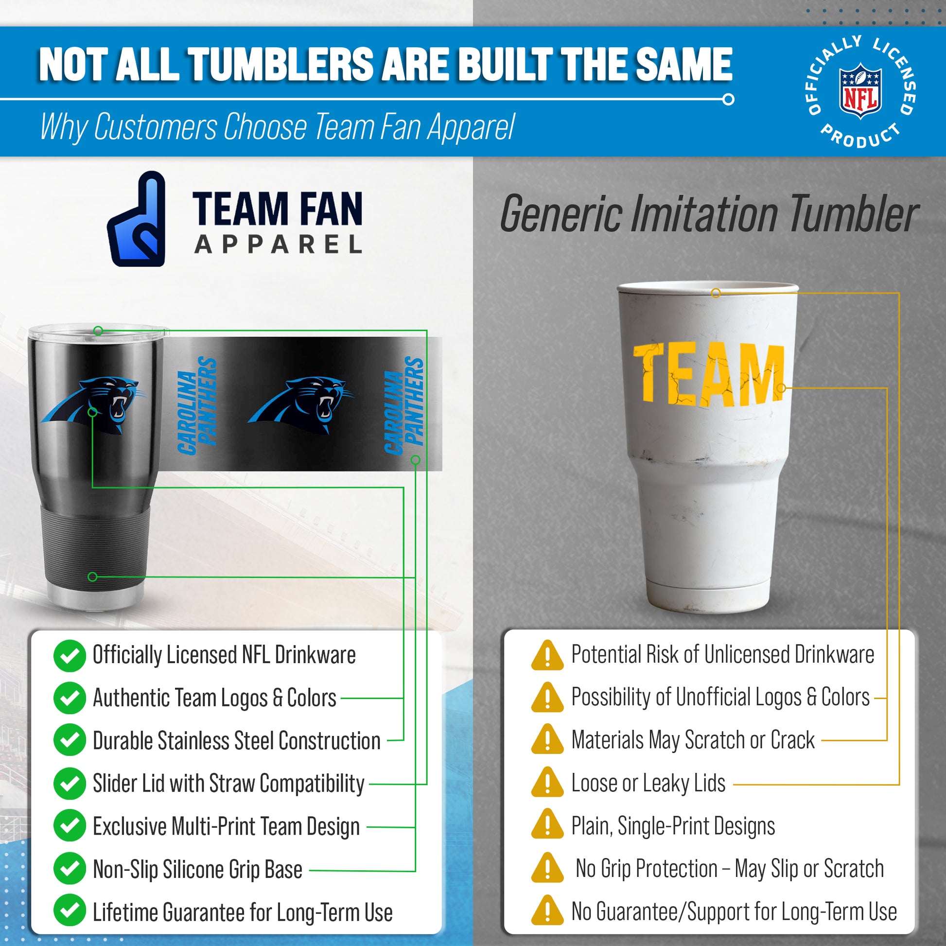 Get ready to cheer on the Carolina Panthers with the NFL 30oz Gameday Stainless Steel Tumbler! This versatile Panthers tumbler is perfect for both hot and cold drinks, making it a must-have for game days, road trips, or just everyday use. The sleek stainless steel design features your team's logo, making it a great gift for any Carolina Panthers fan - men and women alike! With a slider lid and slightly tapered silhouette, you can easily sip on your coffee, water or cocktails while showing off your Carolina Panthers team spirit. But this tumbler isn't just stylish - it's also functional. The insulated design keeps your drinks at the perfect temperature, whether you're tailgating in the chilly fall weather or enjoying a refreshing drink in the summer sun. And with a generous capacity of 30oz, you'll have plenty to share with friends and family. So grab your NFL 30oz Gameday Stainless Steel Carolina Panthers Tumbler and show off your love for the game wherever you go!