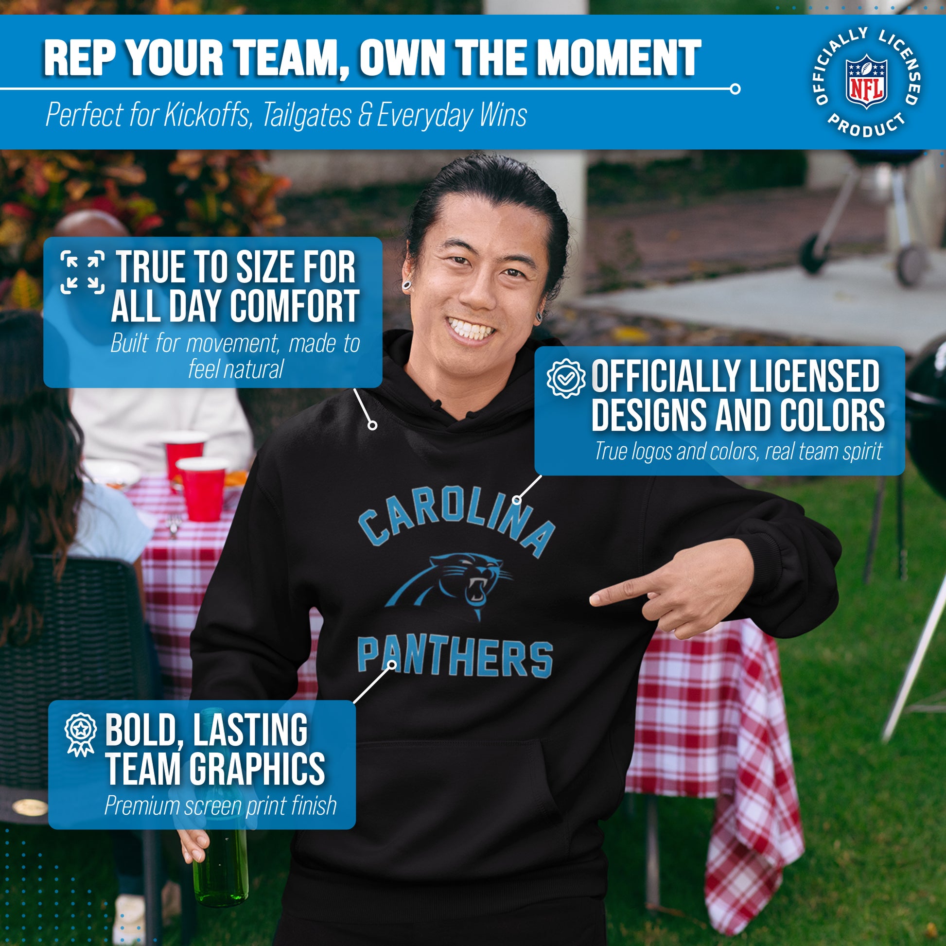 Our Adult Gameday Carolina Panthers football pullover hoodie with a front pouch pocket is the ideal sweatshirt to wear on gameday. This Carolina hoodie is comfortable and great for showing team pride all year long. This is an essential piece of womens and mens football apparel for pro football fans. Our Carolina Panthers team colored hoodie sweatshirts are the perfect fan apparel for tailgates and sports games. This hooded sweatshirt pullover with a pocket and drawstrings is ideal for warm or cold weather games. The football pullover hoodie is made from a cotton poly blend fleece material with cotton face. These pro football sweatshirts have high quality features. Our football pullover hoodies feature 1x1 ribbing at cuffs and waistband. This Panthers hoodie sweatshirt has a twill neck tape and jersey lined hood. The metal eyelets on the sweatshirt drawstrings add a sophisticated look to these pro football team hoodies for men and women. This tagless sweatshirt ensures the most comfortable fit for men and women. The standard fit makes our football team hoodies for men and women the perfect sweatshirt for Carolina fans. The thermal printed graphics are high definition, true team color, and resist fading. Our hoodies also make the best Panthers gifts for men and women. Carolina Panthers apparel is the perfect birthday gift for any professional sports fan. Our football team hoodies for men and women are great mens football apparel for tailgating, stadium fun, or watching the game at home.