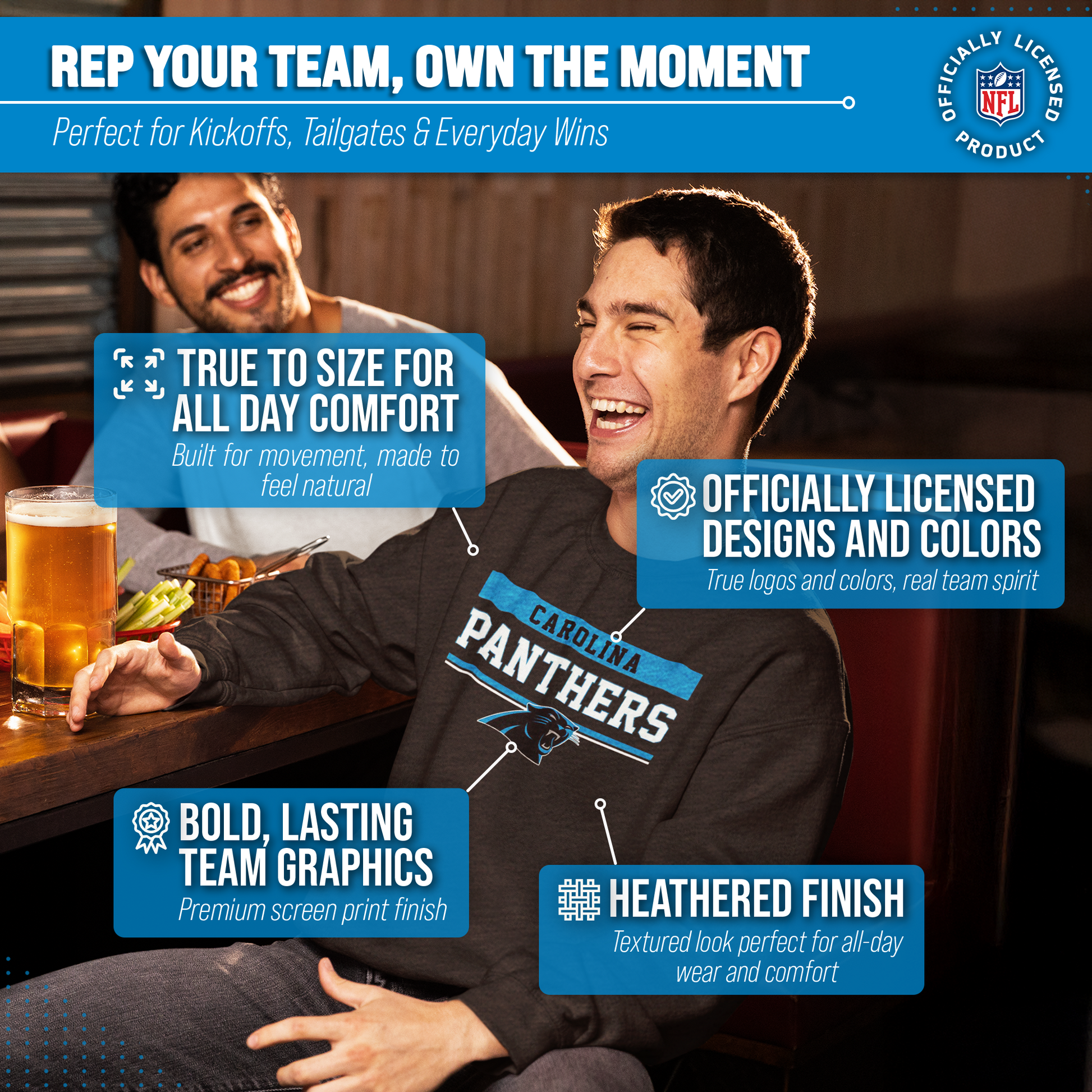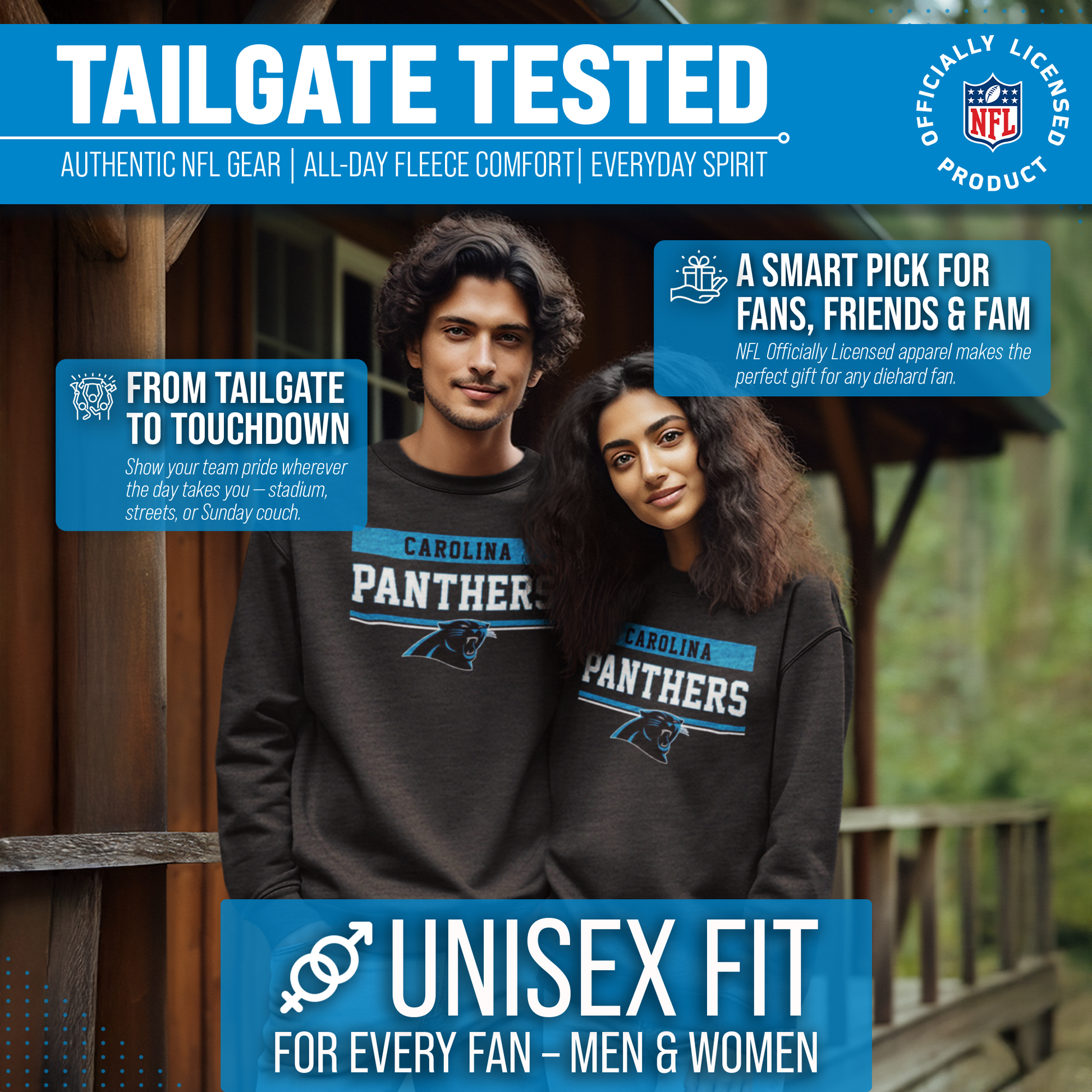 Our charcoal crew neck is a Carolina crewneck sweatshirt with a warm and toasty 9 oz fleece lining. It's the very best of Carolina Panthers apparel, plain and simple. Gear up for your cold weather football game with confidence. Or, for women, bring it with you to games and tie it around your leggings in case the arena is a little chilly. Our football crew neck sweatshirts for men and women are super comfortable, run true to size, and are great for showing your team pride all year long. Plus, the unisex fit is ideal for both men and women and works as an oversized sweatshirt for kids. [Team_long] sweater for men and women features your teems thermal-printed emblem wordmark will stay crisp and clear, wear after wear. All colors and fonts are officially licensed and are of the highest of quality, it even comes with an officially licensed tag. Features: ribbed cuffs and waistband. This football sweatshirts crew in particular is perfect for tailgates, games, and showing off your team spirit. Gameday crewneck [team_ long] sweatshirts make a great birthday, Christmas (or any other holiday), or graduation gift for a sports fan. Gameday charcoal crewneck is essential apparel for protecting yourself and your loved ones from the elements. The fleece material will keep you warm through the colder months, and the pullover design allows you to feel embraced like a big oversized blanket. The Carolina Panthers charcoal crew necks are pre-shrunk and are made from a dual blend of 50% cotton and 50% polyester that is ideal for that tailgate or game day when the temperature drops. Pair with your other favorite Carolina game day apparel! Say goodbye to cheap sweatshirts. Our charcoal sweatshirts for women and men help you gear up and get ready to cheer your team to victory.