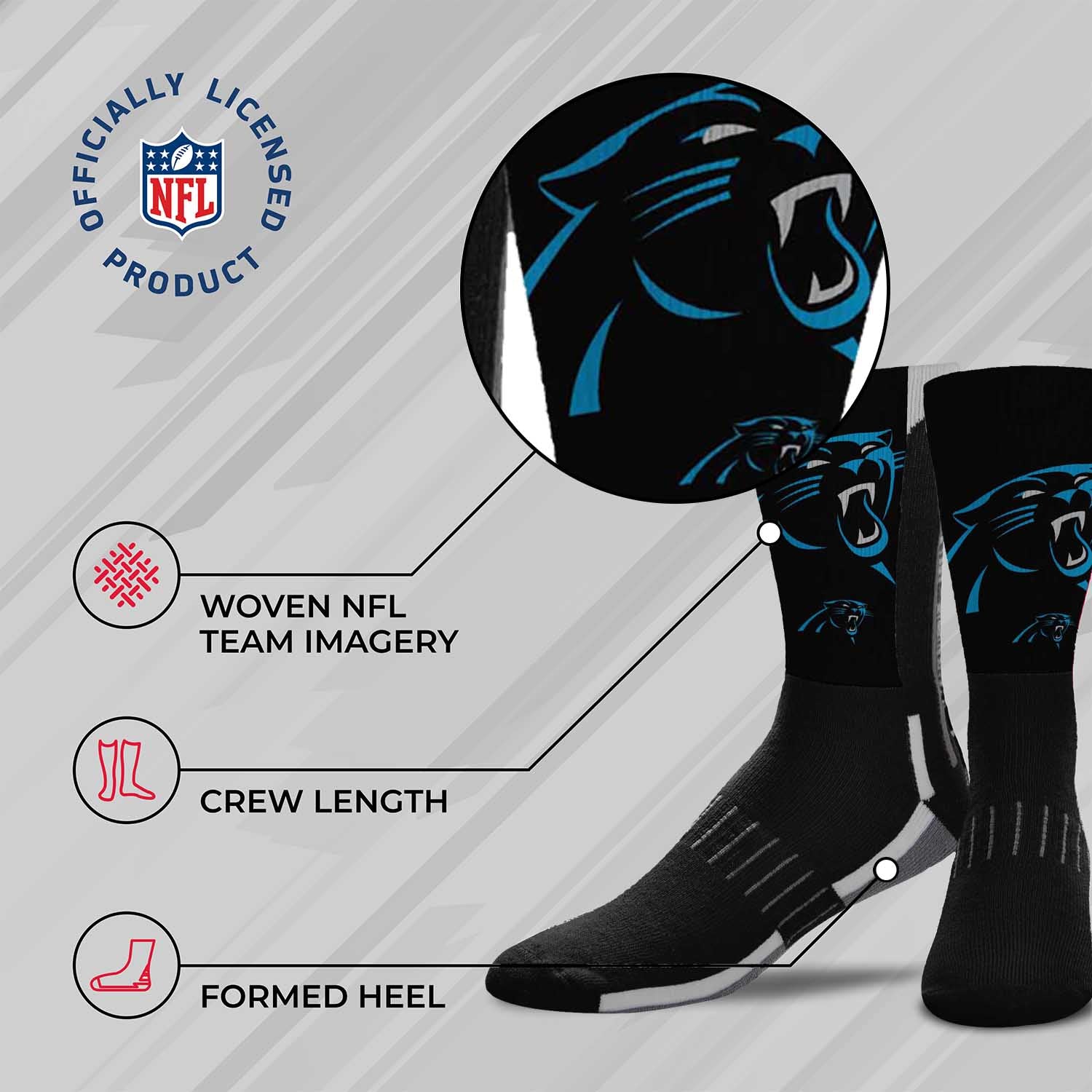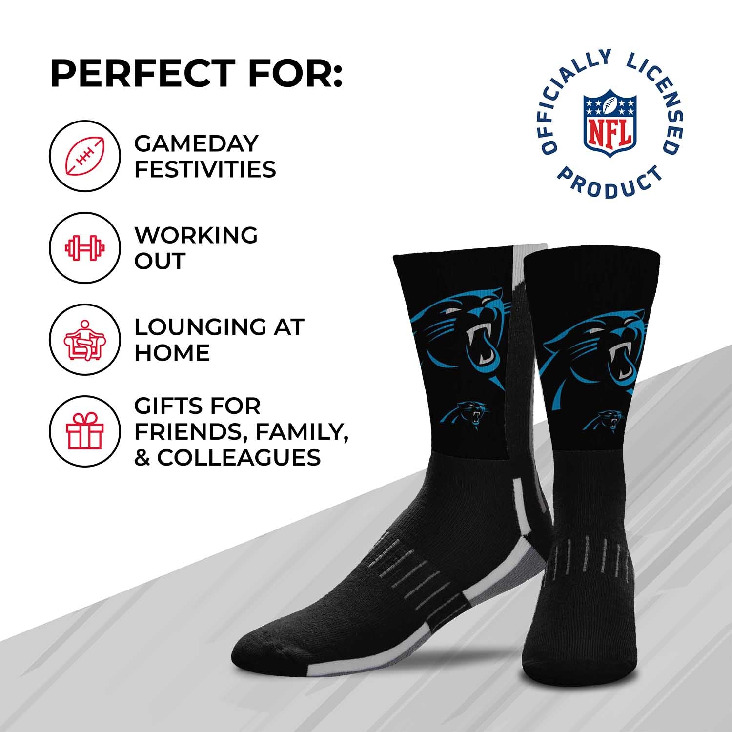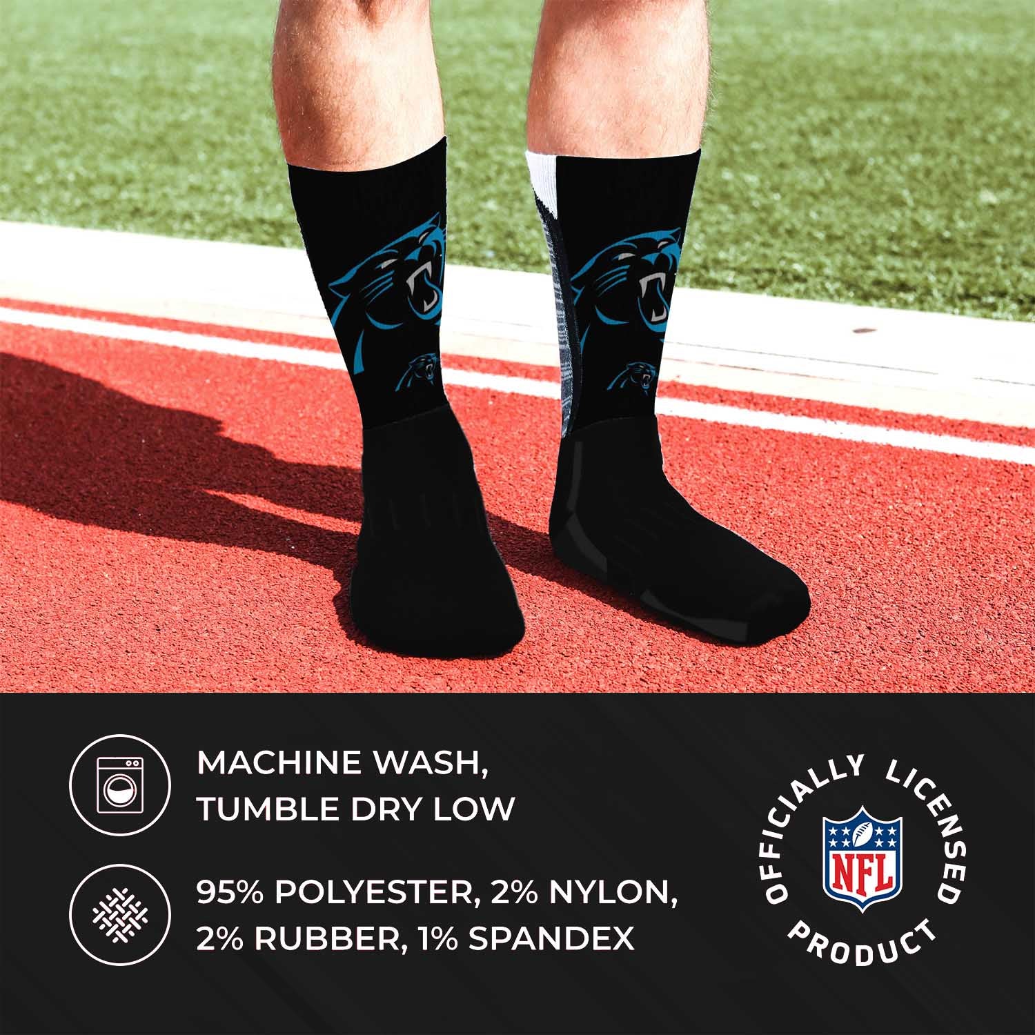 These Carolina Panthers socks for children are great for showing off your Carolina pride from head to toe. The unisex Carolina youth socks are comfortable. The crew length and poly-spandex blend featuring a supportive formed heel make them a comfortable choice for showcasing your love for your team all year long. Carolina youth socks are great additions to a collection of Carolina Panthers stuff. Wear them with shorts, your favorite jersey, and Carolina Panthers shoes for a superfan look, or rock them in the office for an alternative to argyle on casual friday. On a lazy day, wear them with your underwear or pajamas and Carolina Panthers house shoes while you put your feet up and enjoy a game in the house. Carolina Panthers youth socks make great birthday gifts for all ages. The officially-licensed team logo, colors, and graphics make these socks the Carolina socks kid superfans will love. Fabric content is 95% polyester, 2% nylon, 2% rubber, and 1% spandex. Machine washable, tumble dry low.