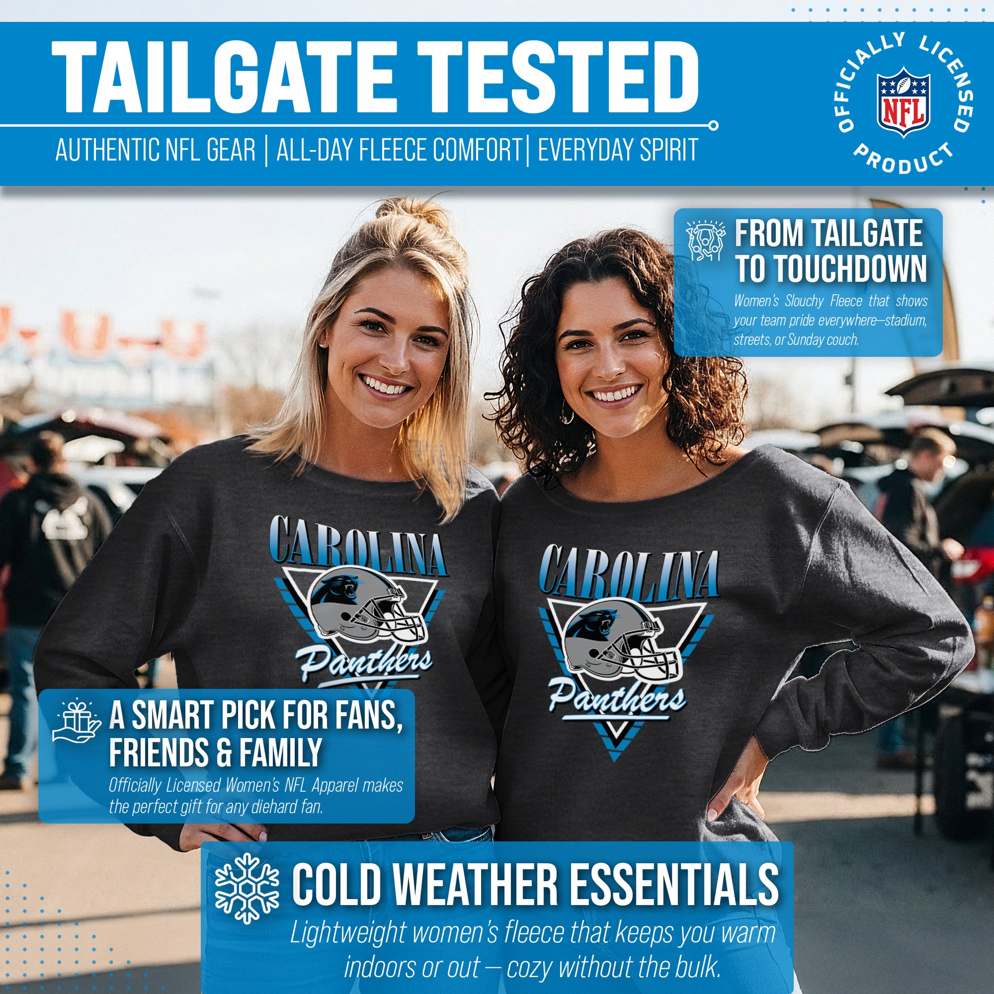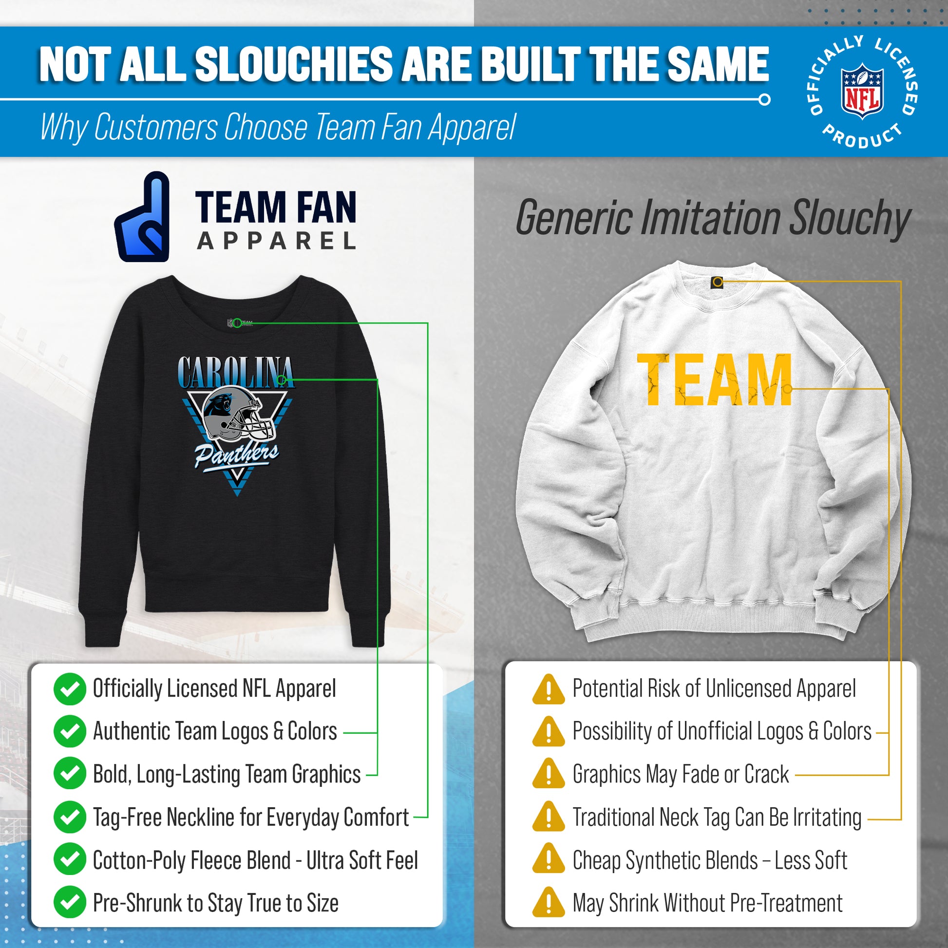 Hey there, fellow lady football fans! Show off your team pride in style with our Team Fan Apparel Carolina Panthers NFL Women's Retro Triangle Slouchy Crewneck Fleece Pullover. Made with extra soft cotton polyester fleece material, this long sleeve pullover sweatshirt will keep you warm and cozy on game day or any chilly day. With a tagless design, you won't have to worry about any annoying tags distracting you from cheering on your team. Featuring a retro triangle design and relaxed fit, this pullover adds a touch of fashion to your game day wardrobe. Available in a range of women's sizes, it's the perfect addition to any fan's closet. Whether you're headed to the stadium or watching from home, stay cool and stylish with this must-have piece of Panthers apparel. Don't let snow or cold weather dampen your team spirit - grab one for yourself or as a gift for the ultimate football-loving lady in your life! Go Panthers!