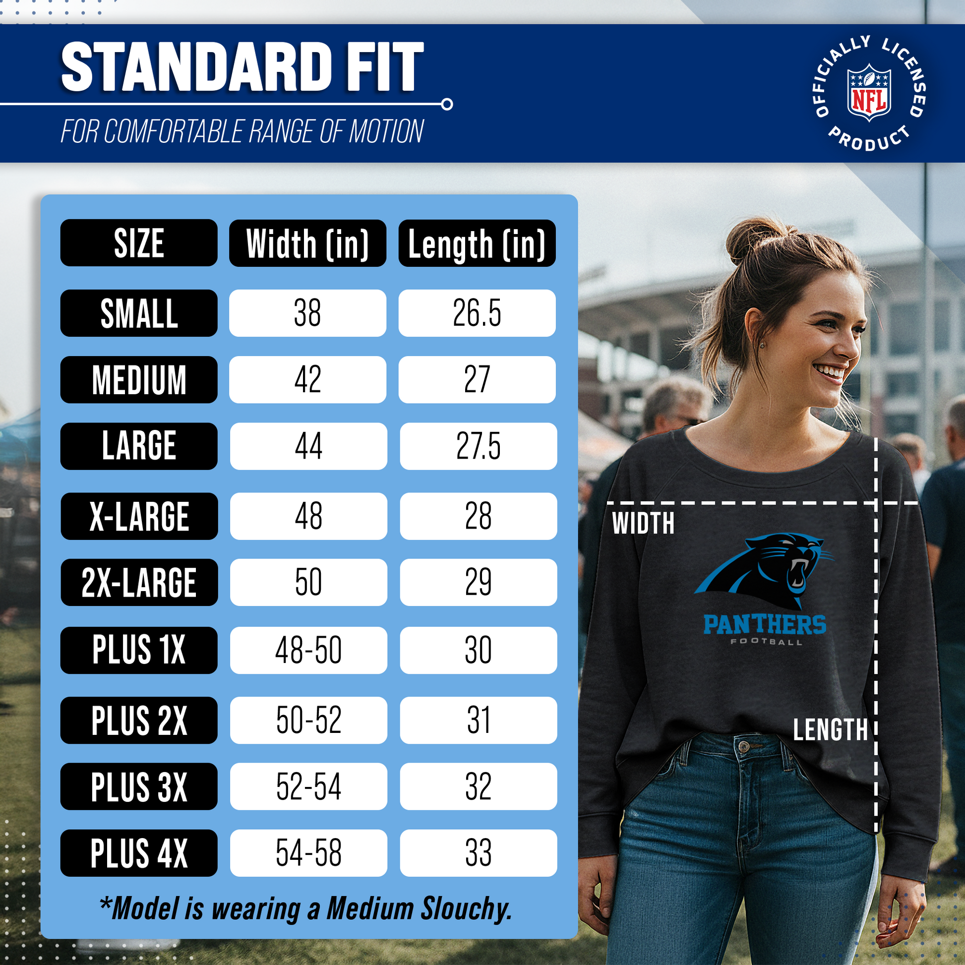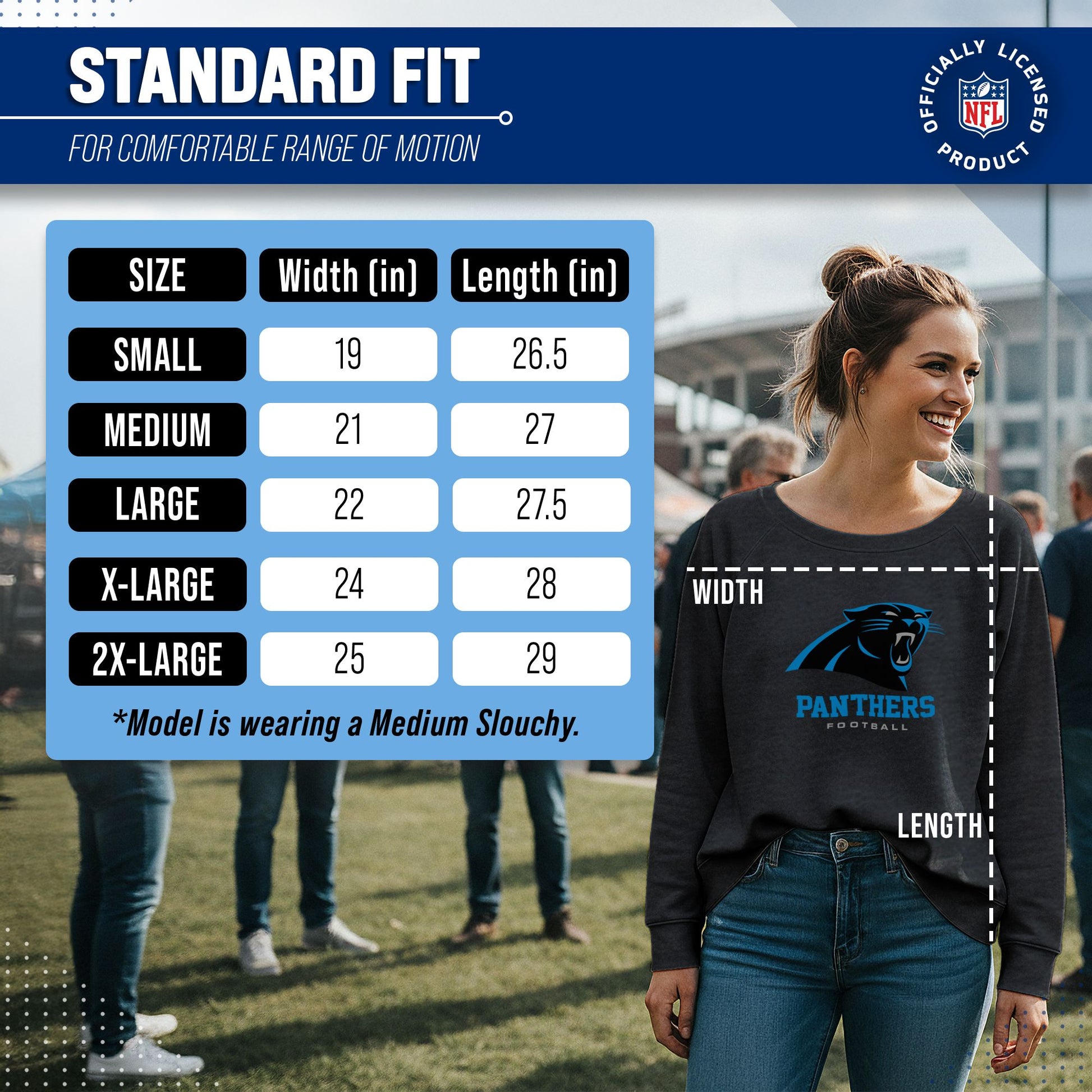 Score with Team Fan Apparel, the ultimate destination for officially licensed NFL apparel for men and women. We use only the highest-quality screen printing techniques to bring you the most comfortable, durable, and stylish clothing possible. Go ahead and show your team pride at the big game or any time! This premium womens slouchy charcoal crewneck comes in small, medium, large, XL, and XXL. So needless to say, it fits Carolina Panthers fans of all types! Maybe you aren't a Panthers fan but you know someone who is? Don't worry! This high-quality crewneck is soft, lightweight, breathable, and a GREAT gift for any birthday, anniversary, Mother's day, Valentine's day, or Christmas gift! So, if you want to stand out as the #1 female fan at the next big game or watch party, you're going to want to be wearing one of these Carolina Panthers Women's Big Logo pullover crewnecks.