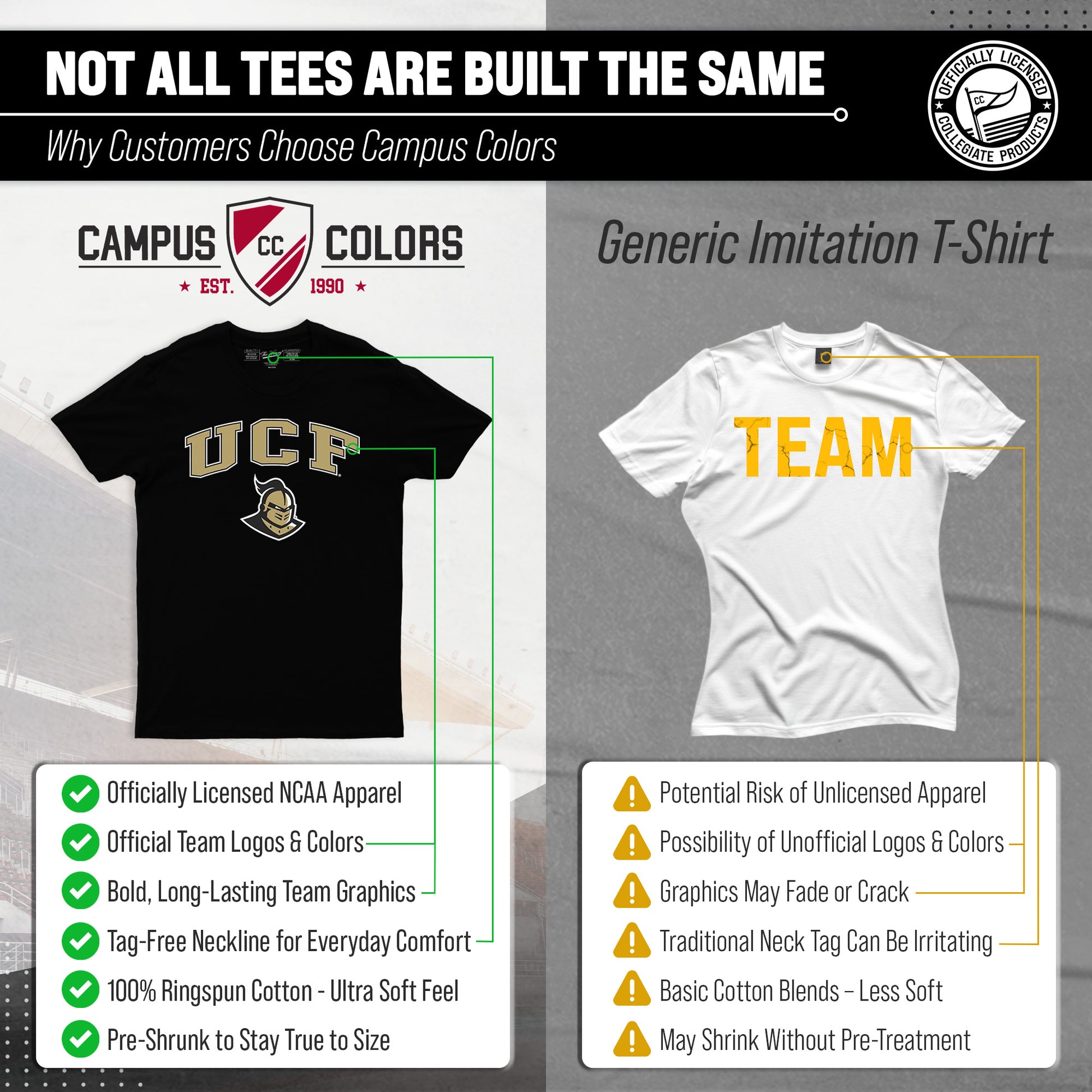 Score with Campus Colors, the ultimate destination for officially licensed college apparel for men and women. Design and printed in the USA, we use only the highest quality screen printing techniques to bring you the most comfortable, durable, and stylish clothing possible. Go ahead and show your team pride at the big game or any time! This premium-quality Gameday t-shirt fits both male and female adults and comes in small, medium, large, XL, and XXL. So needless to say, it fits Central Florida Knights fans of all types! Maybe you aren't a UCF fan but you know someone who is? Don't worry! This high-quality t-shirt is soft, lightweight, breathable and a GREAT gift for any birthday, anniversary, Father's Day, Mother's day, you name it! So, if you want to stand out as the #1 Knights fan at the next big tailgate party, homecoming parade, or watch party, you're going to want to be wearing one of these Gameday t-shirts.