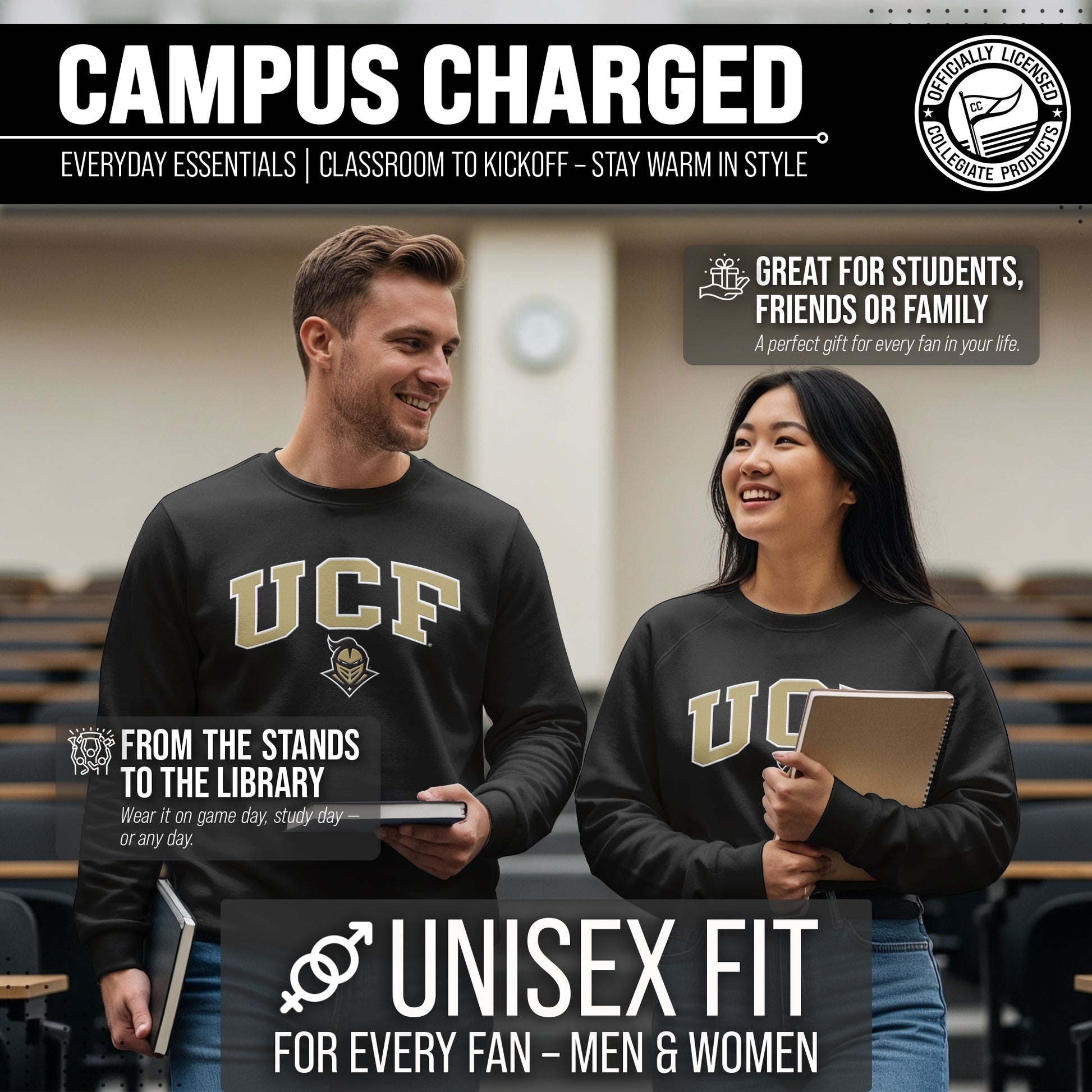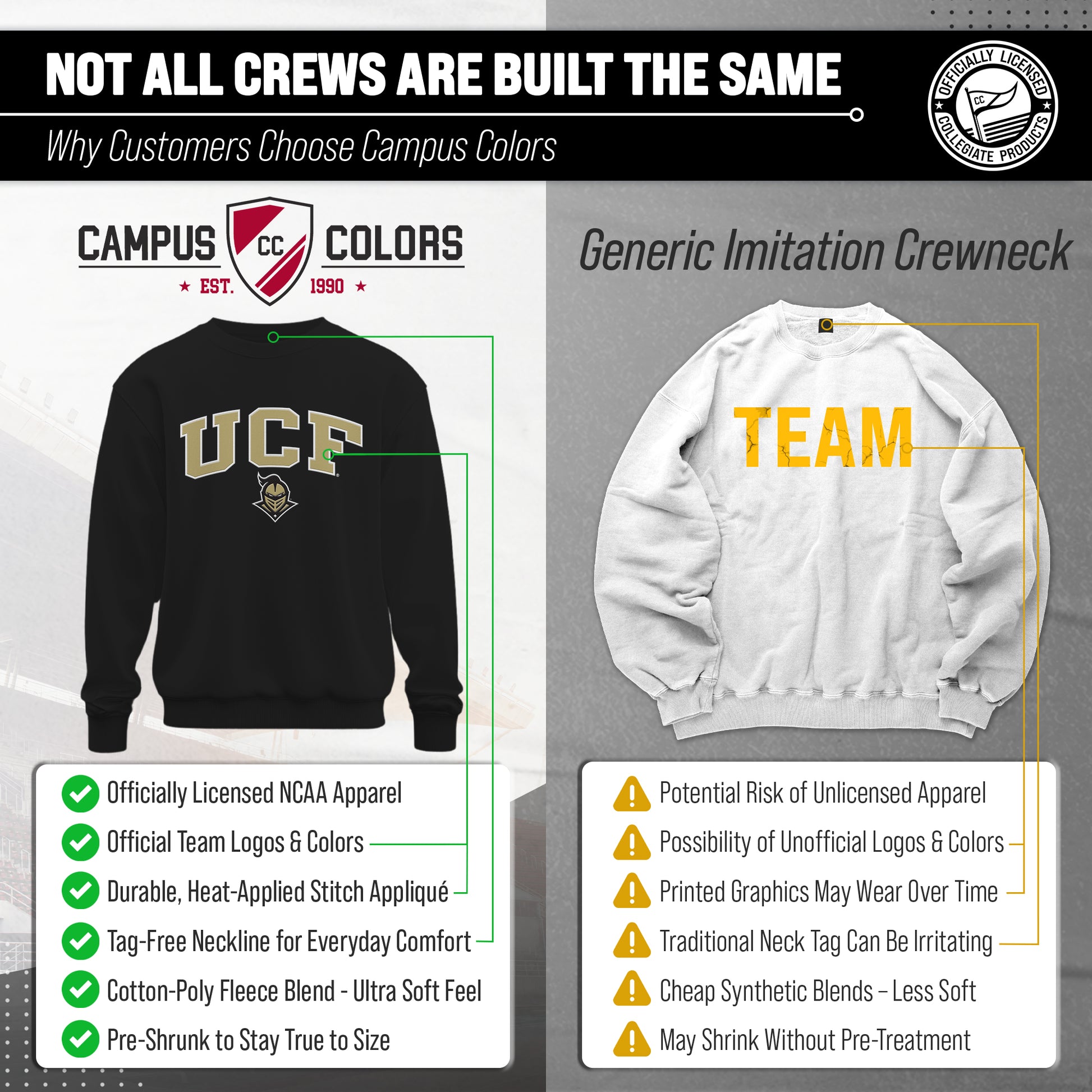 The Central Florida Knights Adult Tackle Twill Crewneck Sweatshirt is super comfortable, runs true to size, and is great for showing off your school pride. All crewneck pullovers are a fan favorite and look fresh after many years. The Knights crewneck sweatshirt has a unisex fit that is ideal for both men and women. The embroidered university logo and name will stay crisp wear after wear. Our college crewneck sweatshirt is ideal when thrown over a t-shirt for football tailgates, games, when the temperature drops, or when you just want to show off your team spirit! The university crewneck sweatshirt is the perfect gift for any college student, upcoming graduate, alumnus or sports fan. Made with quality material, the double letter embroidered university logo is made of precise laser cut appliques applied with heat that will stay crisp wear after wear. All logos and colors are NCAA officially licensed. Our Central Florida Knights crewneck is essential collegiate apparel for showing off your school or team pride. Lightweight college crewneck sweatshirt is made from a dual blend of 50% cotton and 50% polyester that is ideal for that tailgate or game day when the temperature drops. Cheer on your Knights in style!
