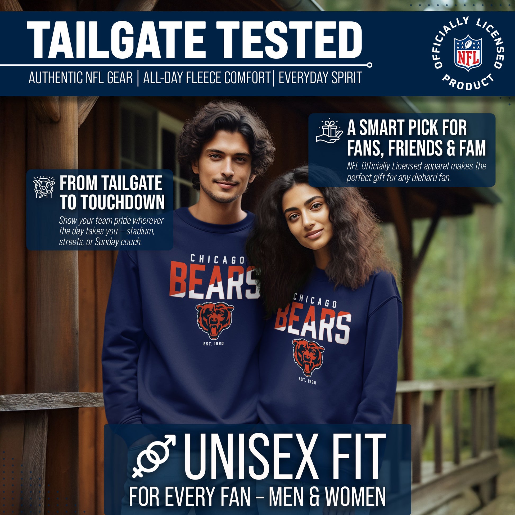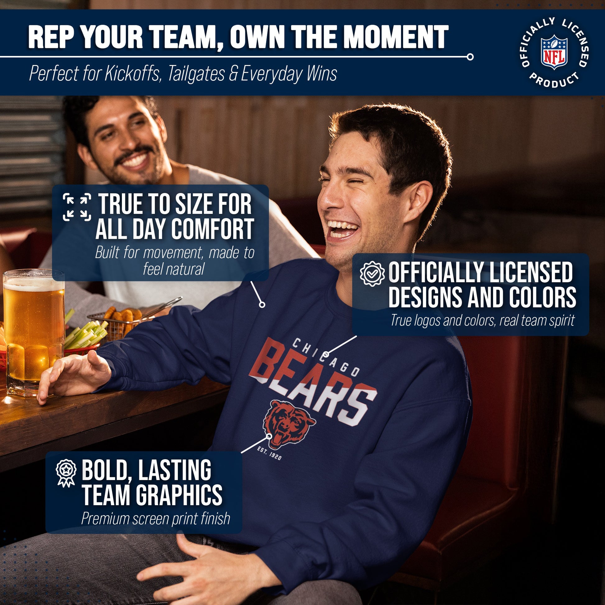 Score with Team Fan Apparel, the ultimate destination for officially licensed NFL apparel for men and women. We use only the highest quality screen printing techniques to bring you the most comfortable, durable, and stylish clothing possible. Go ahead and show your team pride at the big game or any time! This premium crewneck fits both male and female adults and comes in small, medium, large, XL, and XXL. So needless to say, it fits Chicago Bears fans of all types! Maybe you aren't a Bears fan but you know someone who is? Don't worry! This high-quality crewneck is soft, lightweight, breathable and a GREAT gift for any birthday, anniversary, Father's Day, Mother's day, you name it! So, if you want to stand out as the #1 fan at the next big game or watch party, you're going to want to be wearing one of these great football crews.