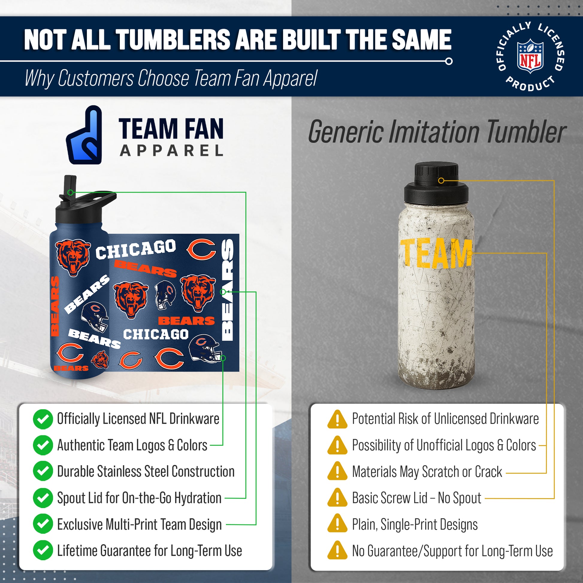 Keep Your Chicago Bears Team Spirit and Drinks Handy On-the-Go with the NFL Native Quencher Water Bottle! Whether you're heading to the gym or tailgating at the game, this 34oz Bears water bottle is the perfect companion for any fan. Made from durable stainless steel, it's designed to keep your drinks hot or cold for hours. The no-leak dual option lid allows you to sip through a straw or drink straight from the spout. But it's not just for water! This versatile bottle can also hold your favorite coffee, tea, & more. With its insulated design, your beverages will stay at their desired temperature until you're ready for them. Featuring your team's logo & colors, this water bottle proudly displays your loyalty while keeping you hydrated. And when it's time for a refill, simply take off the lid and fill up again. Cheers to staying hydrated in style with the Chicago Bears Water Bottle! Hand wash only! Great for yourself or any fan in your life, especially for on-the-go and travel!