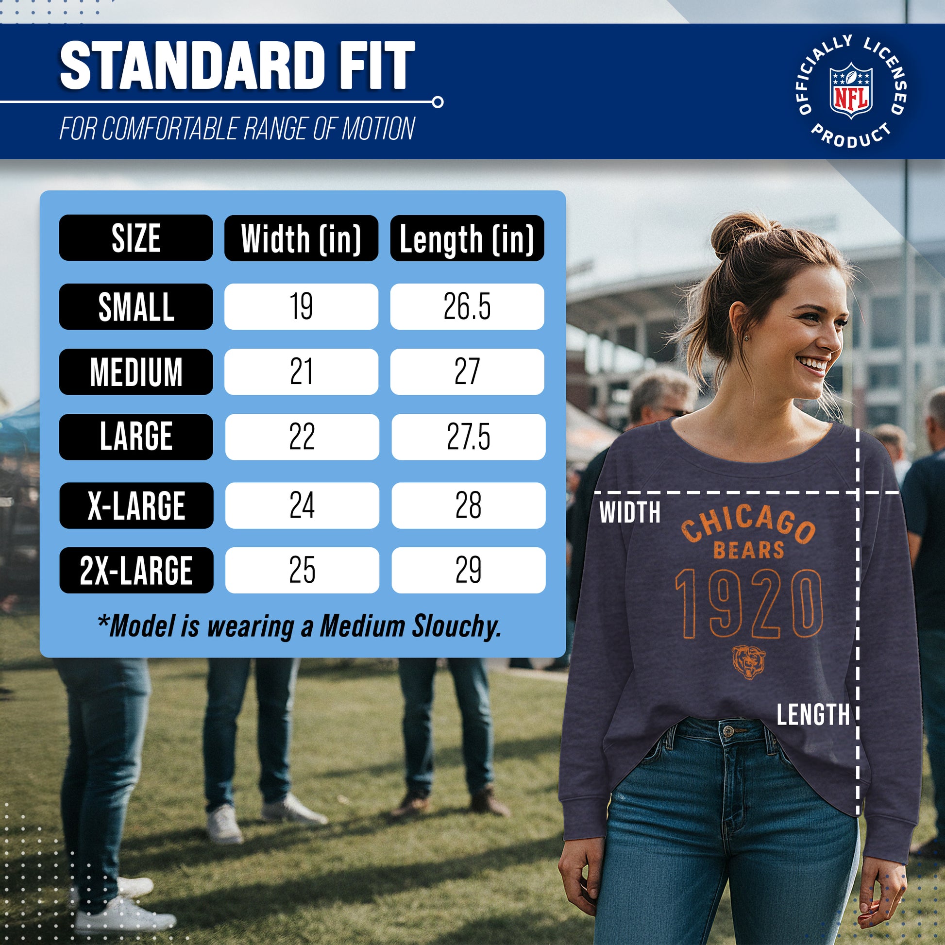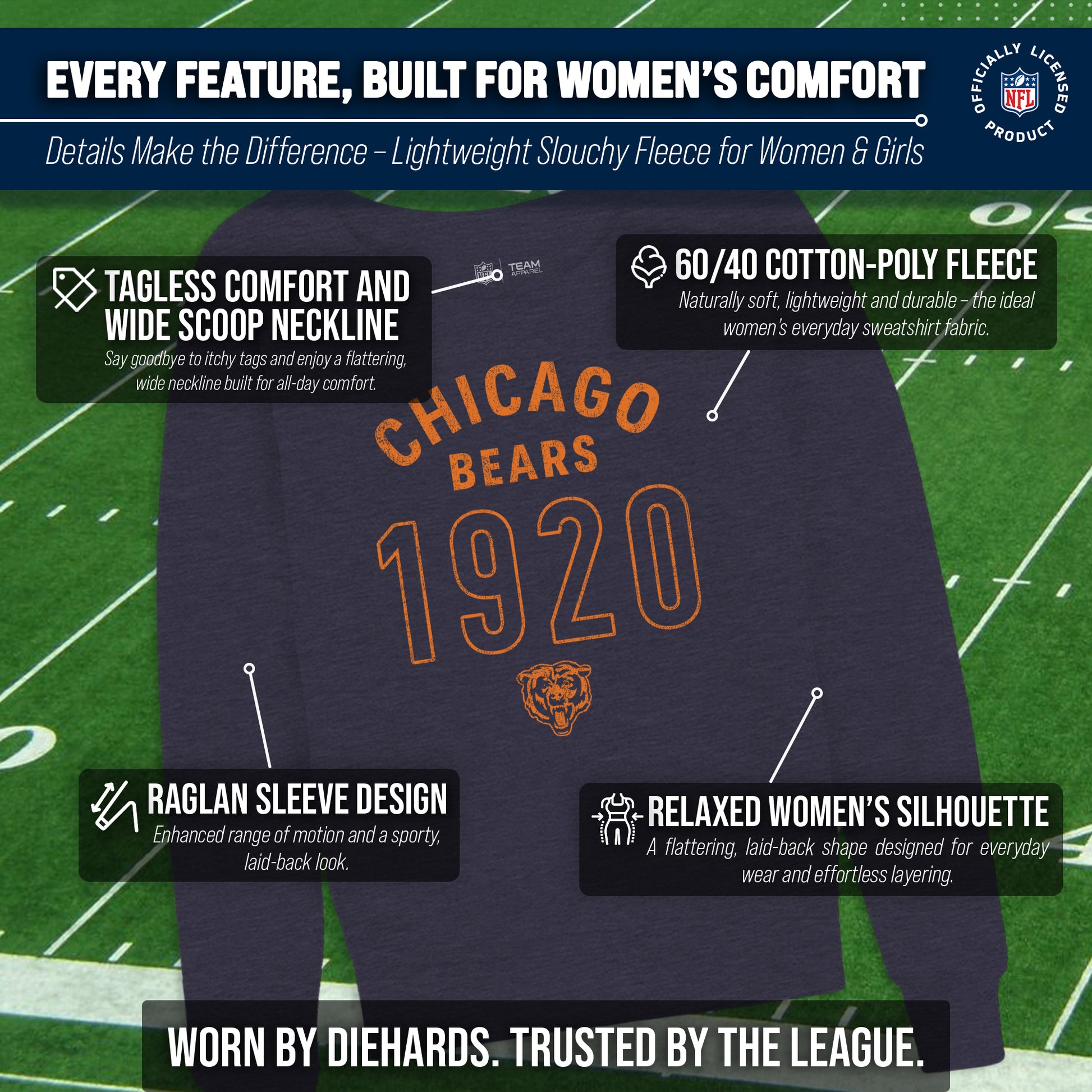 Hey there, fellow lady football fans! Show off your team pride in style with our Team Fan Apparel Chicago Bears NFL Women's Big Date Slouchy Crewneck Fleece Pullover. Made with extra soft cotton polyester fleece material, this long sleeve pullover sweatshirt will keep you warm and cozy on game day or any chilly day. With a tagless design, you won't have to worry about any annoying tags distracting you from cheering on your team. Featuring the year your favorite team was established in a large font design and relaxed fit, this pullover adds a touch of fashion to your game day wardrobe. Available in a range of women's sizes, it's the perfect addition to any fan's closet. Whether you're headed to the stadium or watching from home, stay cool and stylish with this must-have piece of Bears apparel. Don't let snow or cold weather dampen your team spirit - grab one for yourself or as a gift for the ultimate football-loving lady in your life! Go Bears!