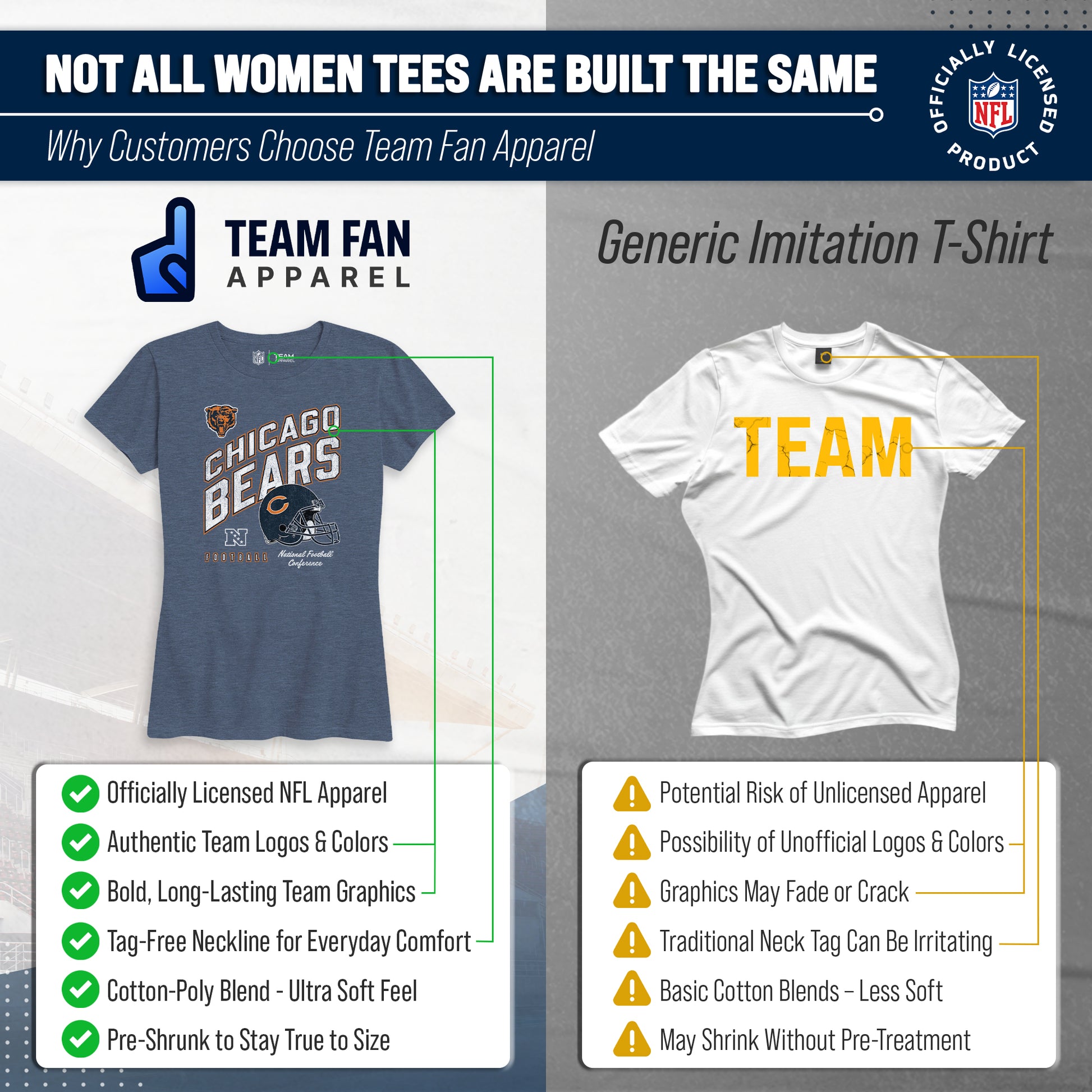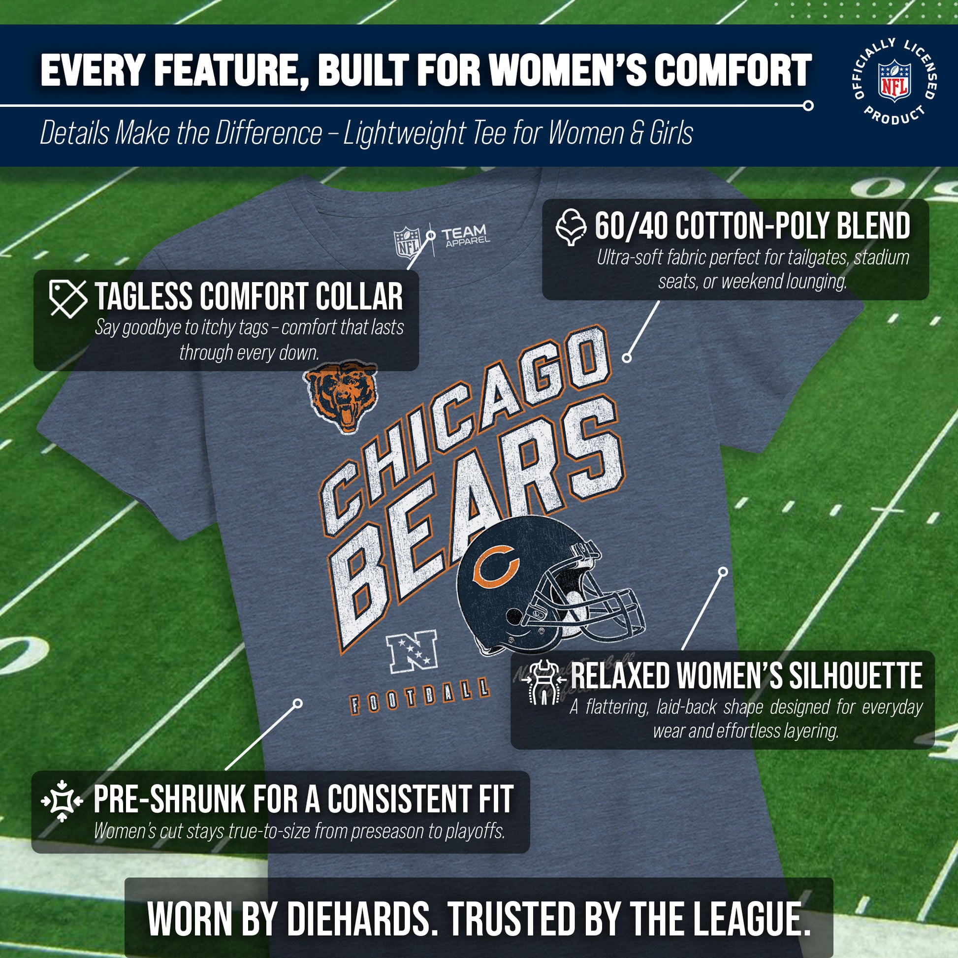 Calling all ladies! Get ready to rock game day with the Women's Team Fan Apparel Distressed Helmet T-Shirt! This comfortable and stylish Chicago Bears womens tee is perfect for any female football fan, whether you're cheering on your favorite team at the stadium or watching from home. Made from a super soft cotton fabric , this shirt will keep you cool and comfortable all game long. The helmet, team name, team logo and official team color adds a touch of retro flair, while the tag-less design ensures itch-free wear. Whether you're a die-hard fan or just love a good simple look, this shirt is perfect for showing off your team spirit. Available in a wide range of women's sizes, it's suitable for all shapes and sizes! So grab your girlfriends and get ready to cheer on your team in style with the Women's Team Fan Apparel Distressed Helmet T-Shirt!