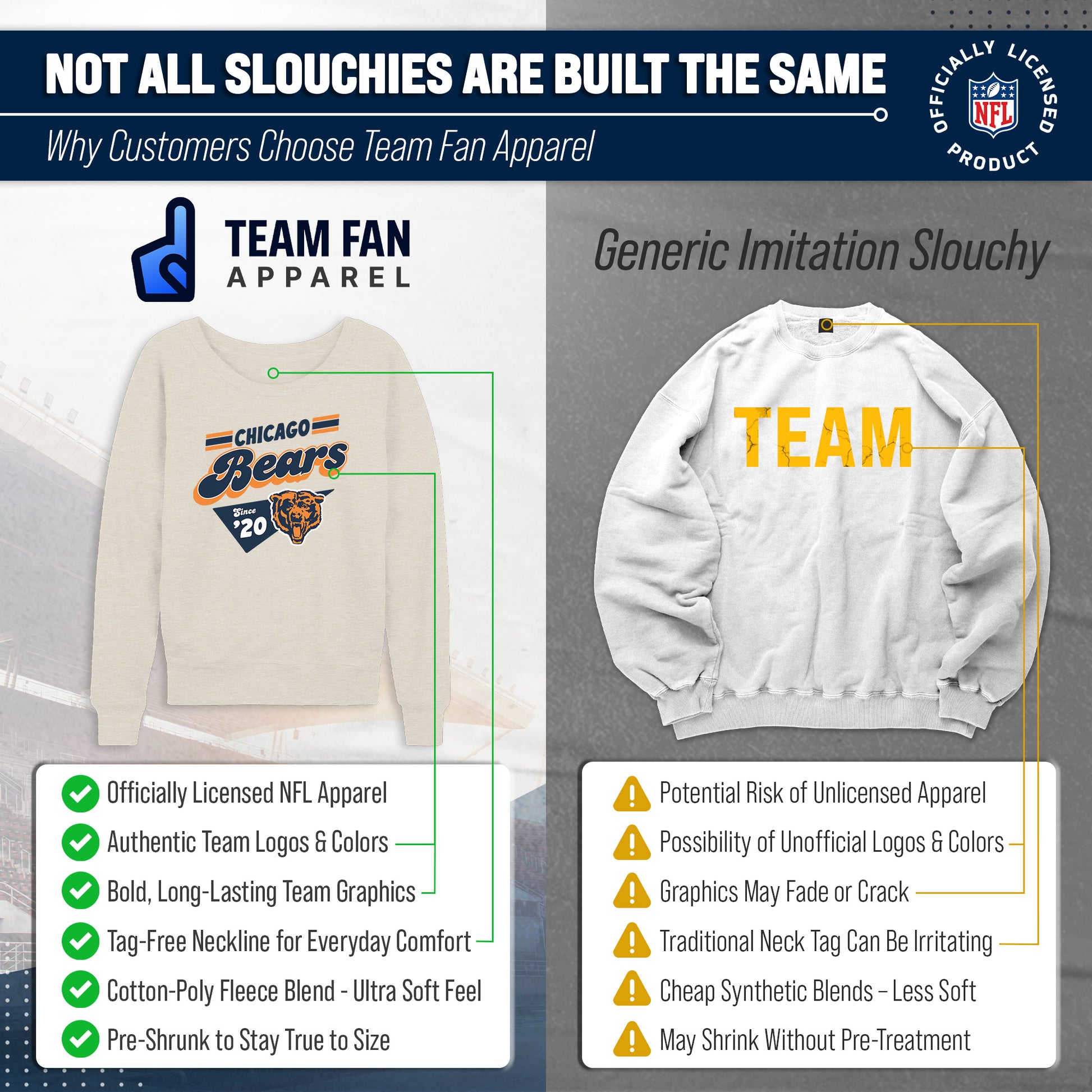 Hey there, fellow lady football fans! Show off your team pride in style with our Team Fan Apparel Chicago Bears NFL Women's Vinntage Charm Slouchy Crewneck Fleece Pullover. Made with extra soft cotton polyester fleece material, this long sleeve pullover sweatshirt will keep you warm and cozy on game day or any chilly day. With a tagless design, you won't have to worry about any annoying tags distracting you from cheering on your team. Featuring a 90's design and relaxed fit, this pullover adds a touch of fashion to your game day wardrobe. Available in a range of women's sizes, it's the perfect addition to any fan's closet. Whether you're headed to the stadium or watching from home, stay cool and stylish with this must-have piece of Bears apparel. Don't let snow or cold weather dampen your team spirit - grab one for yourself or as a gift for the ultimate football-loving lady in your life! Go Bears!