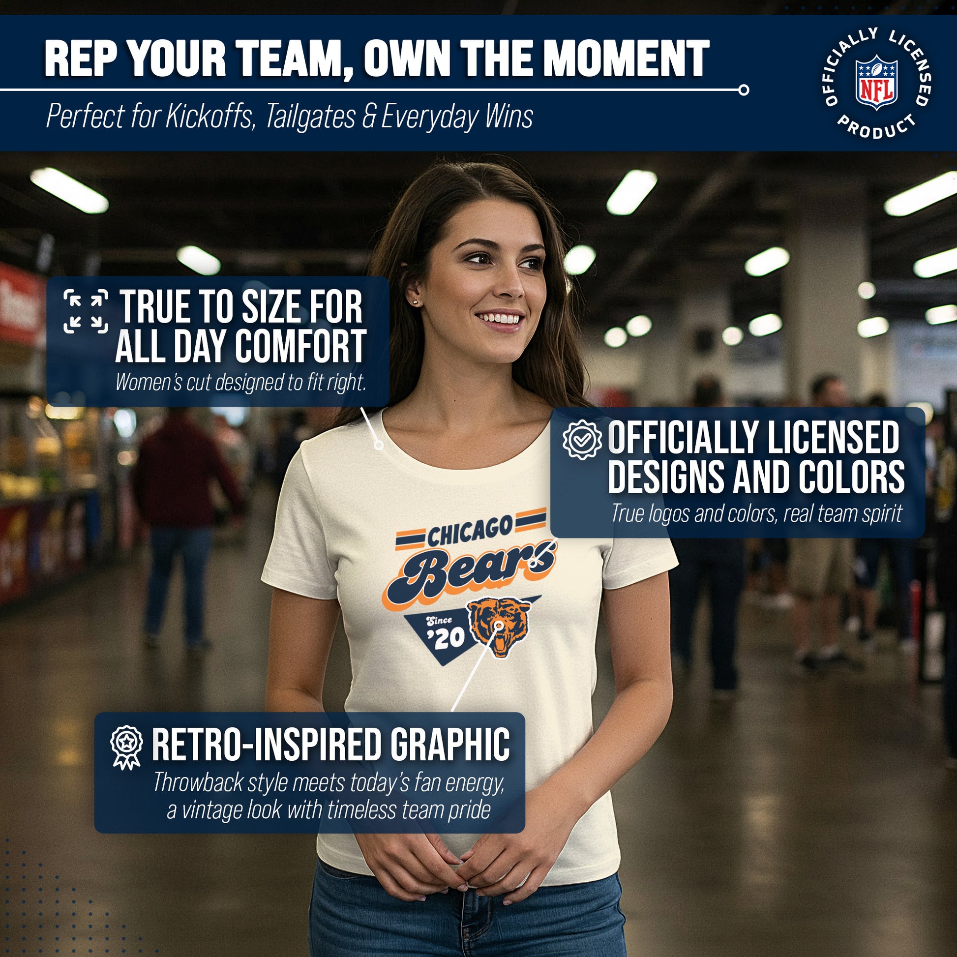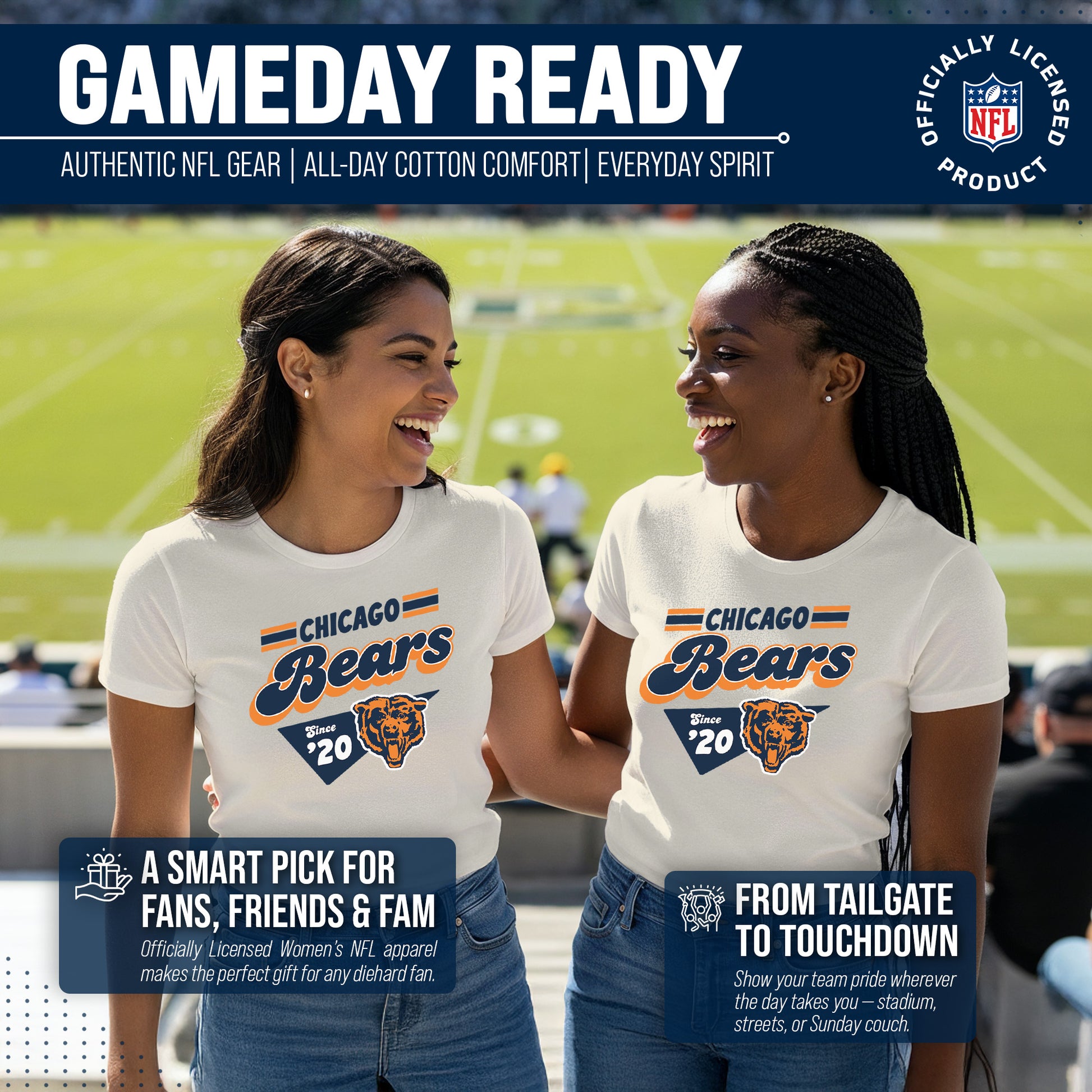 Calling all ladies! Get ready to rock game day with the Women's Team Fan Apparel Vintage Charm T-Shirt! This comfortable and stylish Chicago Bears womens tee is perfect for any female football fan, whether you're cheering on your favorite team at the stadium or watching from home. Made from a super soft cotton fabric , this shirt will keep you cool and comfortable all game long. The pennant design, team name, and team logo adds a touch of retro flair, while the tag-less design ensures itch-free wear. Whether you're a die-hard fan or just love a good simple look, this shirt is perfect for showing off your team spirit. Available in a wide range of women's sizes, it's suitable for all shapes and sizes! The birch-colored garment will match well with everything in your closet! So grab your girlfriends and get ready to cheer on your team in style with the Women's Team Fan Apparel Vintage Charm T-Shirt!