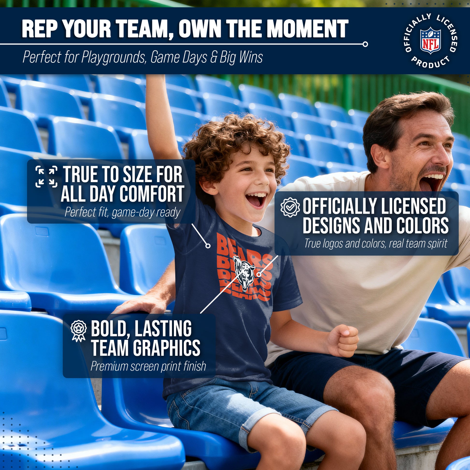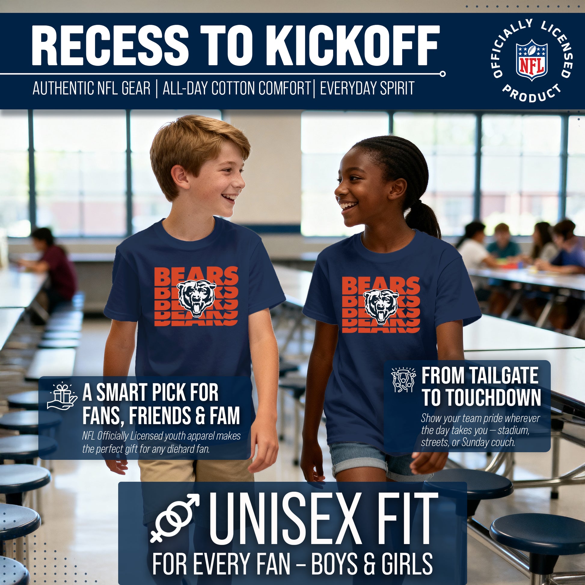 Chicago Bears NFL Youth Repeating Logo Football T-Shirt Unisex Tag Free Comfortable - Navy