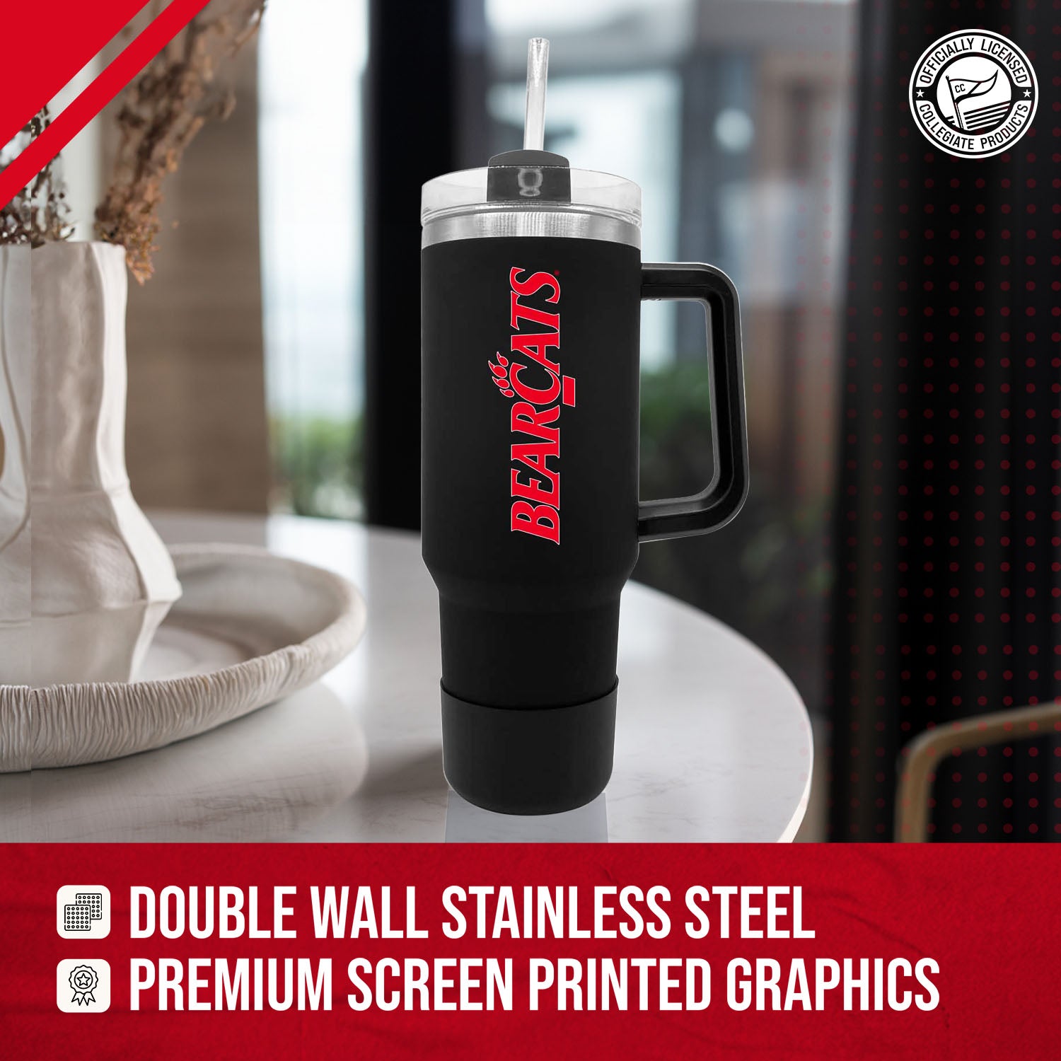 Our stainless steel 40 oz tumblers with handle and straw are designed for constant use in any type of setting! At a sports game? These insulated tumblers are compact and can fit in most cup holders and even feature a no slip grip on the bottom to keep condensation away! On the move? Our contoured spout or straw options makes it easy to sip on the go! No matter the setting, show your school pride while properly and efficiently preserving the desired temperature of your beverage! This Cincinnati  Bearcats travel tumbler also makes a great gift! Combine the 40 oz Cincinnati tumbler with a Cincinnati pillow or a Cincinnati blanket and give a whole haul of Bearcats gear to your favorite alumni! All of our products feature the officially licensed team colors, logos and lettering. We don't skimp on quality in any way. The colors are always vibrant and the graphics are always accurate and brimming with team spirit.