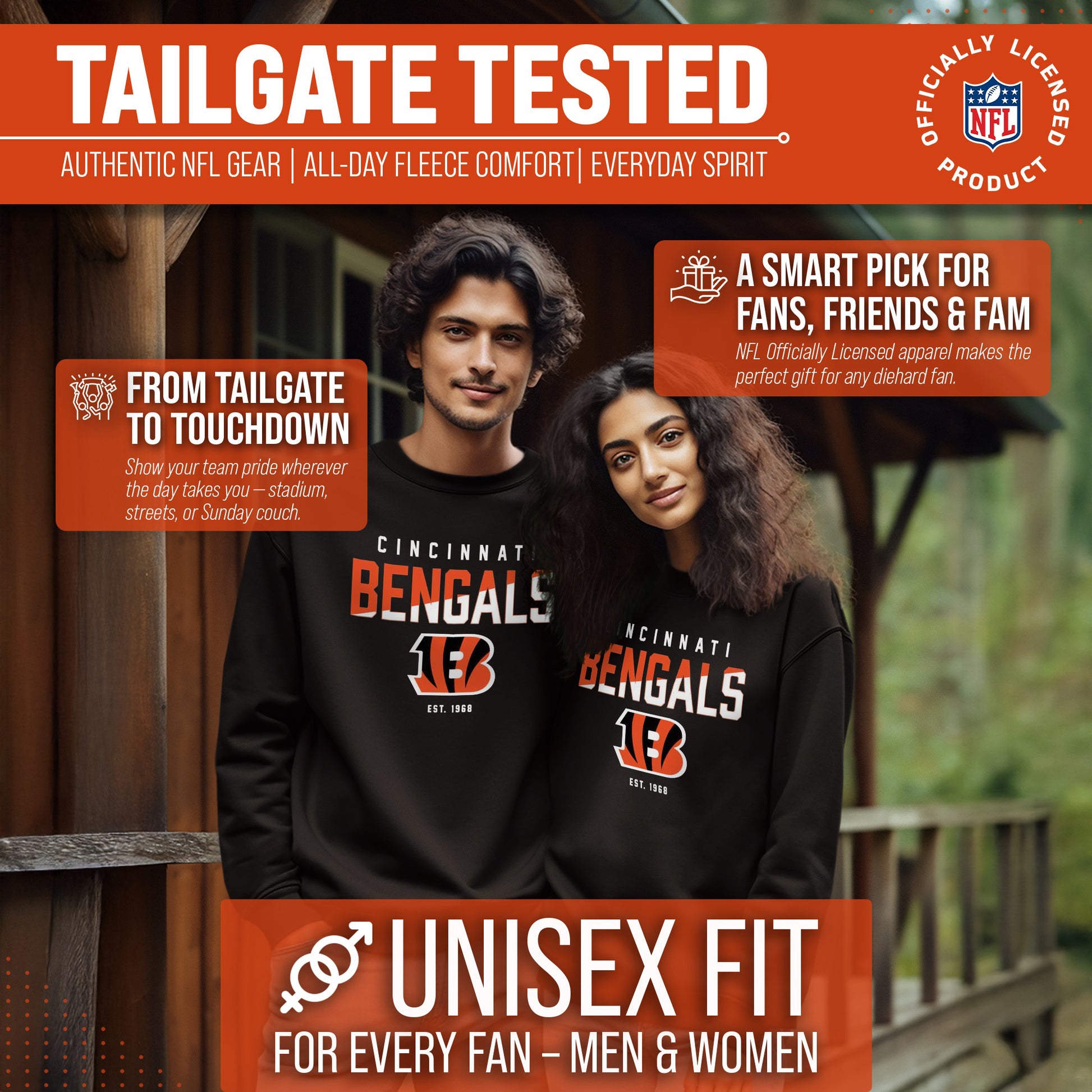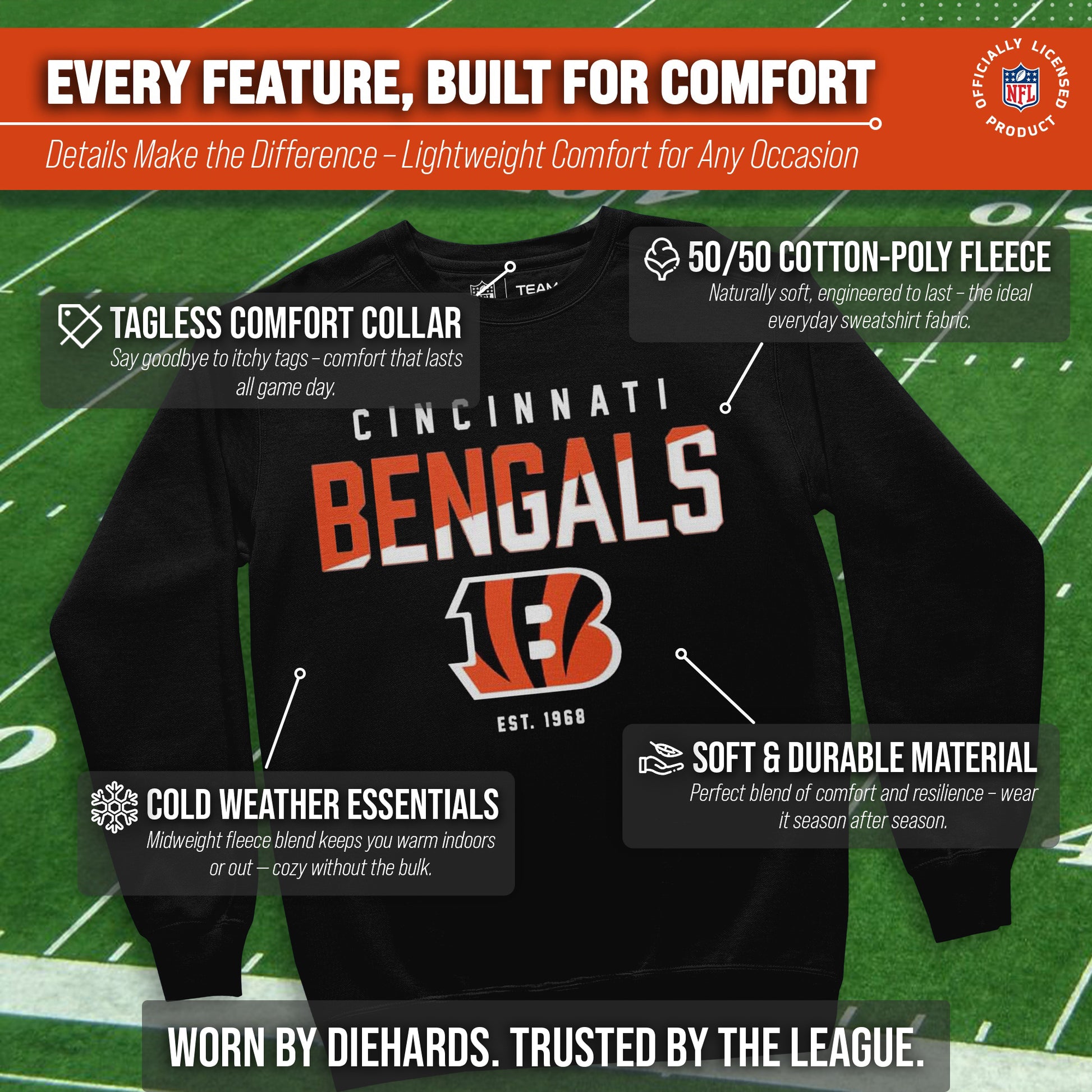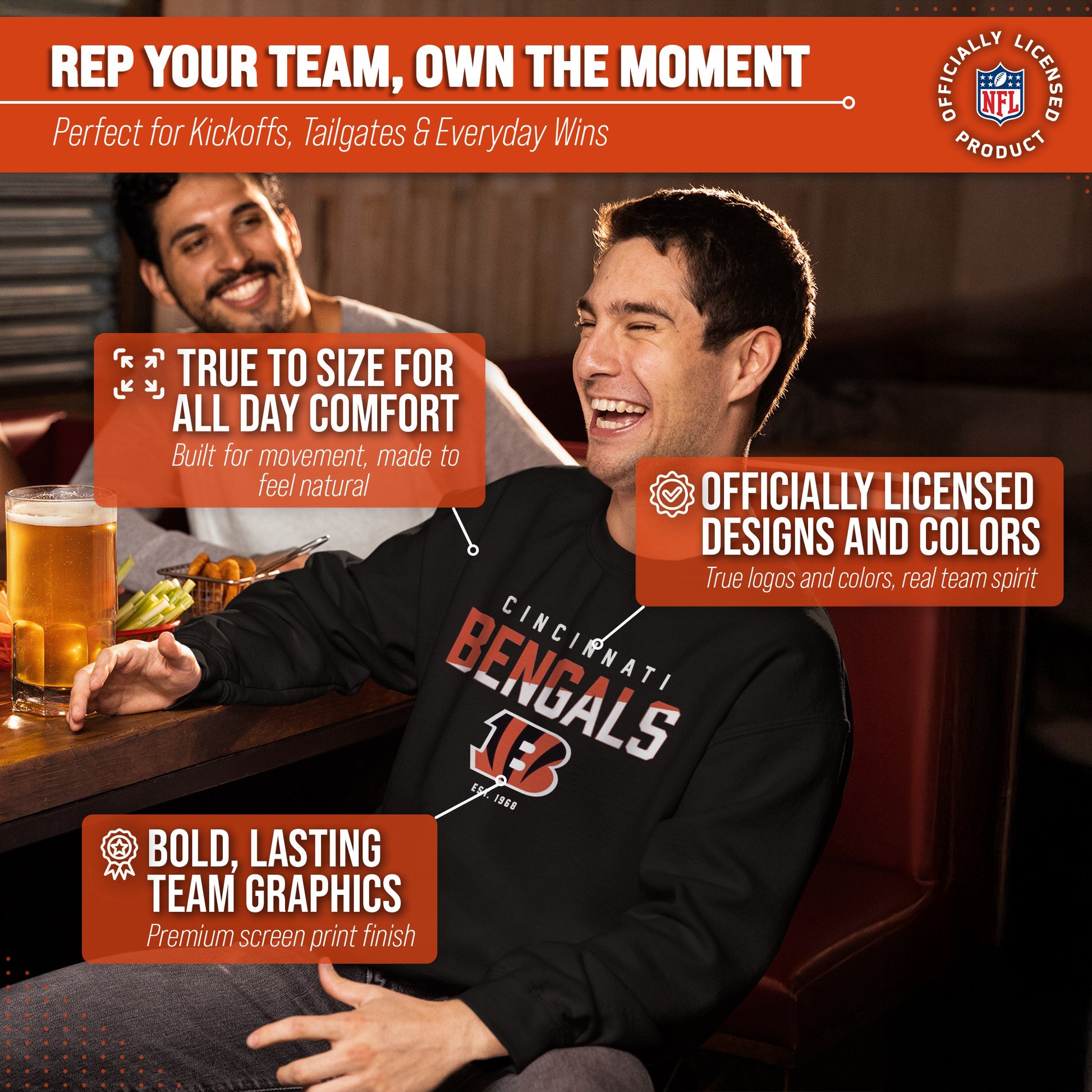 Score with Team Fan Apparel, the ultimate destination for officially licensed NFL apparel for men and women. We use only the highest quality screen printing techniques to bring you the most comfortable, durable, and stylish clothing possible. Go ahead and show your team pride at the big game or any time! This premium  crewneck fits both male and female adults and comes in small, medium, large, XL, and XXL. So needless to say, it fits Cincinnati Bengals fans of all types! Maybe you aren't a Bengals fan but you know someone who is? Don't worry! This high-quality crewneck is soft, lightweight, breathable and a GREAT gift for any birthday, anniversary, Father's Day, Mother's day, you name it! So, if you want to stand out as the #1  fan at the next big game or watch party, you're going to want to be wearing one of these great football crews.