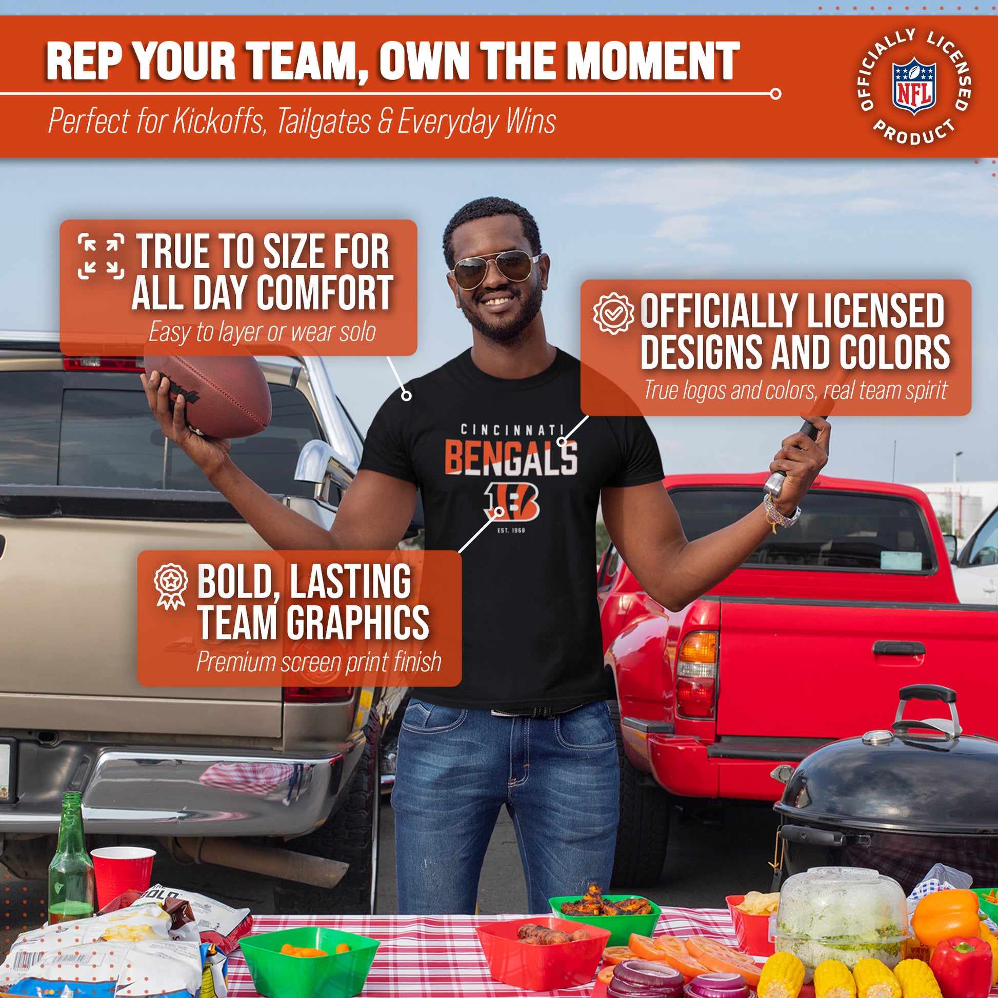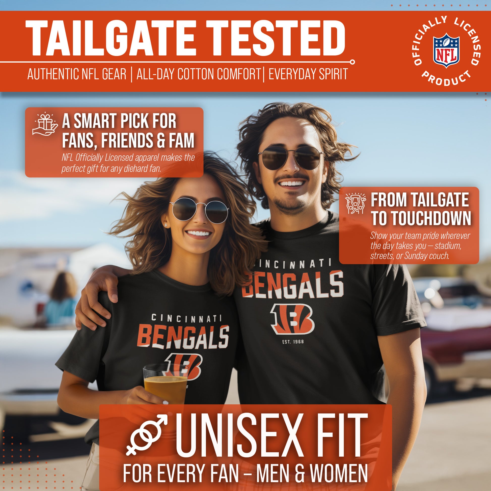 Score with Team Fan Apparel, the ultimate destination for officially licensed NFL apparel for men and women.  We use only the highest quality screen printing techniques to bring you the most comfortable, durable, and stylish clothing possible. Go ahead and show your team pride at the big game or any time! This premium  t-shirt fits both male and female adults and comes in small, medium, large, XL, and XXL. So needless to say, it fits Cincinnati Bengals fans of all types! Maybe you aren't a Bengals fan but you know someone who is? Don't worry! This high-quality t-shirt is soft, lightweight, breathable and a GREAT gift for any birthday, anniversary, Father's Day, Mother's day, you name it! So, if you want to stand out as the #1  fan at the next big game or watch party, you're going to want to be wearing one of these hockey t-shirts.