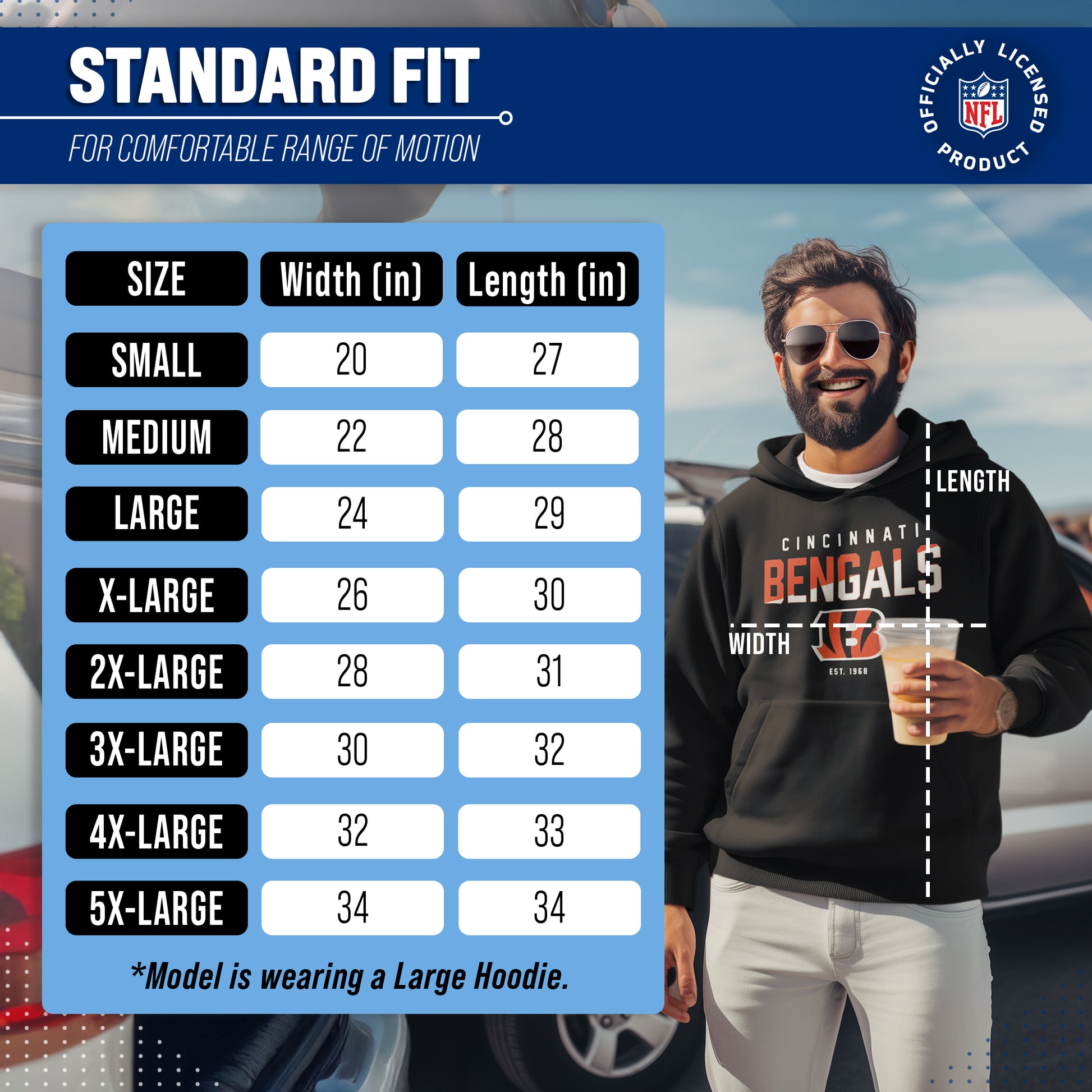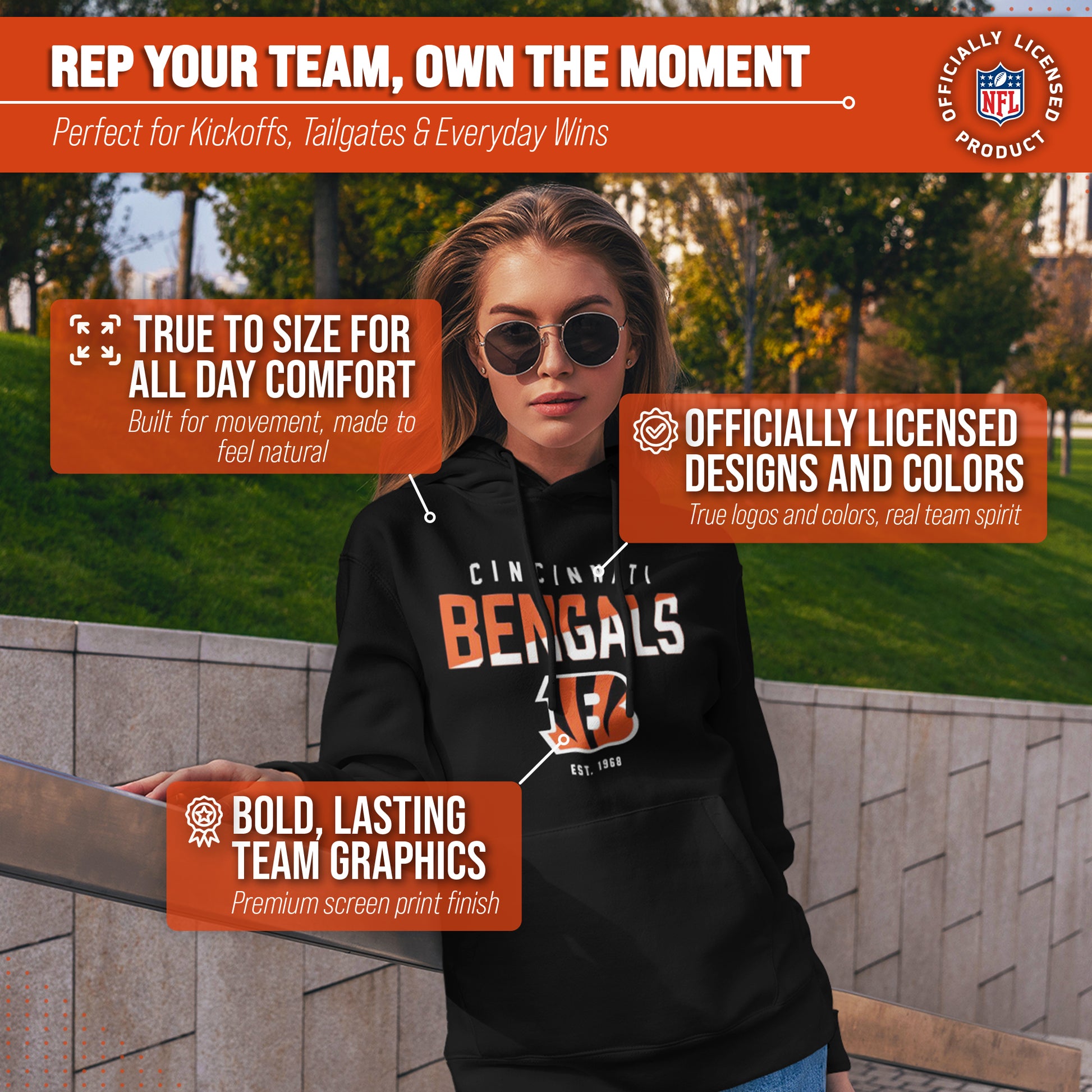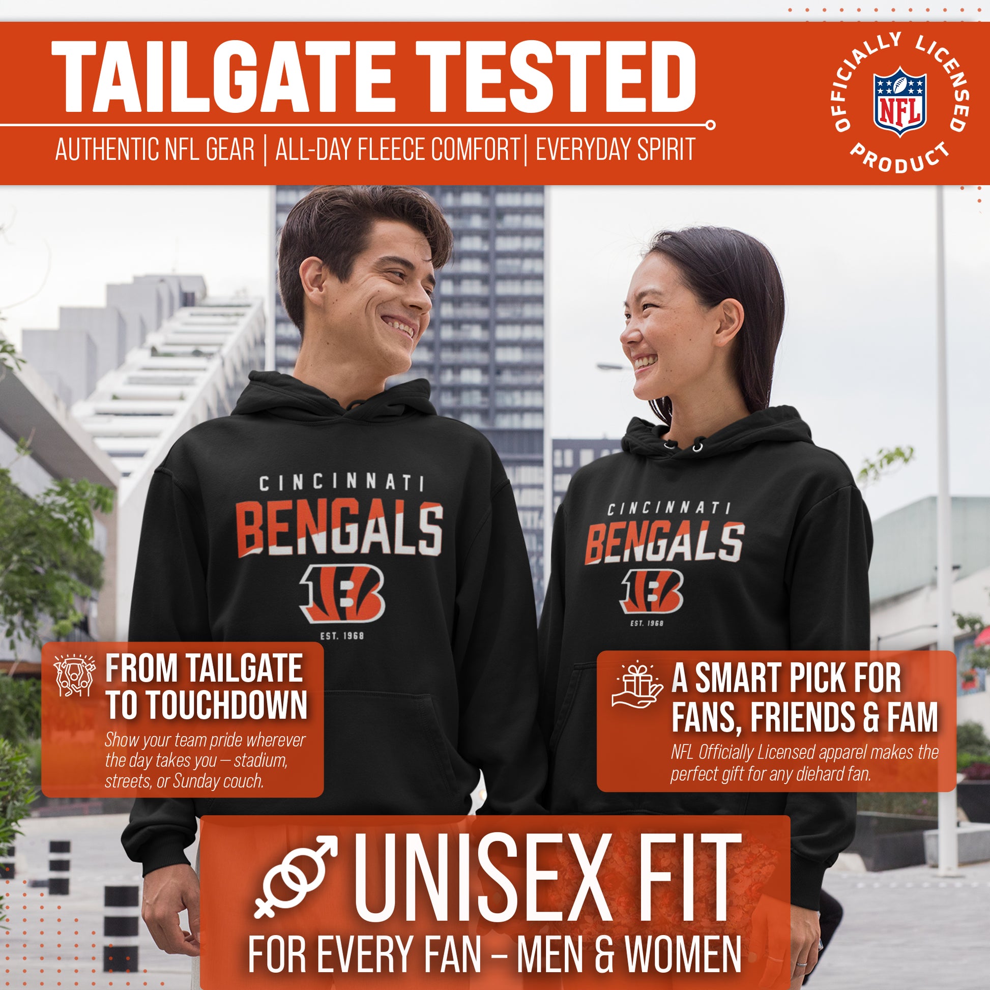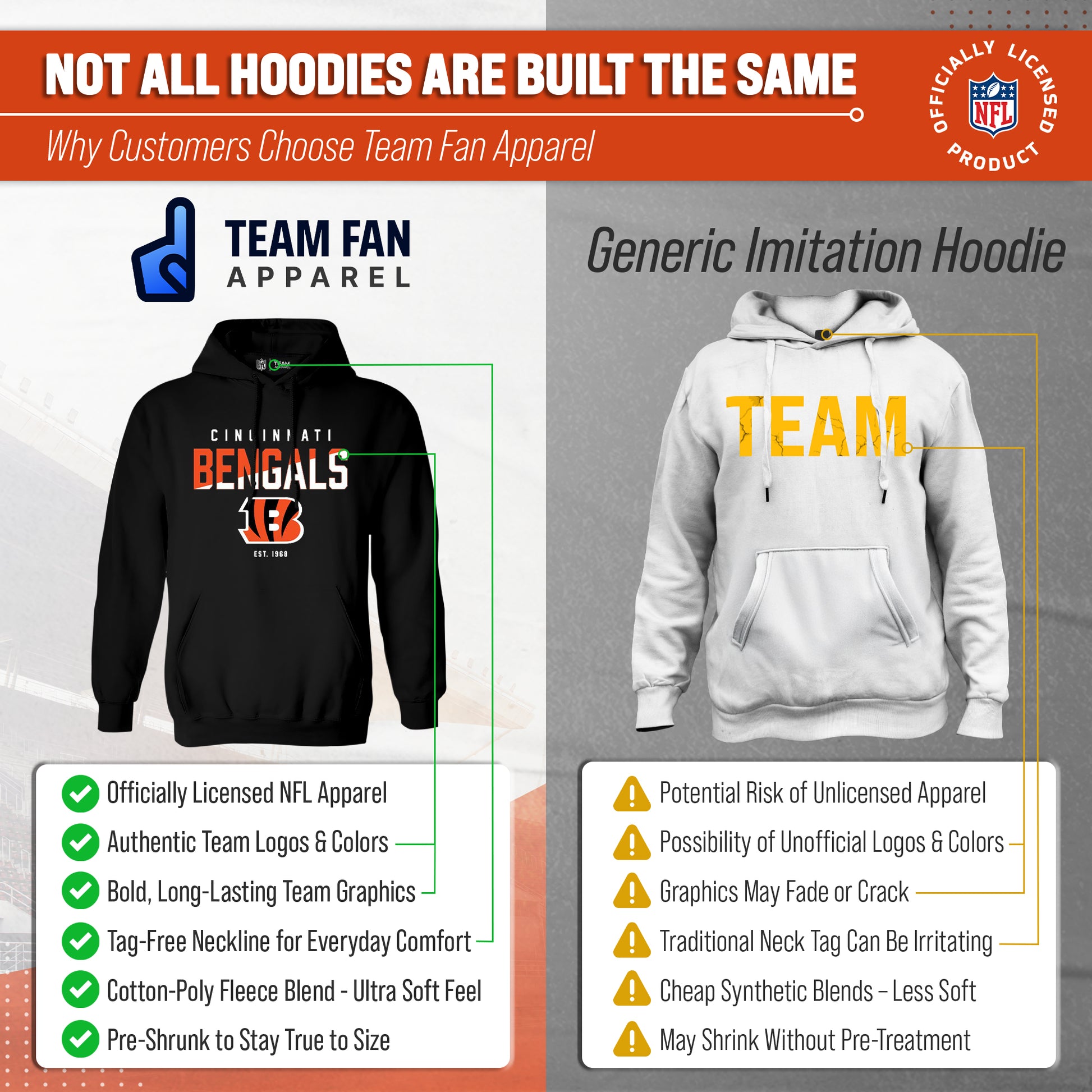 Score with Team Fan Apparel, the ultimate destination for officially licensed NFL apparel for men and women.  We use only the highest quality screen printing techniques to bring you the most comfortable, durable, and stylish clothing possible. Go ahead and show your team pride at the big game or any time! This premium hooded sweatshirt fits both male and female adults and comes in small, medium, large, XL, and XXL. So needless to say, it fits Cincinnati Bengals fans of all types! Maybe you aren't a Bengals fan but you know someone who is? Don't worry! This high-quality sweatshirt is soft, lightweight but cozy, breathable and a GREAT gift for any birthday, anniversary, or Christmas gift; Father's Day, Mother's day, you name it! The front pouch pocket, drawstring hood, and soft fleece will keep you warm and keep your fandom hot! So, if you want to stand out as the #1  fan at the next big game, tailgate or watch party, you're going to want to be wearing one of these diagonal fade hooded sweatshirts