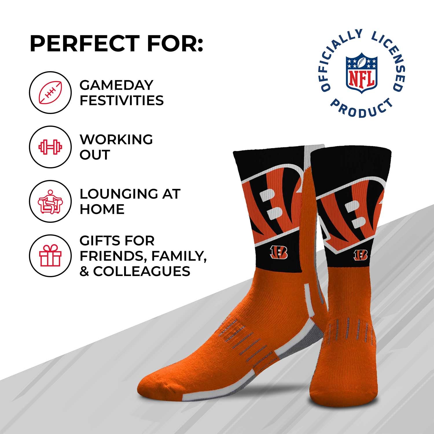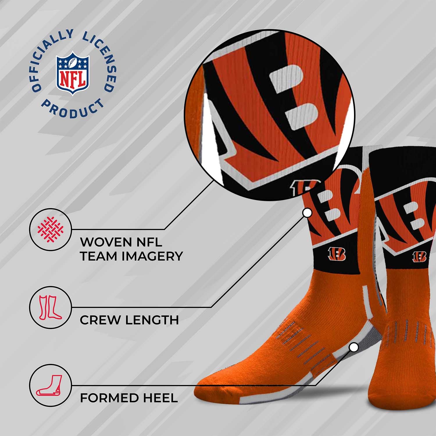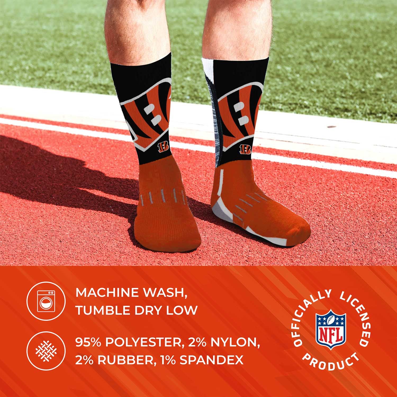 These Cincinnati Bengals socks for children are great for showing off your Cincinnati pride from head to toe. The unisex Cincinnati youth socks are comfortable. The crew length and poly-spandex blend featuring a supportive formed heel make them a comfortable choice for showcasing your love for your team all year long.    Cincinnati youth socks are great additions to a collection of Cincinnati Bengals stuff. Wear them with shorts, your favorite jersey, and Cincinnati Bengals shoes for a superfan look, or rock them in the office for an alternative to argyle on casual friday. On a lazy day, wear them with your underwear or pajamas and Cincinnati Bengals house shoes while you put your feet up and enjoy a game in the house.    Cincinnati Bengals youth socks make great birthday gifts for all ages.    The officially-licensed team logo, colors, and graphics make these socks the Cincinnati socks kid superfans will love. Fabric content is 95% polyester, 2% nylon, 2% rubber, and 1% spandex. Machine washable, tumble dry low.