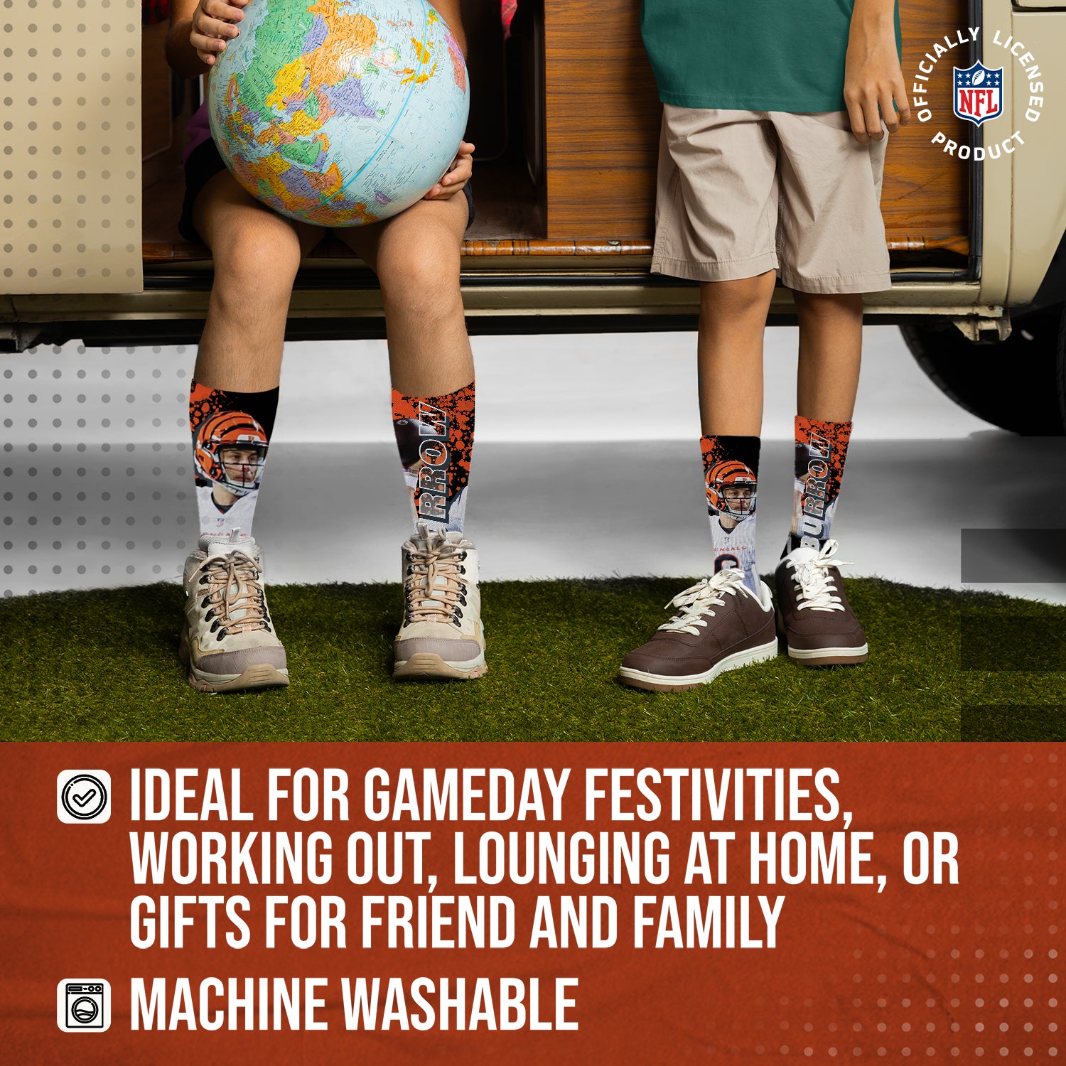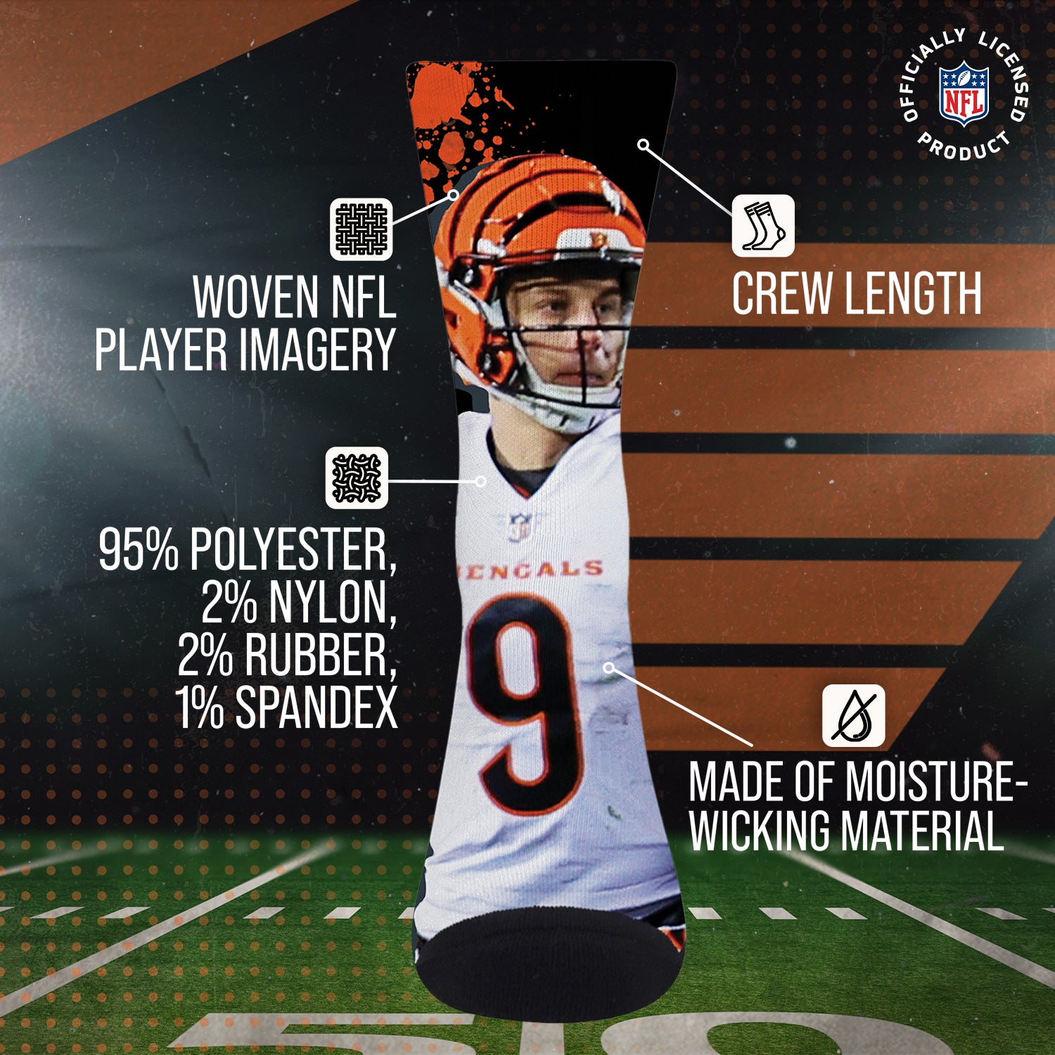 These Youth Cincinnati Bengals Player Stripe Crew Socks are great for showing off your Bengals pride from head to toe. These unisex socks are comfortable, and are available in a youth size fitting 13 - 5. The crew length and poly-spandex blend featuring a supportive formed heel make them a comfortable choice for showcasing your love for your favorite player and your Bengals pride all year long. These youth socks will be your new favorite game day accessory. Wear them with your favorite Cincinnati Bengals shirt or jersey, to practice or a friends house for a true superfan gameday look, or rock them to school. Put them on with a Bengals shorts while you exercise, or pair them with pajamas while you put your feet up and enjoy the game in the house. These player stripe crew socks are so comfortable, you can even keep them on when you go to sleep! The woven likeness of your favorite player and officially-licensed Cincinnati Bengals colors and graphics make these crew socks so authentic you'll wish they were autographed. Fabric content is 95% polyester, 2% nylon, 2% rubber, and 1% spandex. Machine washable, tumble dry low.