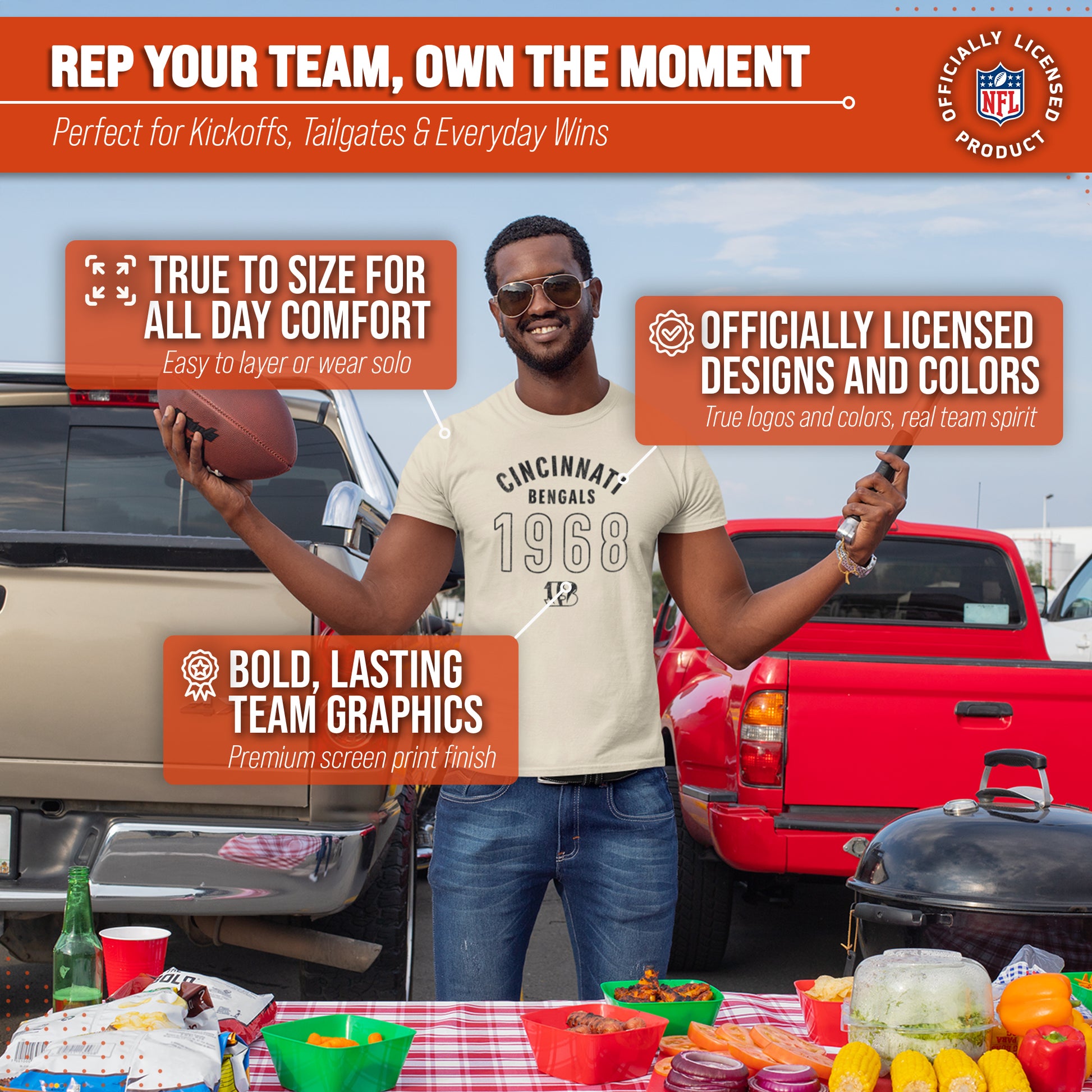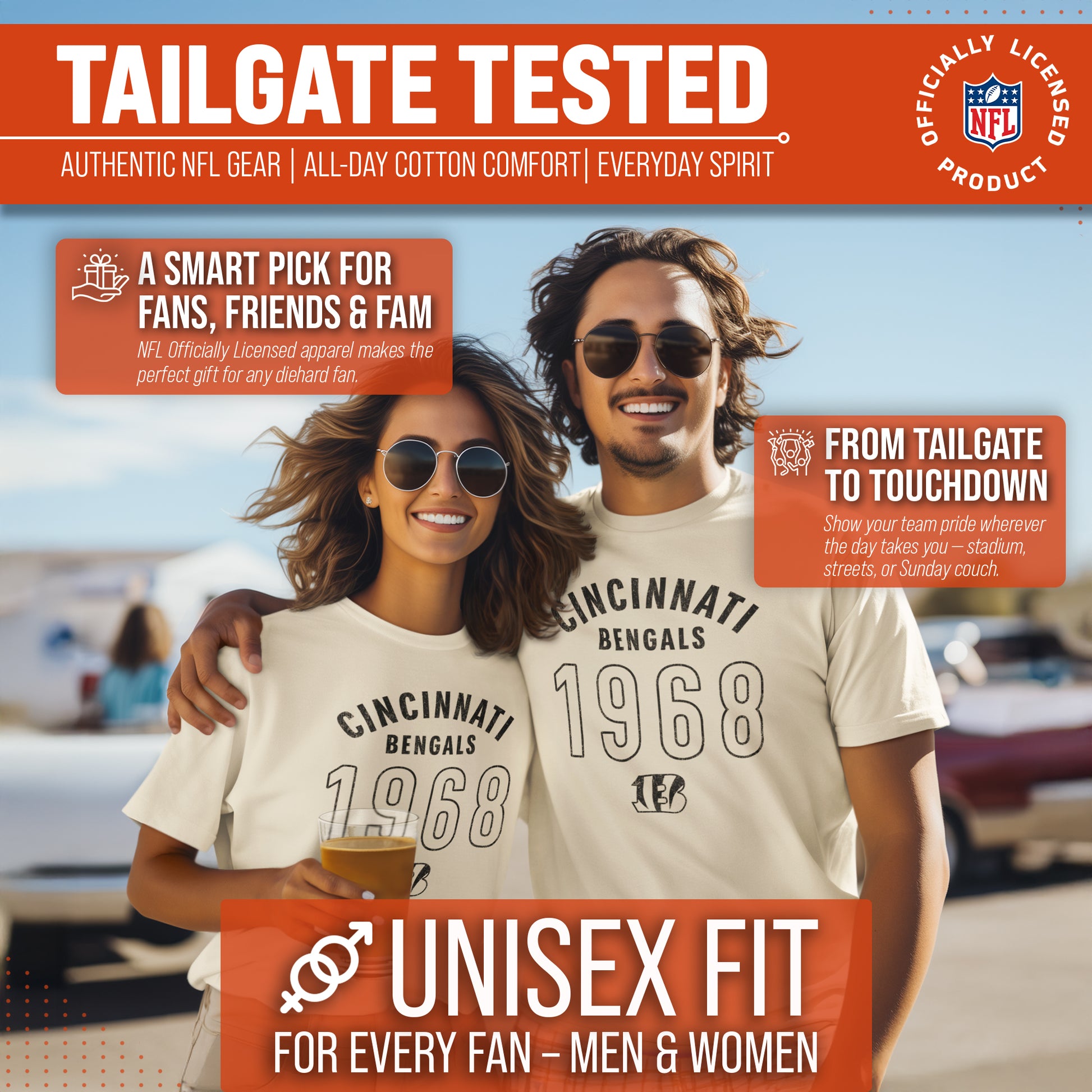 Show off your team spirit in style with our Team Fan Apparel Cincinnati Bengals NFL Big Date Tag-Less T-Shirt!  Made for both men and women, this unisex t-shirt is the perfect addition to any football fan's wardrobe. With its soft and comfortable cotton blend fabric, you'll love wearing it to games or just lounging at home. The tag-less design ensures maximum comfort without any annoying tags scratching at your neck.  Featuring the year your favorite team was established in a large centered font along with the official team logo, this shirt will make you stand out from the crowd and show off your die-hard fandom. It comes in multiple sizes, so you can choose the one that fits best & represents your team spirit.  Whether you're cheering on your Bengals at the stadium or watching from home, our NFL Big Date Tag-Less T-Shirt is a must-have for all fans! So grab yours today and support your team in comfort and style. Go team!