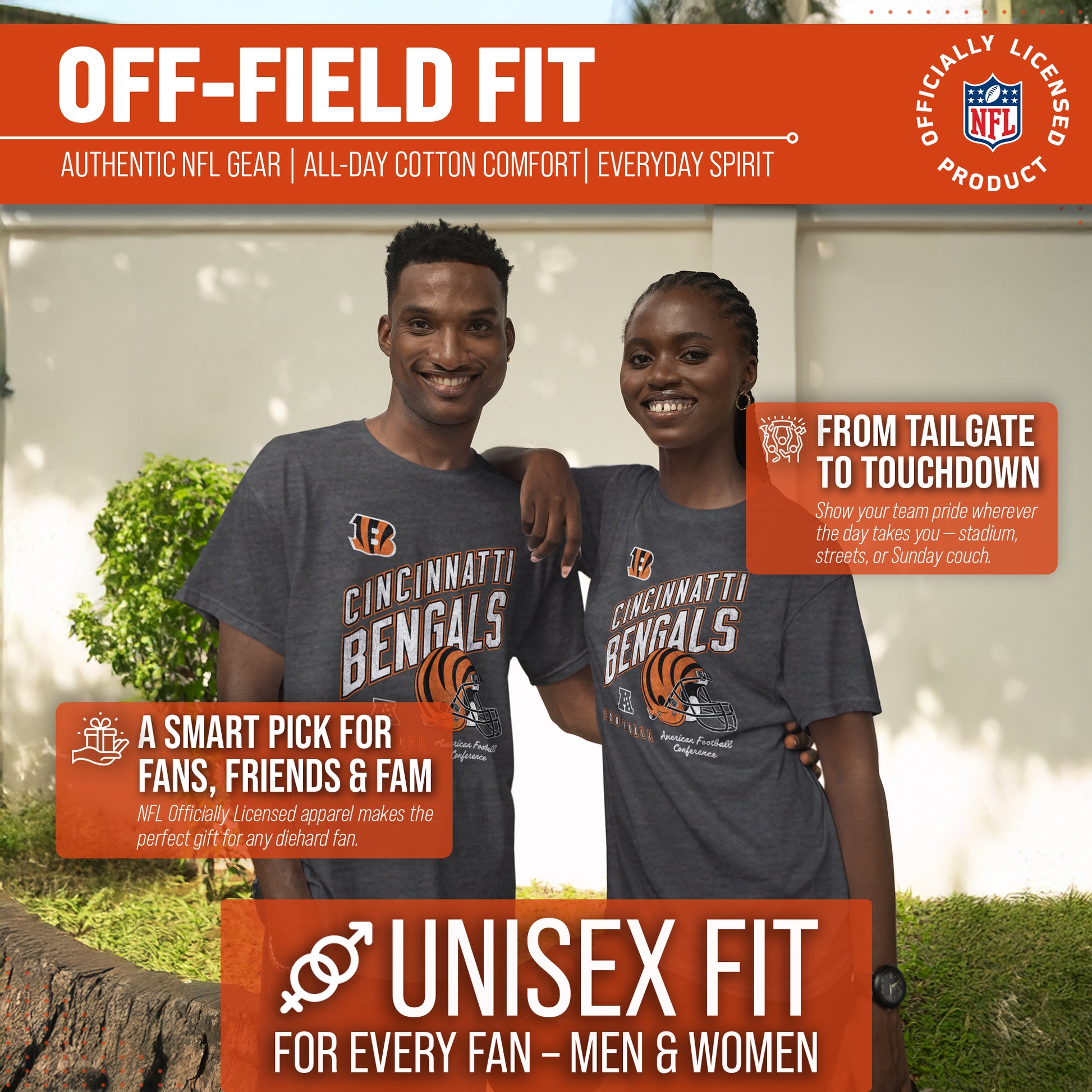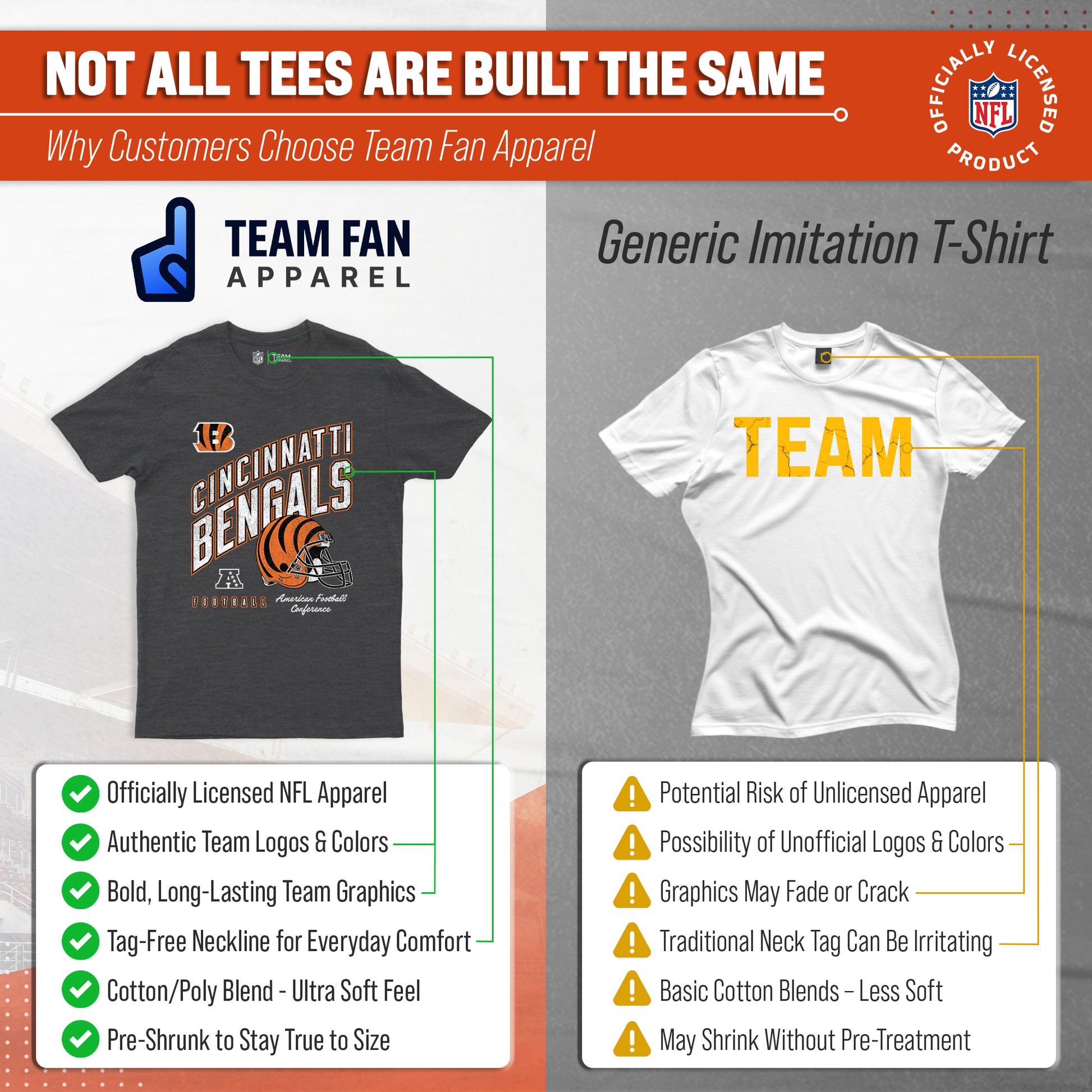 Show off your team spirit in style with our Team Fan Apparel Cincinnati Bengals NFL Distressed Helmet Tag-Less T-Shirt!  Made for both men and women, this unisex t-shirt is the perfect addition to any football fan's wardrobe. With its soft and comfortable cotton blend fabric, you'll love wearing it to games or just lounging at home. The tag-less design ensures maximum comfort without any annoying tags scratching at your neck.  Featuring a large vibrant helmet design with the team name printed largely, along with the official team logo, this shirt will make you stand out from the crowd and show off your die-hard fandom. It comes in multiple sizes, so you can choose the one that fits best & represents your team spirit.  Whether you're cheering on your Bengals at the stadium or watching from home, our NFL Distressed Helmet Tag-Less T-Shirt is a must-have for all fans! So grab yours today and support your team in comfort and style. Go team!
