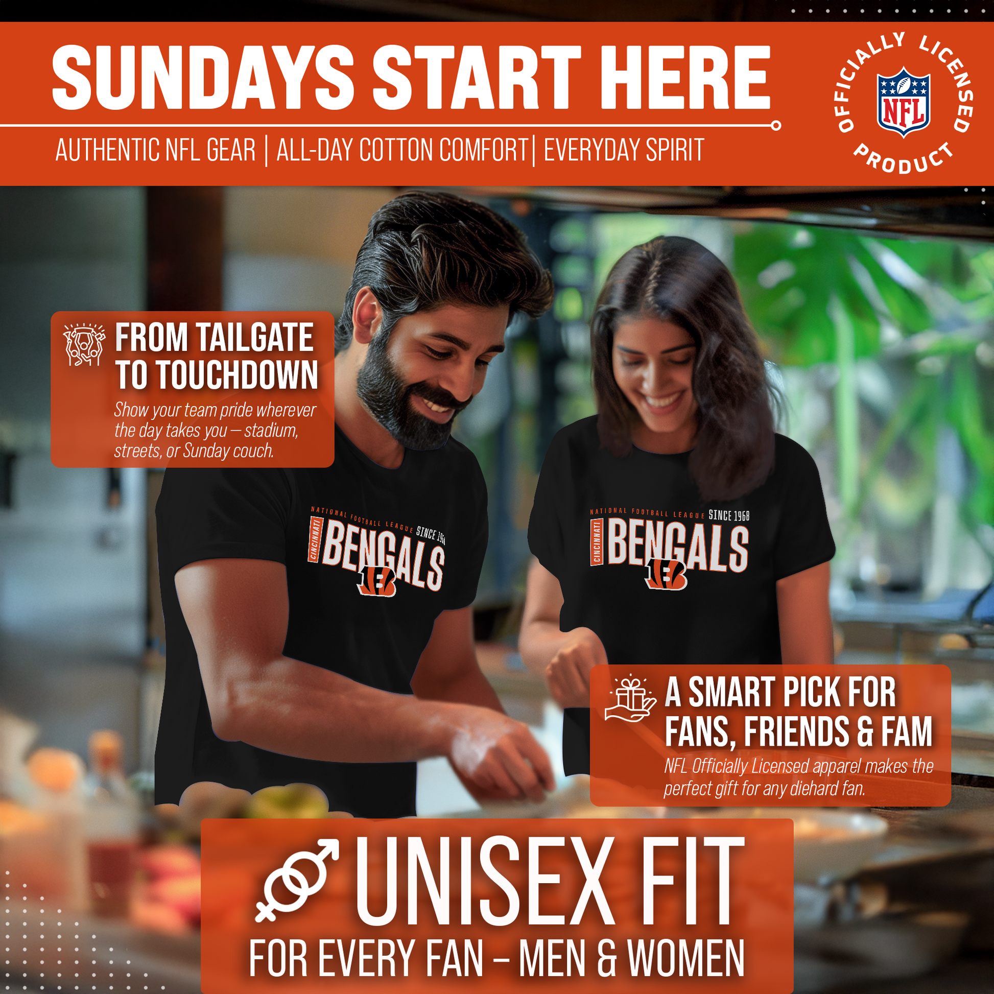 Show off your team pride in style with the officially licensed Team Fan Apparel Cincinnati Bengals NFL Modern Endzone Tag-Less T-Shirt! Designed for both men and women, this versatile unisex tee is the ultimate staple for every football fan’s wardrobe. Whether you’re heading to the stadium, joining friends at a tailgate, or relaxing at home on game day, this Bengals shirt is built for all-day comfort and effortless style. Crafted from soft, breathable cotton, this shirt ensures a lightweight and comfortable fit that you’ll want to wear again and again. The tag-less neckline eliminates irritation, so you can cheer on the Cincinnati Bengals distraction-free. With its modern endzone graphic design, bold team logo, and the year the Bengals were founded, this shirt highlights your loyalty and sets you apart as a true die-hard fan. Available in a wide range of sizes, this Cincinnati Bengals NFL T-shirt is designed to deliver a flattering and comfortable fit for every fan. Pair it with jeans for a casual everyday look, or layer it with your favorite hoodie or jacket when temperatures drop. It’s the perfect way to represent the Bengals season after season, no matter where you’re watching the action unfold. Looking for the ultimate gift for a fellow football fan? This Modern Endzone T-shirt is a must-have piece of officially licensed Cincinnati Bengals apparel. From birthdays to holidays—or just because—it’s an easy win for any Bengals supporter who wants to show their pride in comfort and style. Celebrate your passion for the game and your team history with the Cincinnati Bengals NFL Modern Endzone Tag-Less T-Shirt. Comfortable, stylish, and packed with team spirit, this tee makes it clear who you’re cheering for every time you wear it. Don’t miss out—grab yours today and rep the Bengals with pride all season long!