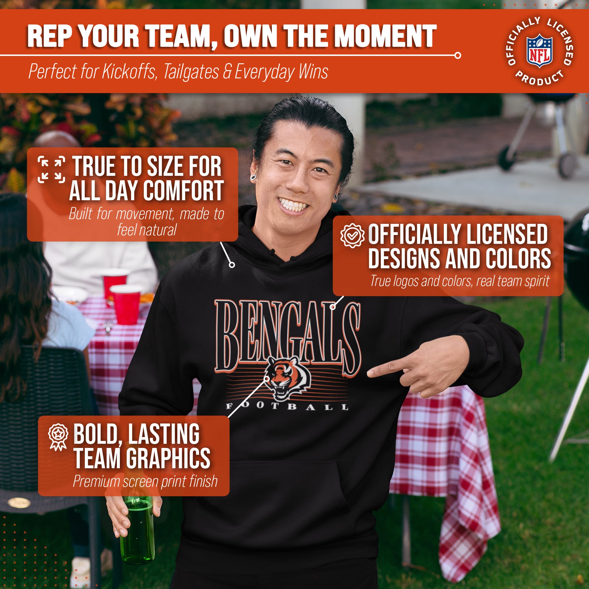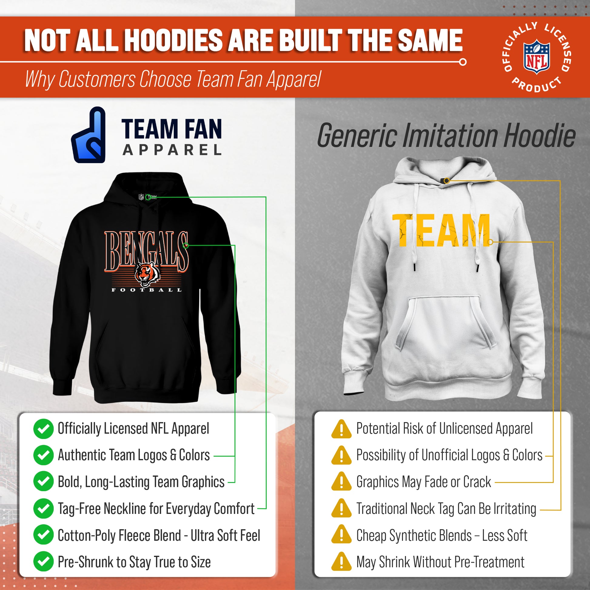Get Ready to Show Your Team Spirit in the Most Comfortable Way Possible with Team Fan Apparel's Cincinnati Bengals NFL Overtime Blueprint Hooded Sweatshirt!  Made with ultra-soft fleece material, this hooded sweatshirt is perfect for game days or just lounging around the house. With its unique design and performance material, you can proudly represent your favorite team wherever you go.   Not only is it officially licensed by the NFL, but it also comes in adult unisex sizing so both men and women can rock their team pride. The throwback outline design adds a retro touch to your gameday attire, making you stand out from the crowd.  So why settle for a basic sweatshirt when you can show off your style and support your team at the same time? Grab your NFL Overtime Blueprint Hooded Sweatshirt from Team Fan Apparel today and get ready to cheer on your Bengals in ultimate comfort!