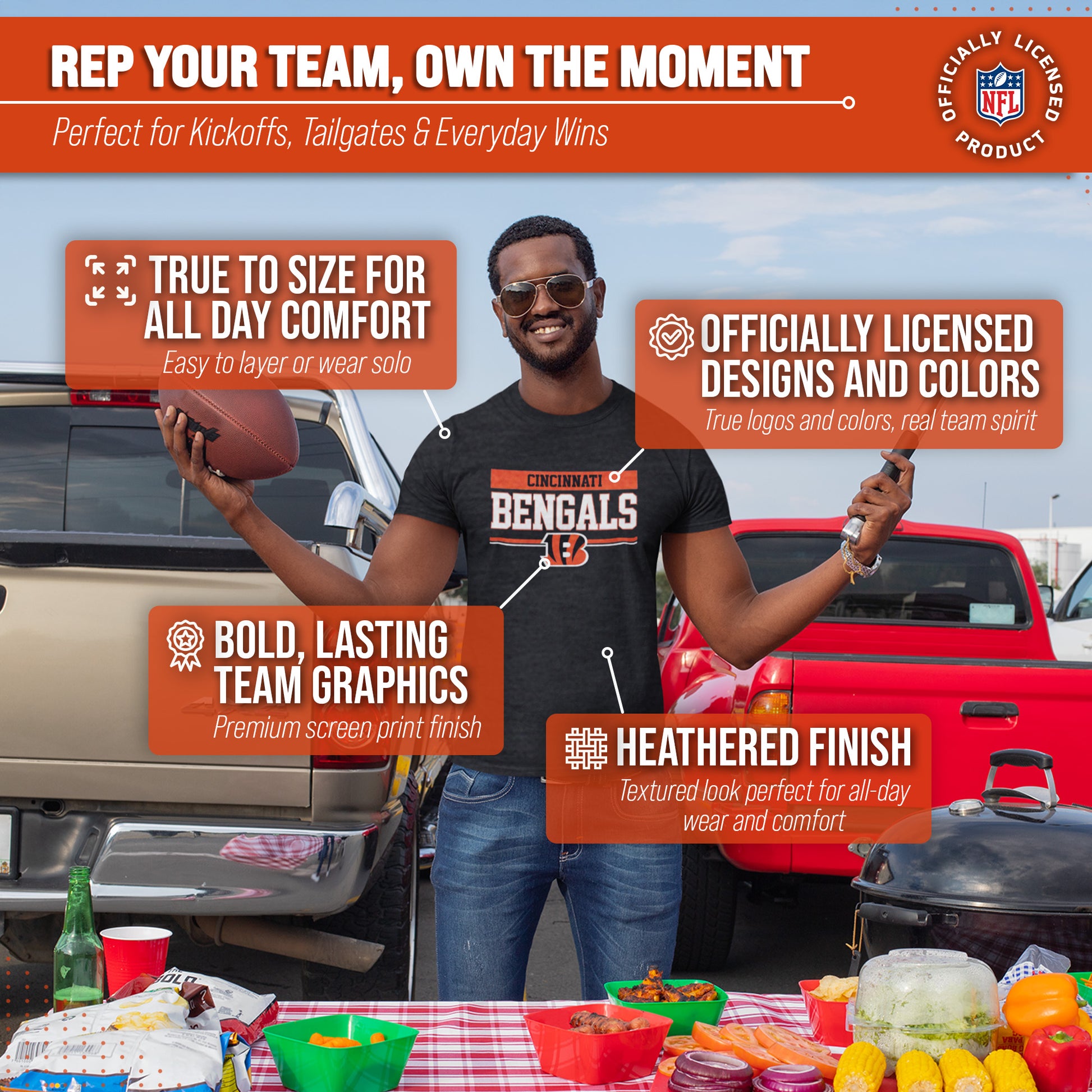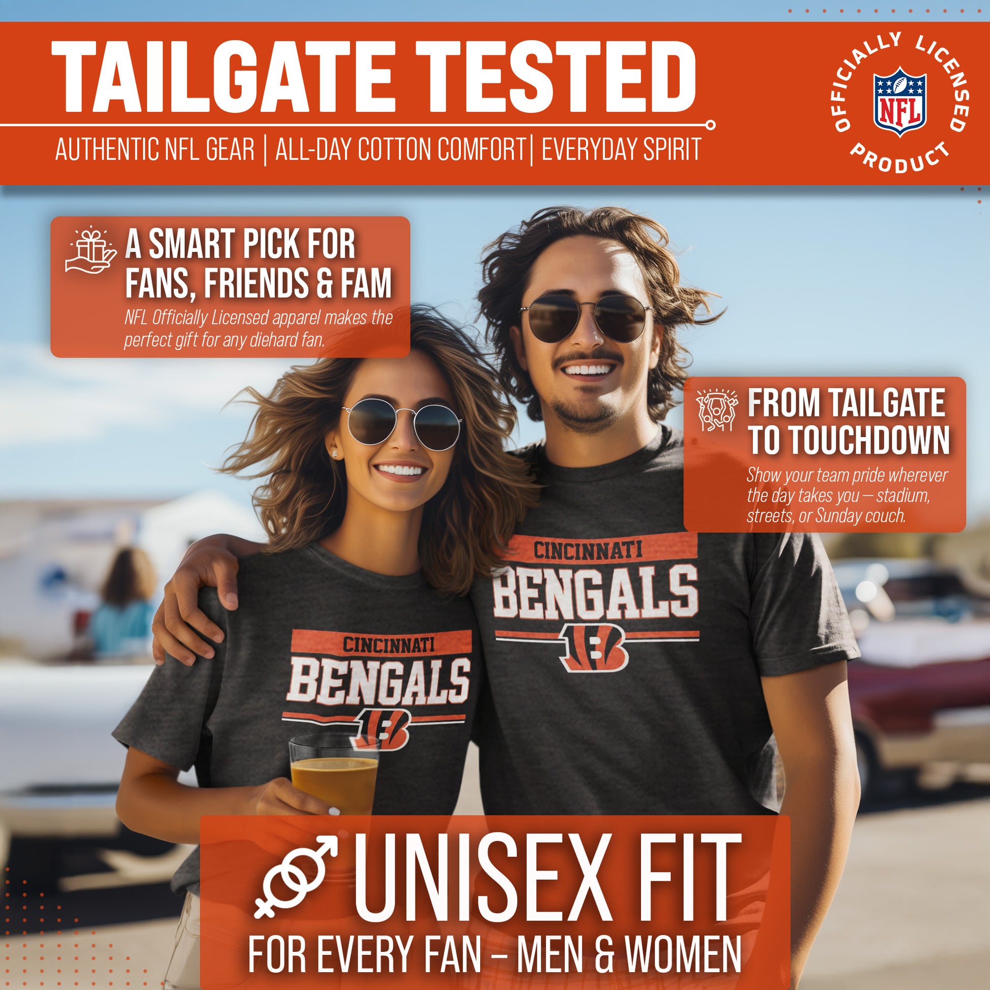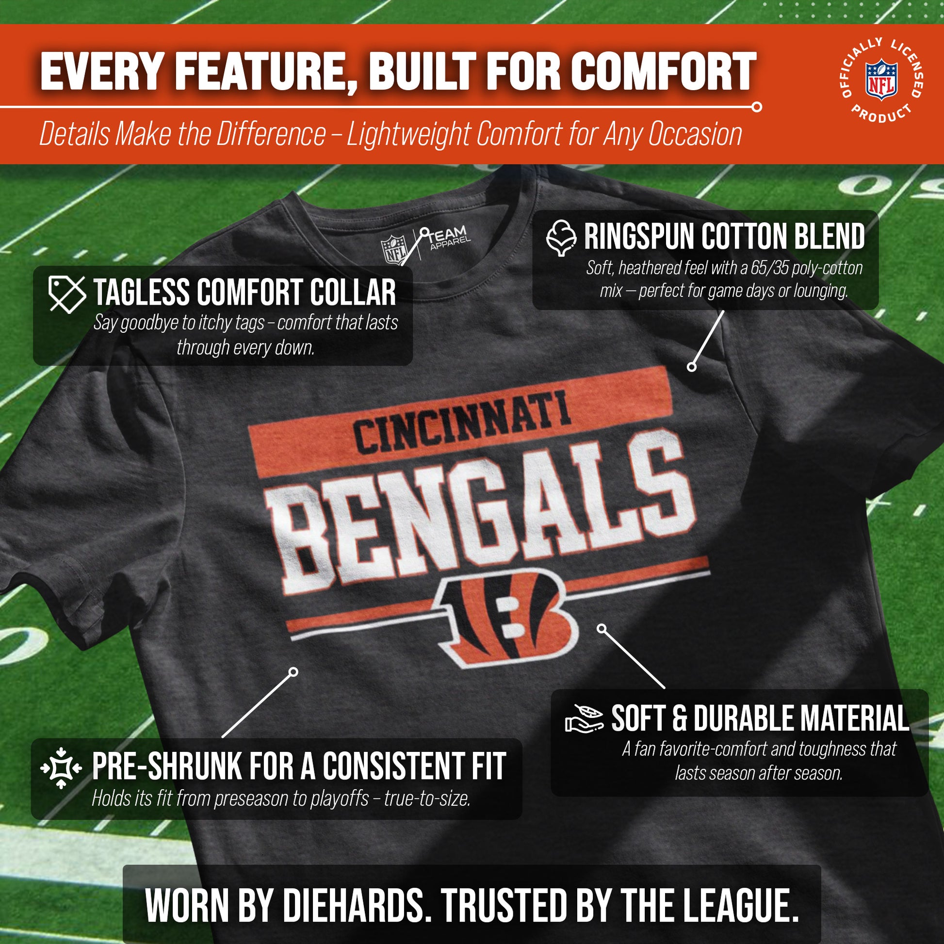 Heather/charcoal wordmark womens and mens Cincinnati Bengals t shirts are the ultimate light, soft, and comfortable tee. These Cincinnati Bengals tshirts are the most versatile football apparel. Let us help you celebrate and showcase team pride with our durable and lightweight Cincinnati Bengals t shirts for men and women. This tee features a quality, screen printed wordmark that will last wear after wear. The official wordmark design gives you the look of a loyal and seasoned sports fan and the unique heather, dual-blended material gives a trendy, distressed look without that heavy printed feel. Made of 50% ringspun cotton and 50% polyester, the dual blend material is extremely soft, smooth and comfortable. These Cincinnati Bengals shirts for men and women comes without a tag, so you'll never feel annoyed or irritated by those pesky neck tags again!     This tee is essential apparel for any football fan. This classic Cincinnati Bengals t shirt will stand out and is perfect for the gameday tailgate, hanging out with friends, or wearing to the gym. The unisex fit and design makes it ideal for both men and women! Quality [team short] t shirt makes the best birthday, Christmas, or graduation gifts for [team short] fans; Our Cincinnati Bengals shirts run true to size. All quality logos and colors are officially licensed and are of the highest quality. Show off your team pride with this official short sleeve Cincinnati Bengals t shirt!