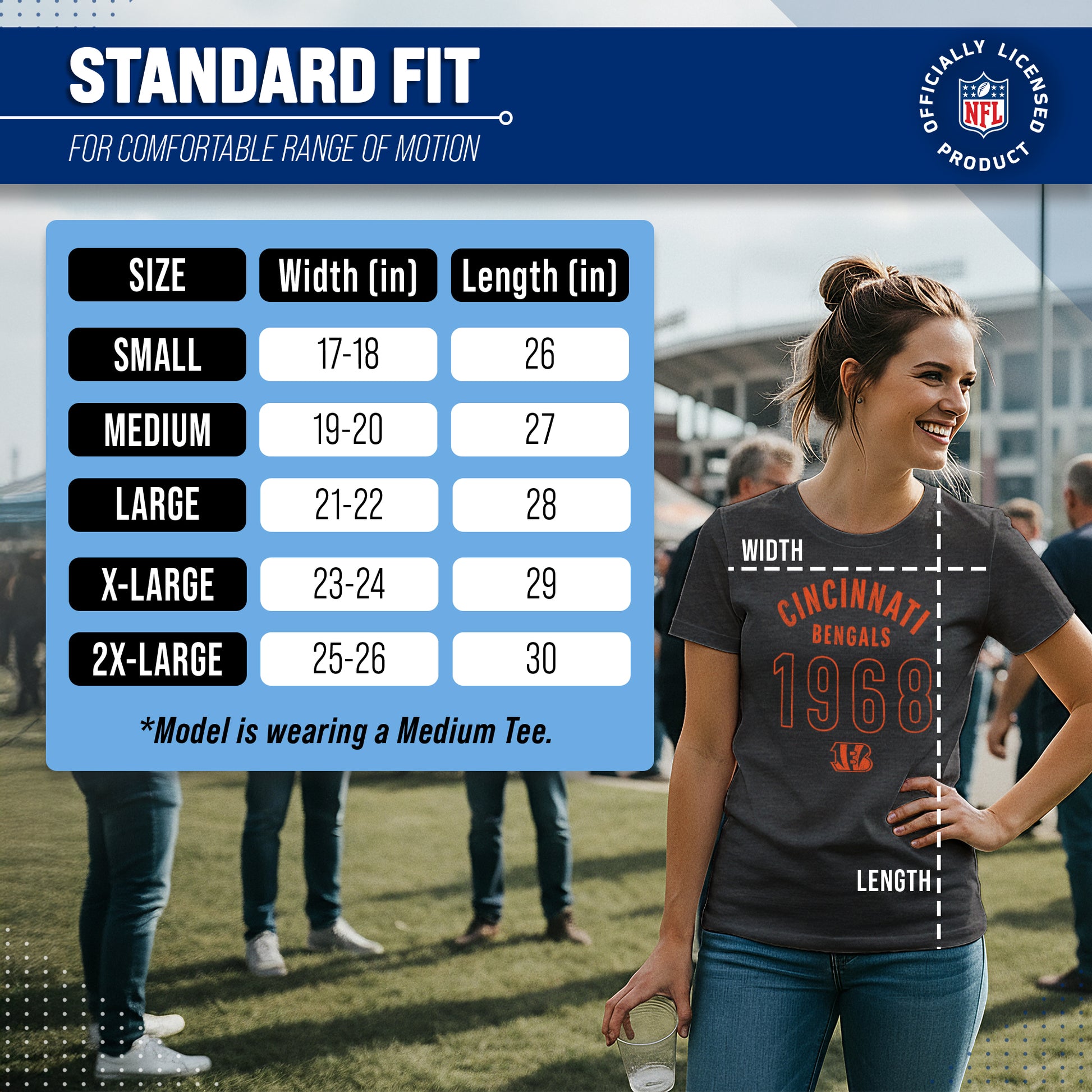 Calling all ladies! Get ready to rock game day with the Women's Team Fan Apparel Big Date T-Shirt! This comfortable and stylish Cincinnati Bengals womens tee is perfect for any female football fan, whether you're cheering on your favorite team at the stadium or watching from home. Made from a super soft cotton fabric , this shirt will keep you cool and comfortable all game long.  The text, logo and official team color adds a touch of retro flair, while the tag-less design ensures itch-free wear. Whether you're a die-hard fan or just love a good simple look, this shirt is perfect for showing off your team spirit. Available in a wide range of women's sizes, it's suitable for all shapes and sizes!  So grab your girlfriends and get ready to cheer on your team in style with the Women's Team Fan Apparel Big Date T-Shirt!