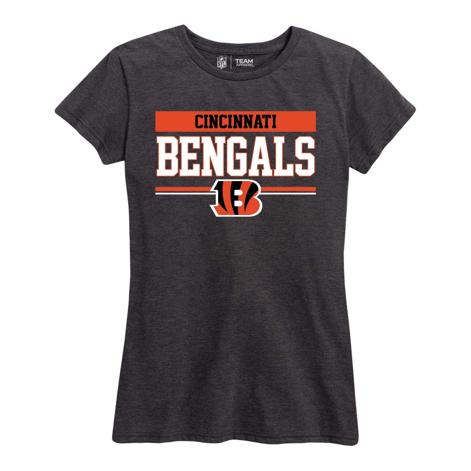 Our officially licensed womens Cincinnati shirt is super comfortable, runs true to size, and is great for showing off your Cincinnati Bengals pride.     The high-quality thermal printed logo will look fresh after years of wear, making it a great alternative to your womens Cincinnati Bengals jersey. Our charcoal t-shirt has a relaxed yet contoured fit for a casual yet feminine look. The short sleeve shirt is perfect with shorts for tailgates in warmer months, or with jeans or leggings and a sweater during colder months. Available in plus sizes, our Cincinnati shirts for women plus size or straight size will make anyone feel comfortable enough to show off their love for the Cincinnati Bengals.          If you're looking to give team t shirts for women as a gifts, our womens charcoal tshirt is the Bengals shirt women will love. Officially licensed to ensure no counterfeit designs or colors, our Cincinnati Bengals womens shirts are great for superfans. 100% ringspun and made from a blend of cotton and polyester, designed to keep you cool and comfortable all year long. The womens gameday football t shirt will definitely become one of your favorite tops.